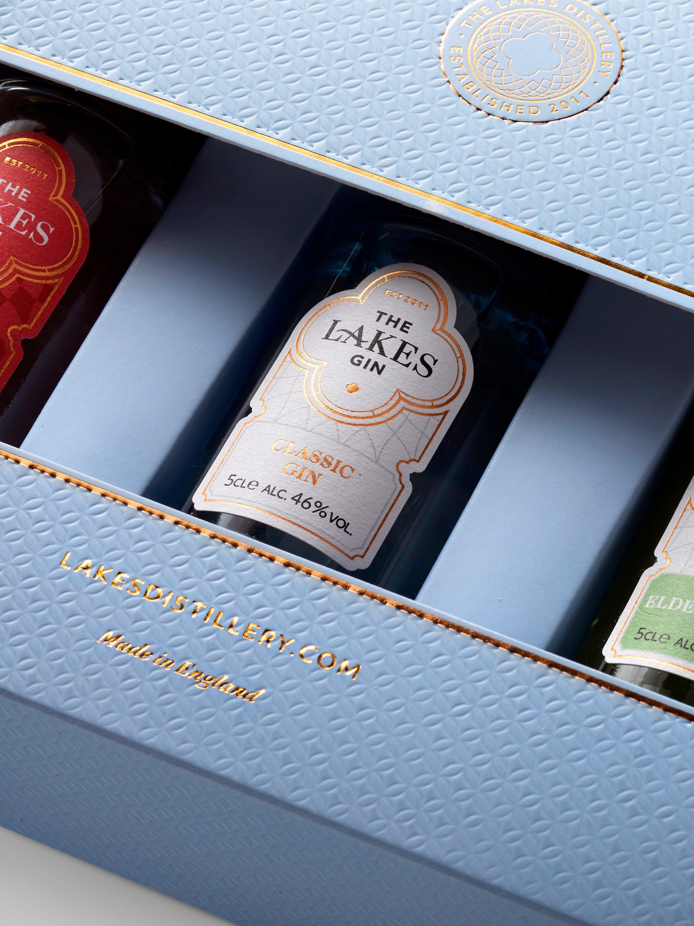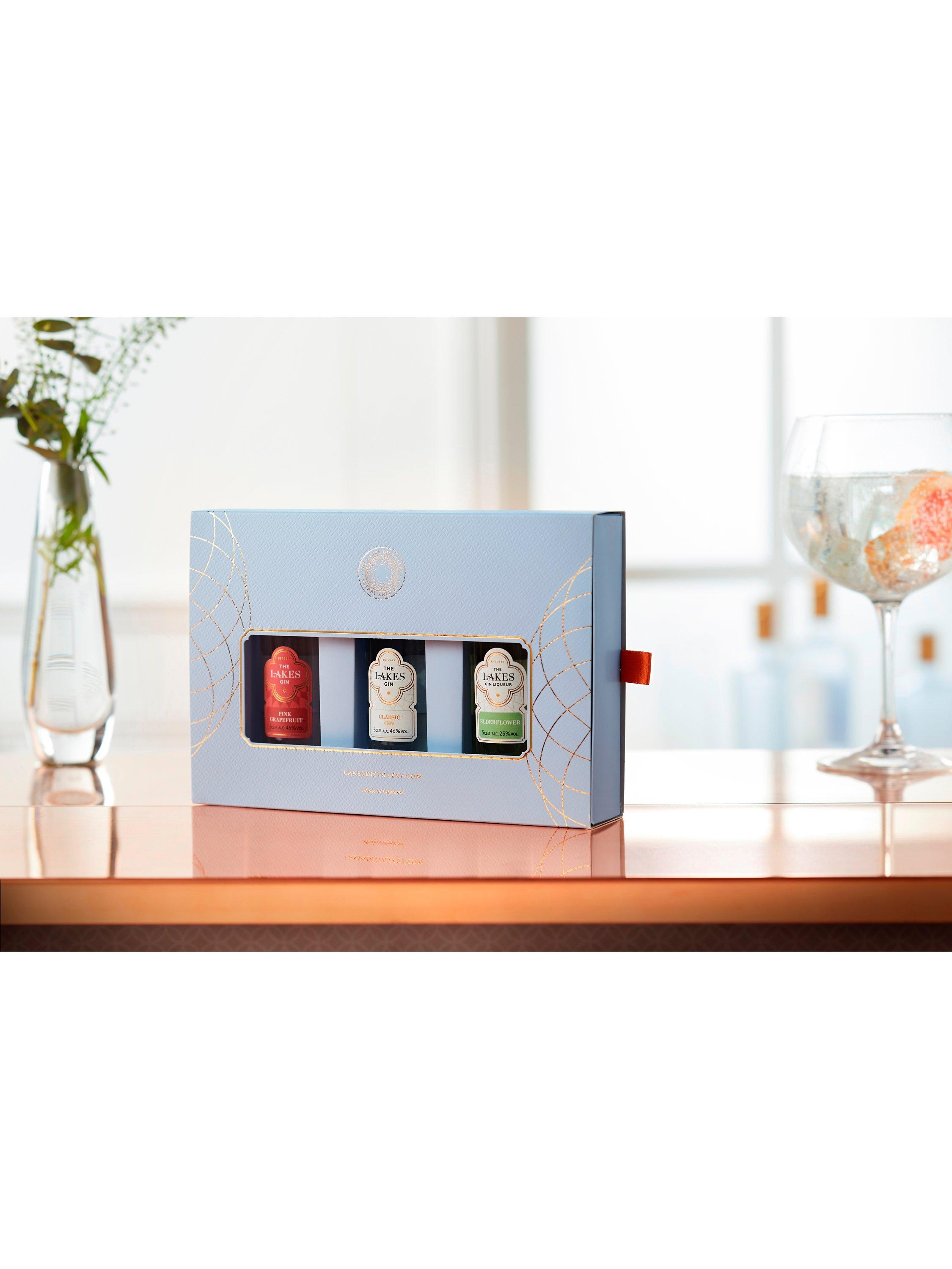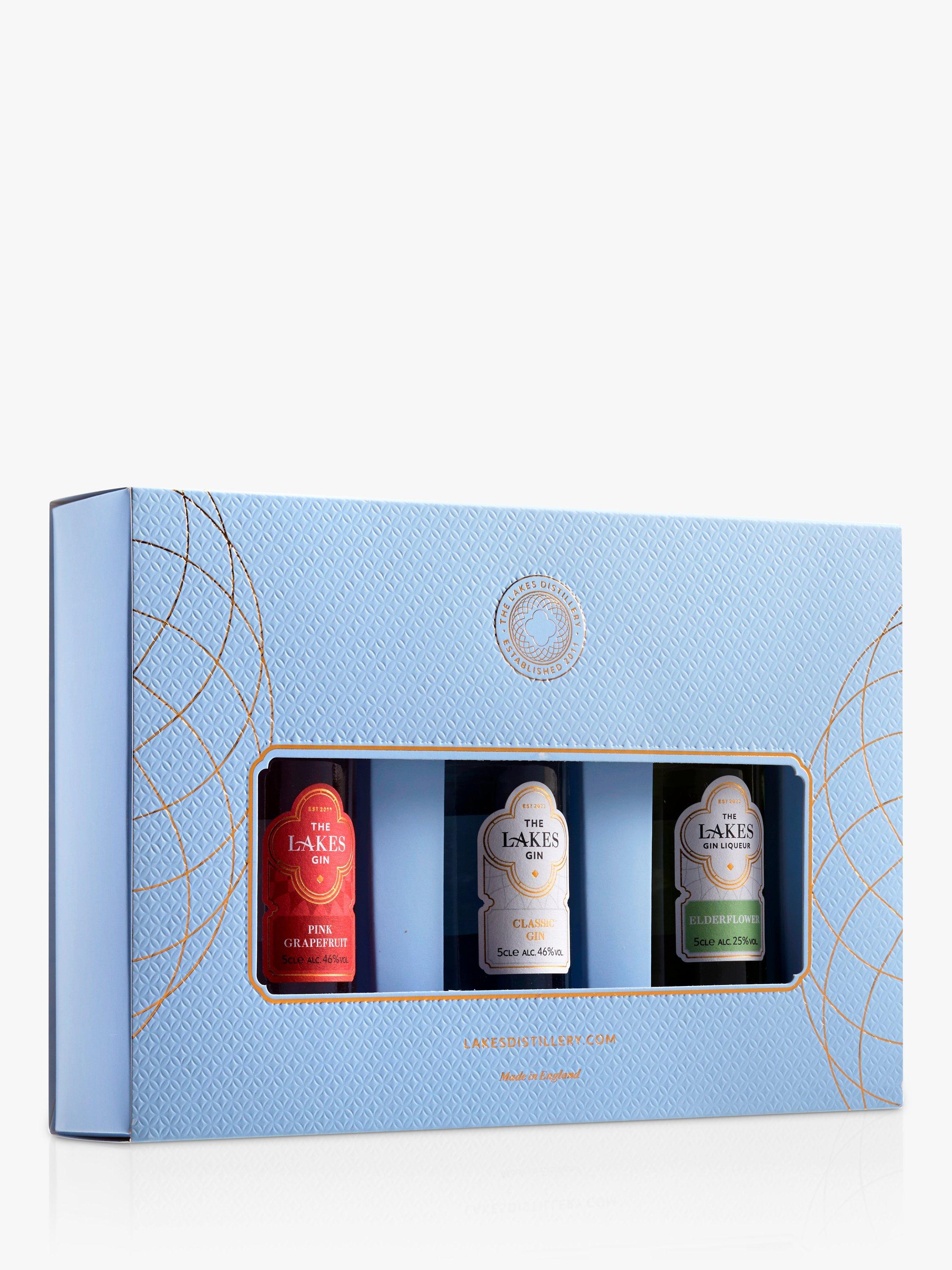 This mini gin gift box contains three 5cl miniatures; The Lakes Gin, The Lakes Pink Grapefruit Gin, and The Lakes Elderflower Gin Liqueur, presented in a gift set.