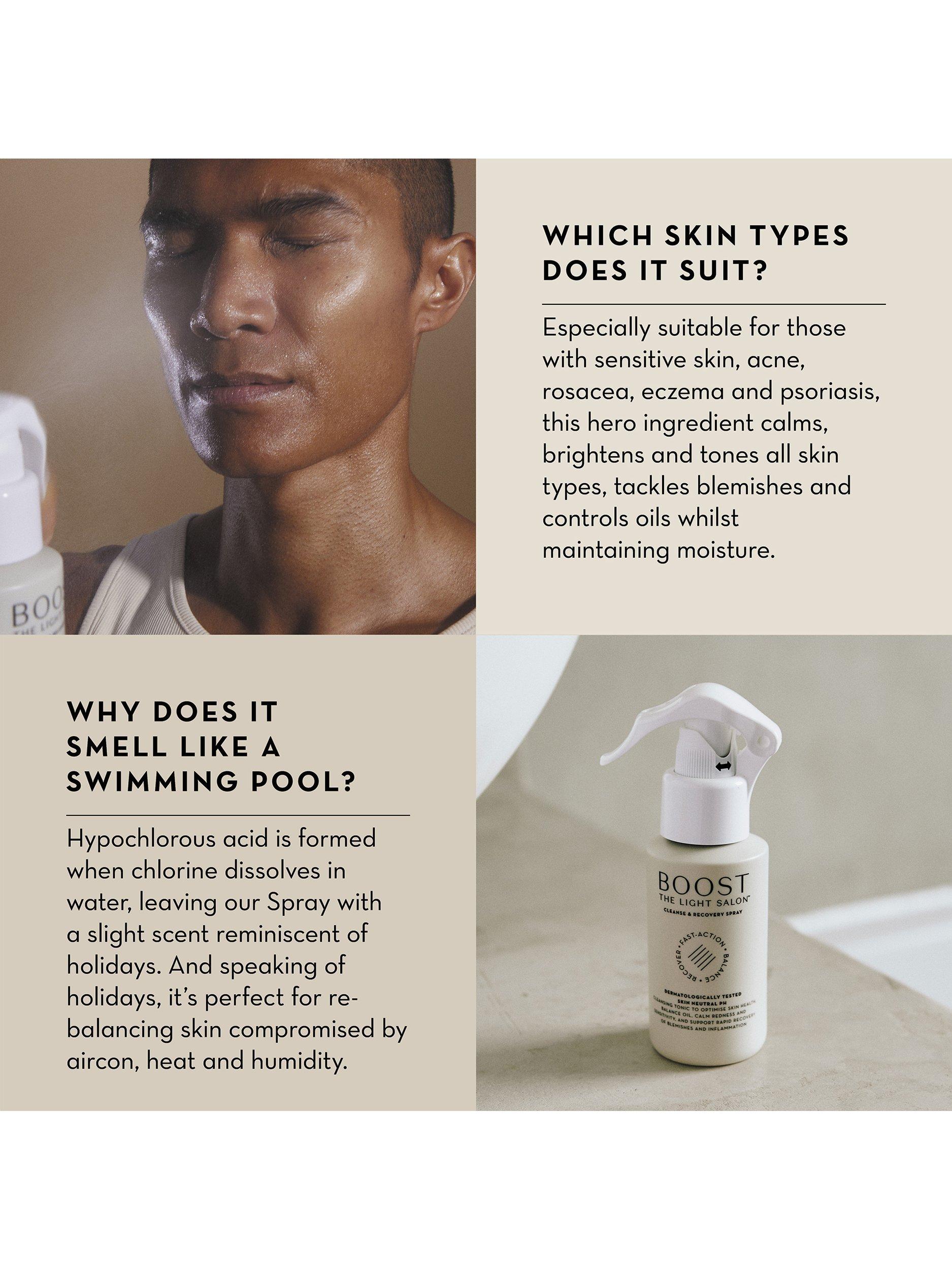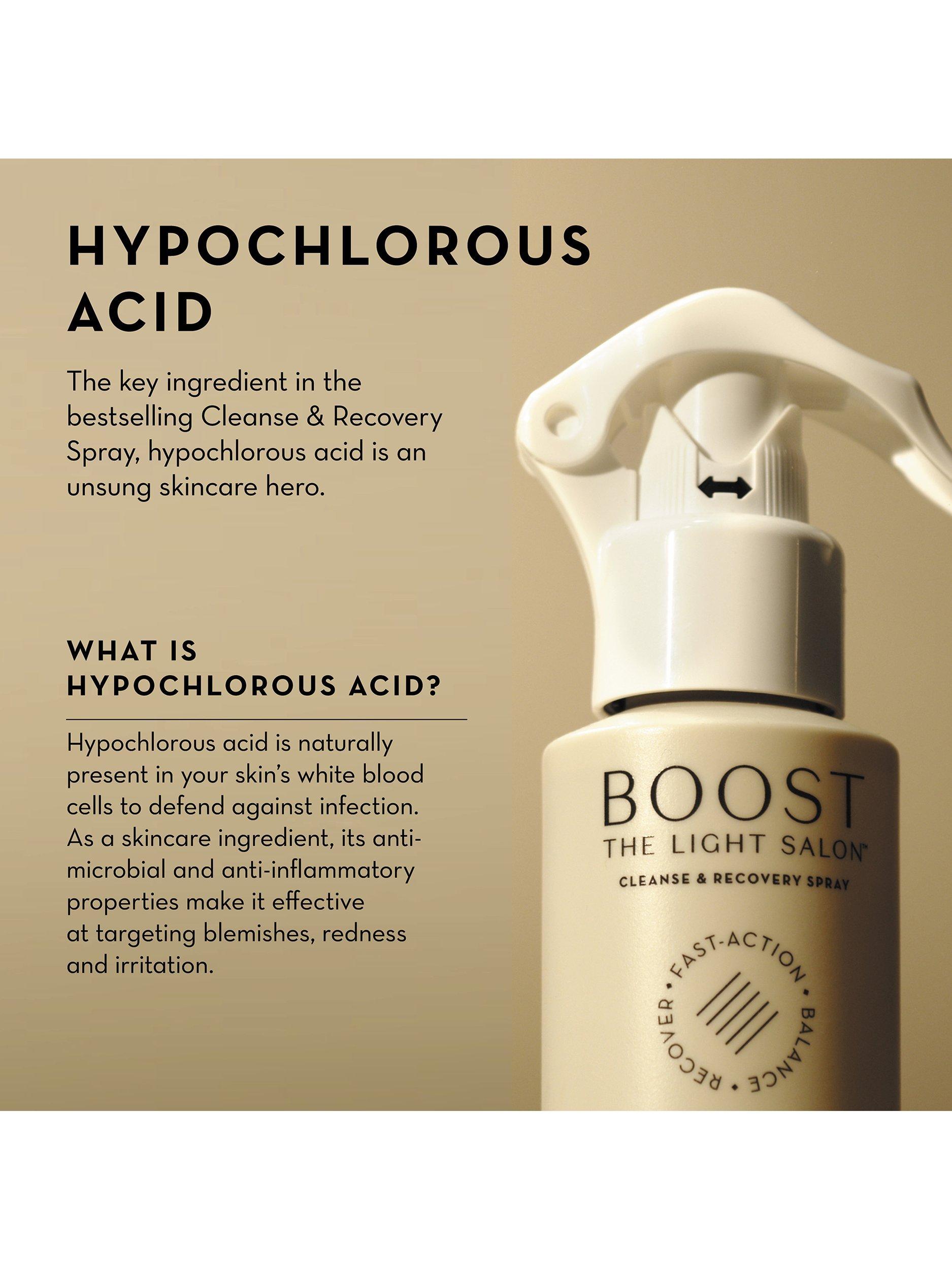 - Hypochlorous provides highly effective cleansing with antimicrobial protection. However, unlike most antimicrobials it has a skin neutral pH, is non-irritant, non-sensitising and non-cytotoxic even to regrowing skin cells. Cleanse and Recovery Spray will calm and reduce redness and blemishes, to reveal a brighter more even toned complexion.Aqua, Caprylic/Capric Triglyceride, Glycerin, Cetearyl Alcohol, Cocamidopropyl Hydroxysultaine, Propanediol, Hydroxyethyl Acrylate/Sodium Acryloyldimethyl Taurate Copolymer, Cetearyl Glucoside, Argania Spinosa (Argan) Kernel Oil, Simmondsia Chinensis (Jojoba) Seed Oil, Maltodextrin, Xanthan Gum, Protease, Sodium Gluconate, Lipase, Butylene Glycol, Aloe Barbadensis Leaf Extract, Hibiscus Sabdariffa Flower Extract, Sodium Hyaluronate, Tetrasodium Glutamate Diacetate, Tocopheryl Acetate, Phenoxyethanol, Ethylhexylglycerin, Citrus Grandis (Grapefruit) Peel Oil, Citrus Limon (Lemon) Peel Oil, Citrus Aurantium Dulcis (Orange) Peel Oil