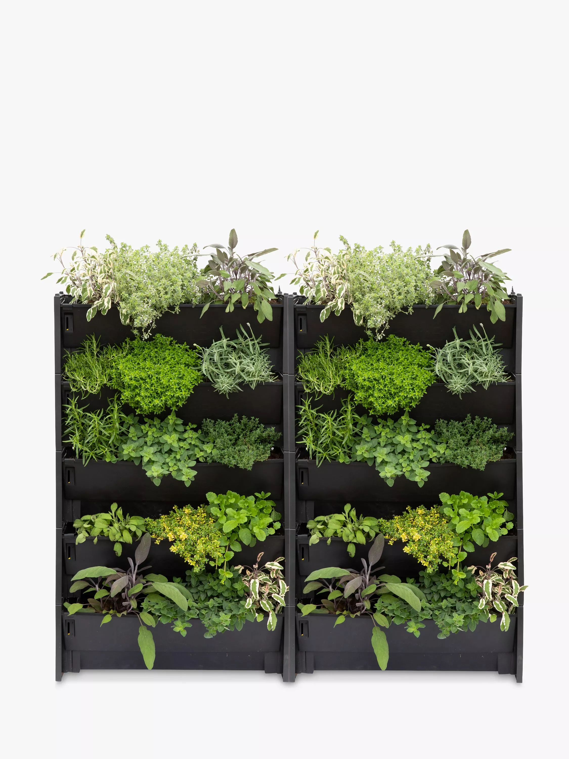 The Outdoor LIving Wall set of 10 troughs is perfect to transform a small outdoor space or make a feature out of a wall on your patio. Measuring 120cm across and 1 metre tall, this living wall will transform your space. Note these troughs clip and attach so could also be built to measure 2m tall and 60cm width. Build your own with our herb living wall package that includes everything you need to create an on-trend vertical garden. Easy to put together and sturdy, the plant boxes are made of recycled plastic. Each trough has a 1.8L water reservoir that’s enough for a week at least – so no daily watering is required.
