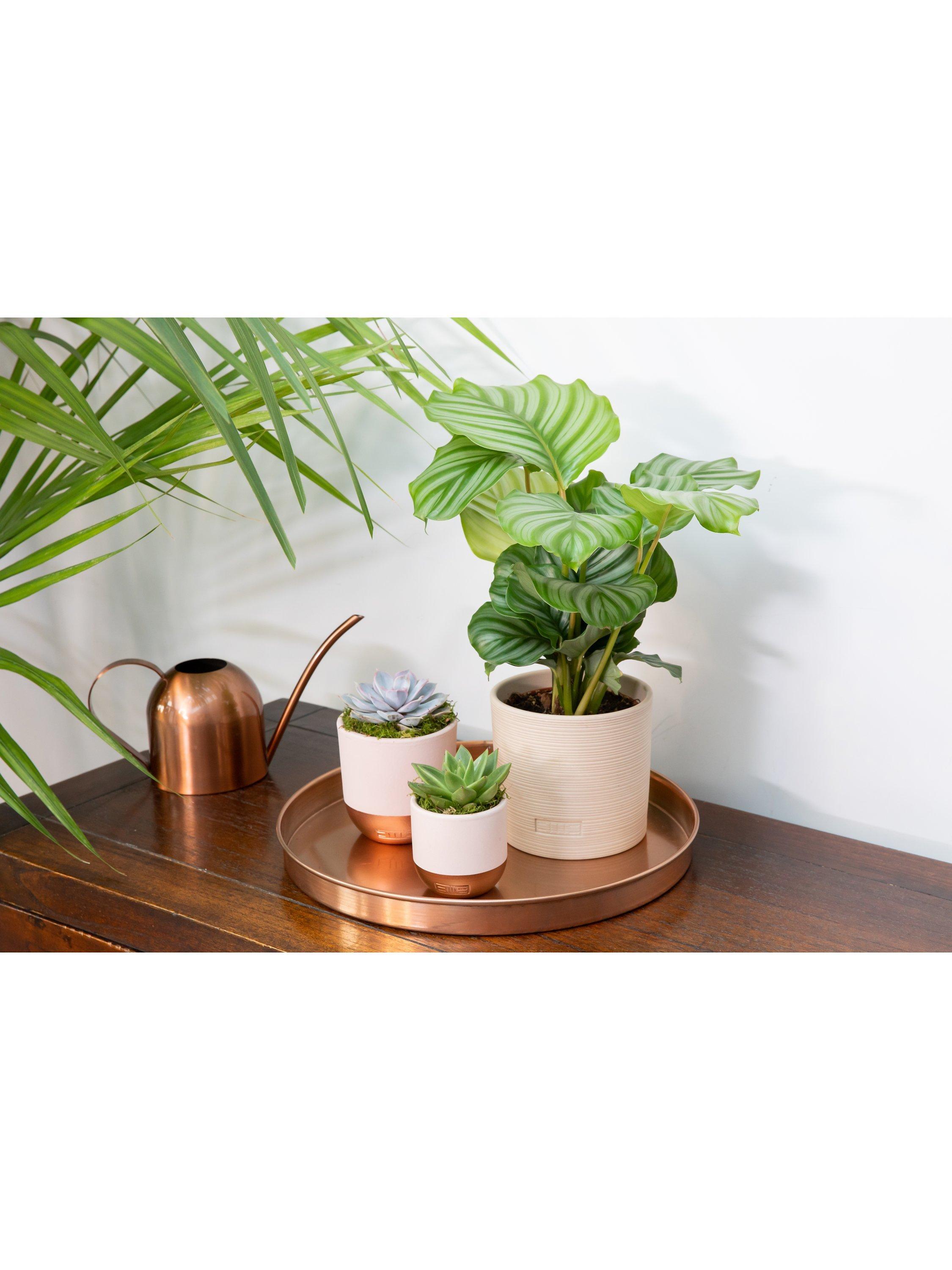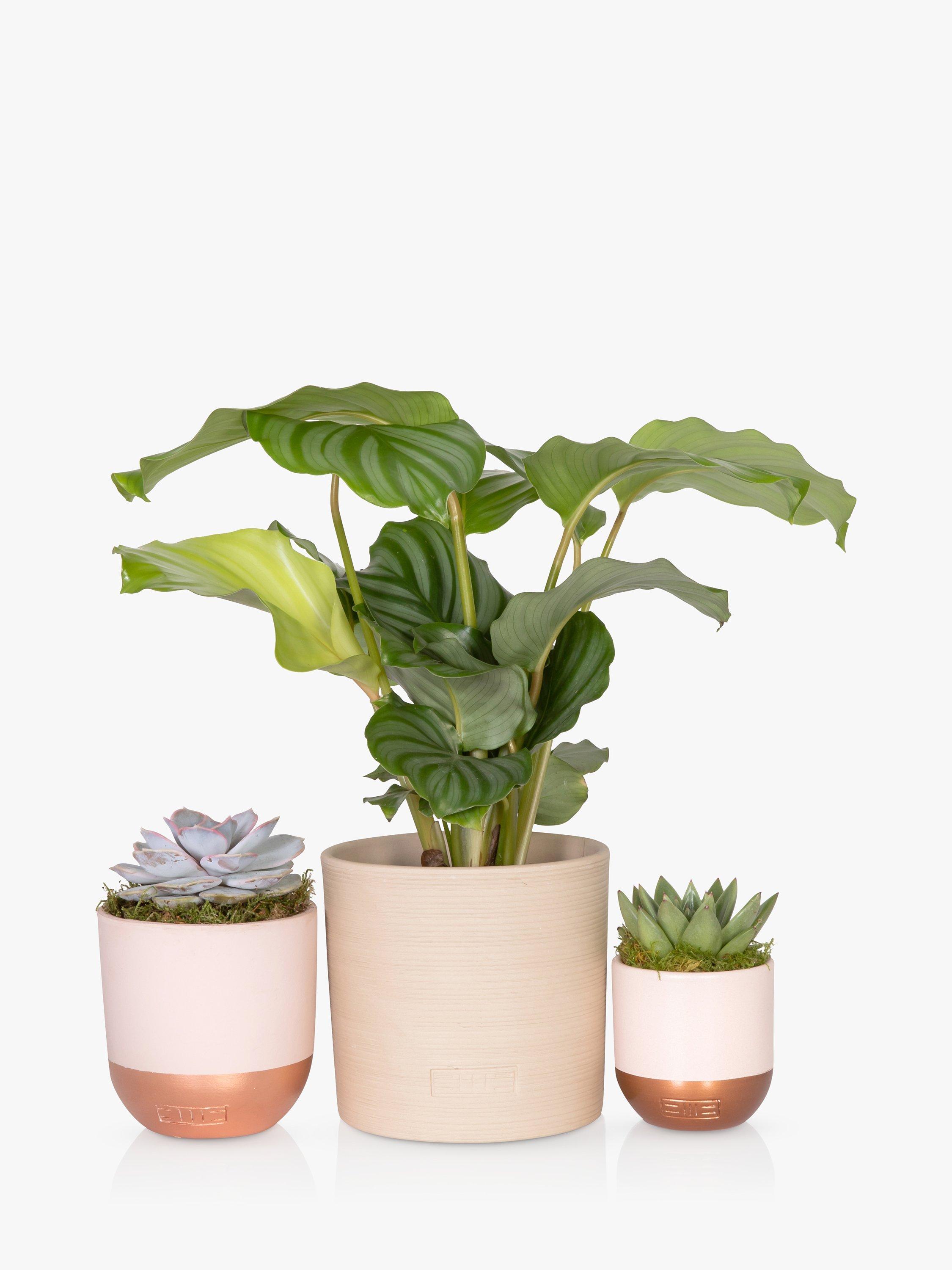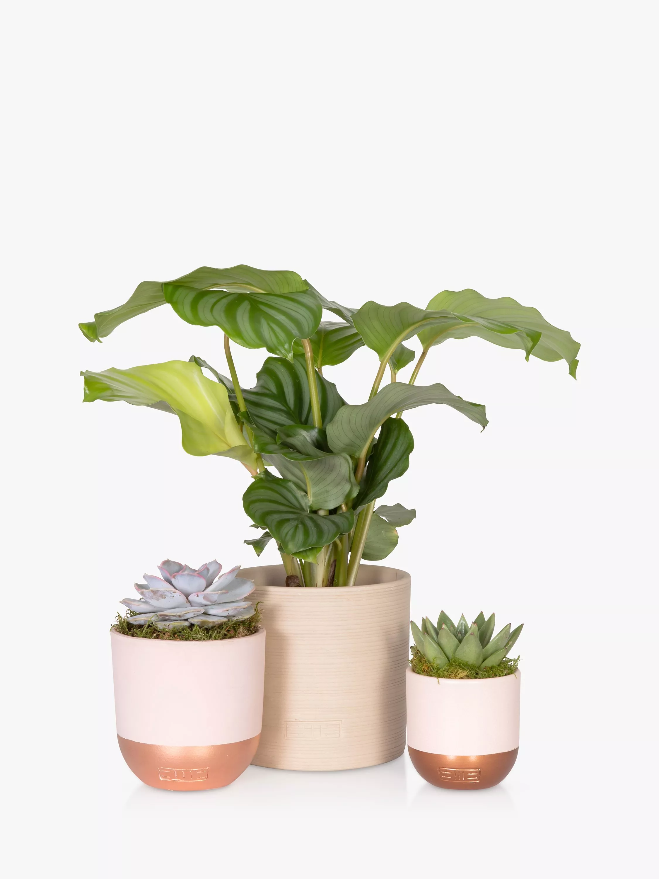 Why not add this Plant Gang to your home or gift them to your favourite plant-loving friend. This houseplant and succulent plant gang is a stunning selection. With the gorgeous green Calathea Orbifolia in The Little Botanical neutral stoneware ceramic and the small succulents in bespoke soft pink and copper pots, this is the perfect choice to send someone some green love.
