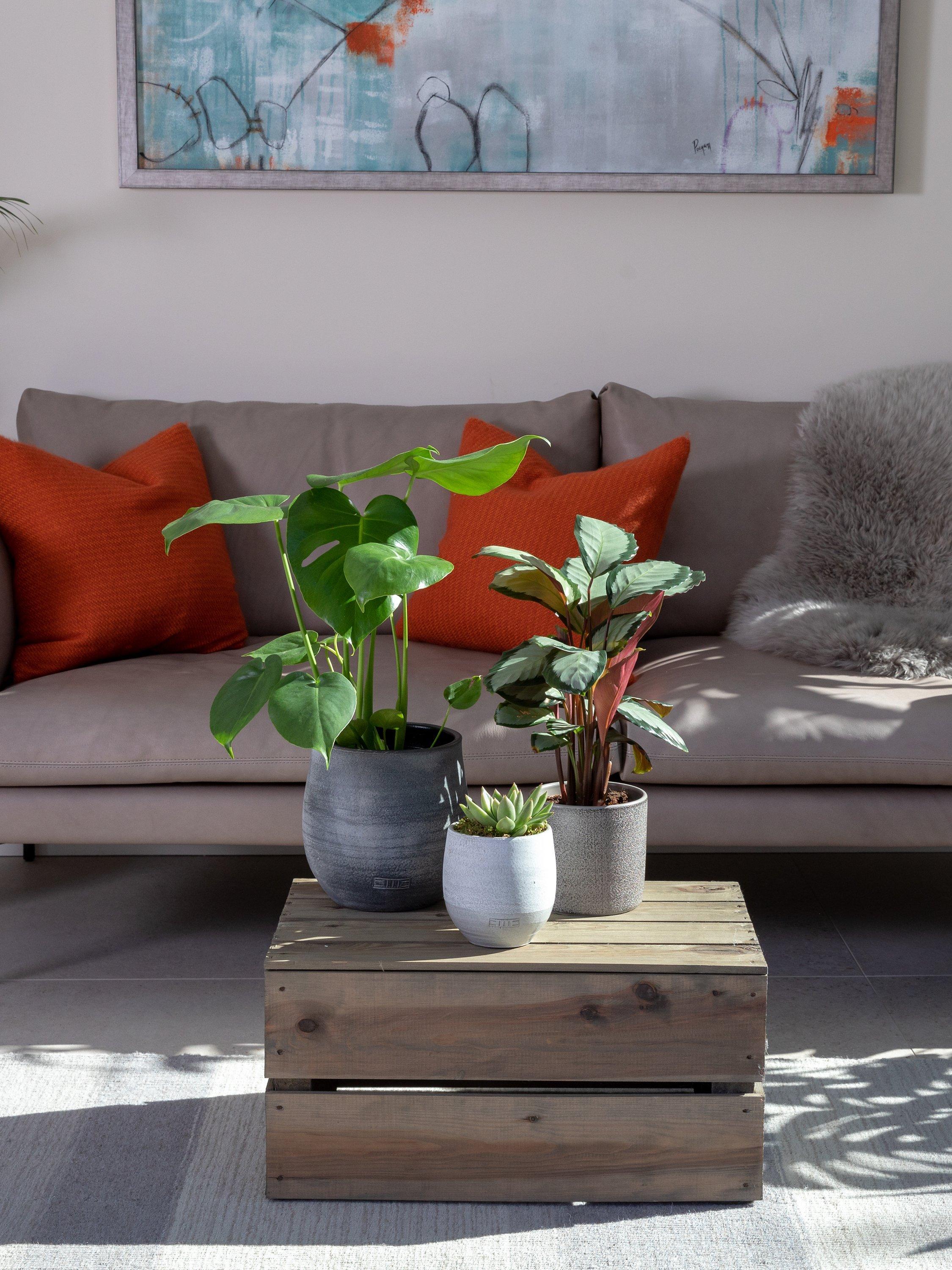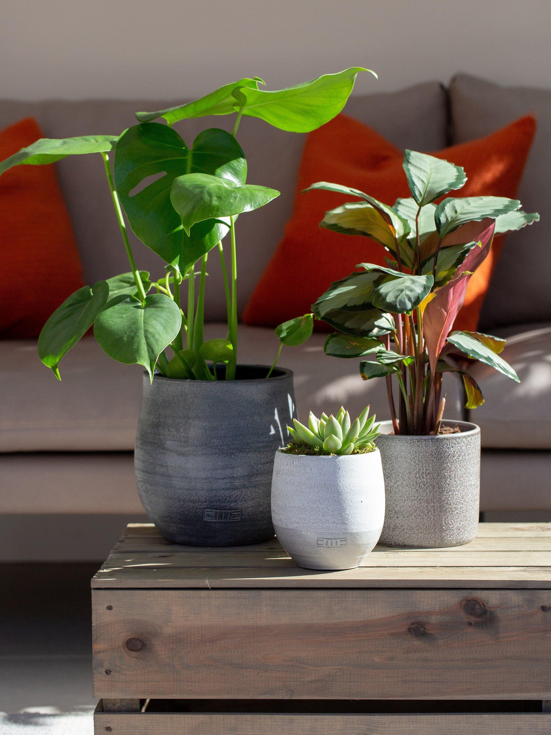 These bold, leafy plants & on trend succulents, in our classic grey ceramics, are selected to be easy to care for & will transform any space. Included in this plant gang is a Monstera, a Calathea and a Medium Miranda. Both the Monstera and Calathea green plants need watering once a week and the Miranda should be watered every 3-4 weeks. Note, don’t forget to occasionally dust the leaves of your green plants to let them absorb light. On the Miranda a few leaves closest to the soil may shrivel up and should be trimmed off to allow the plants to concentrate on new growth.