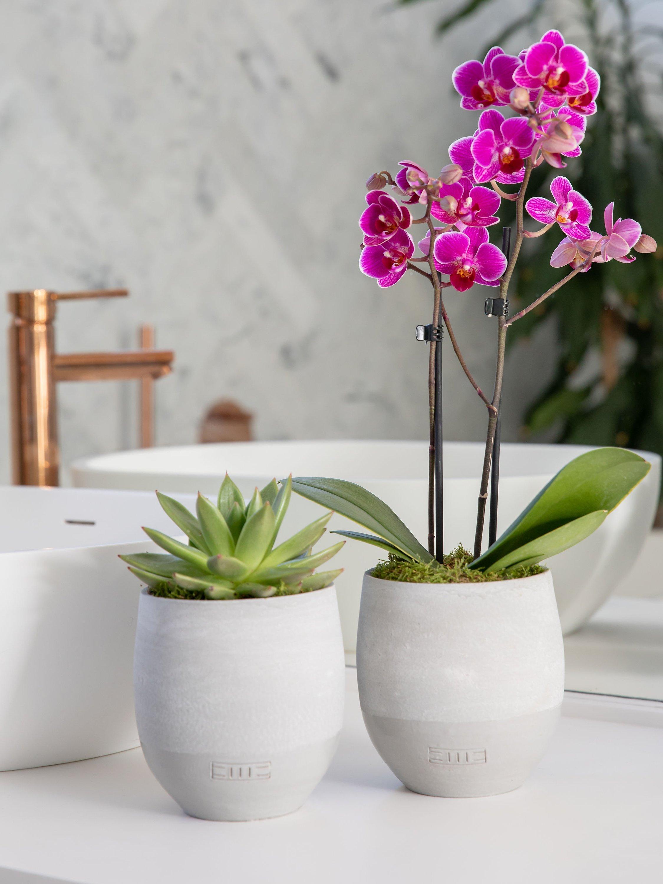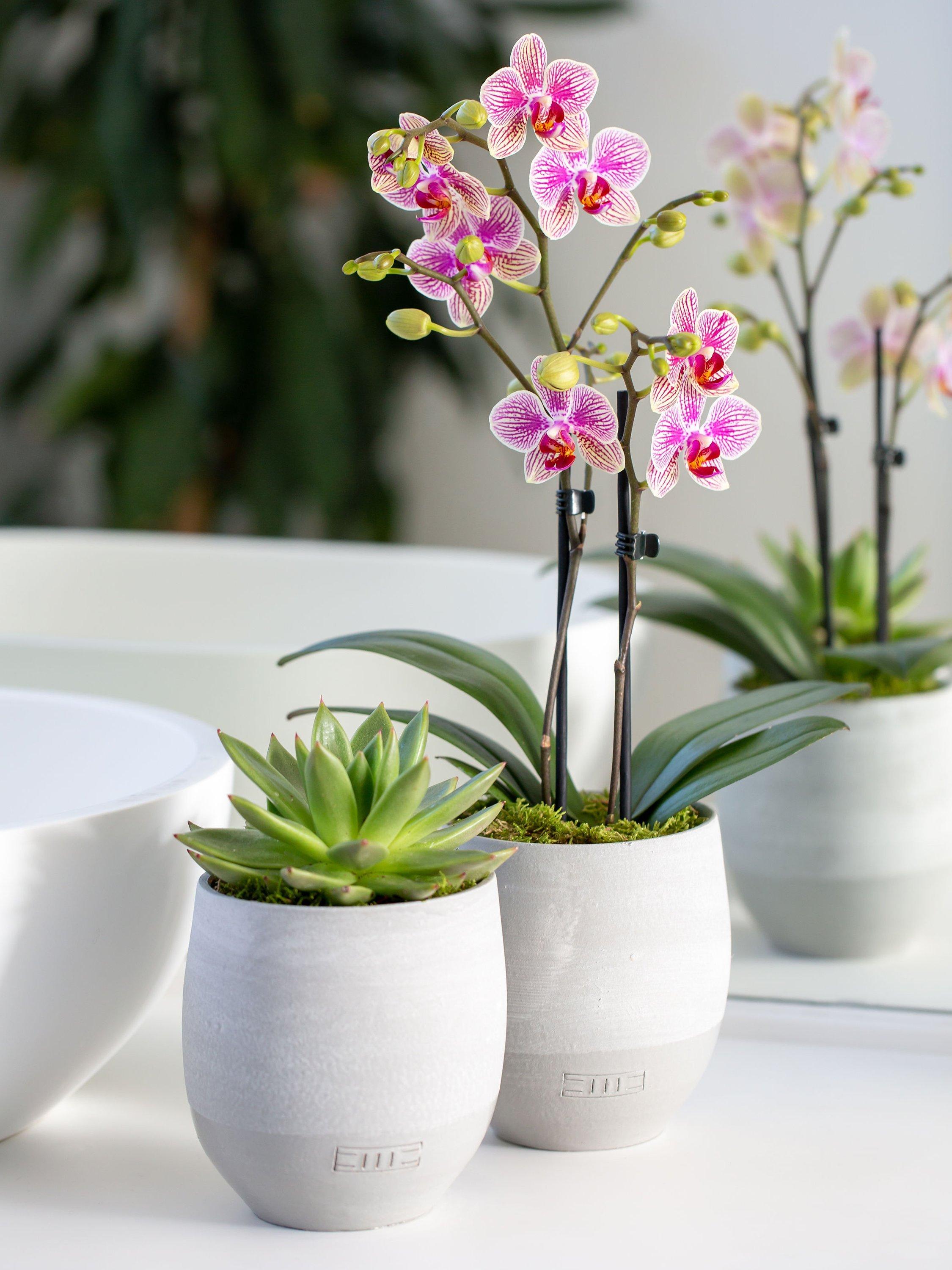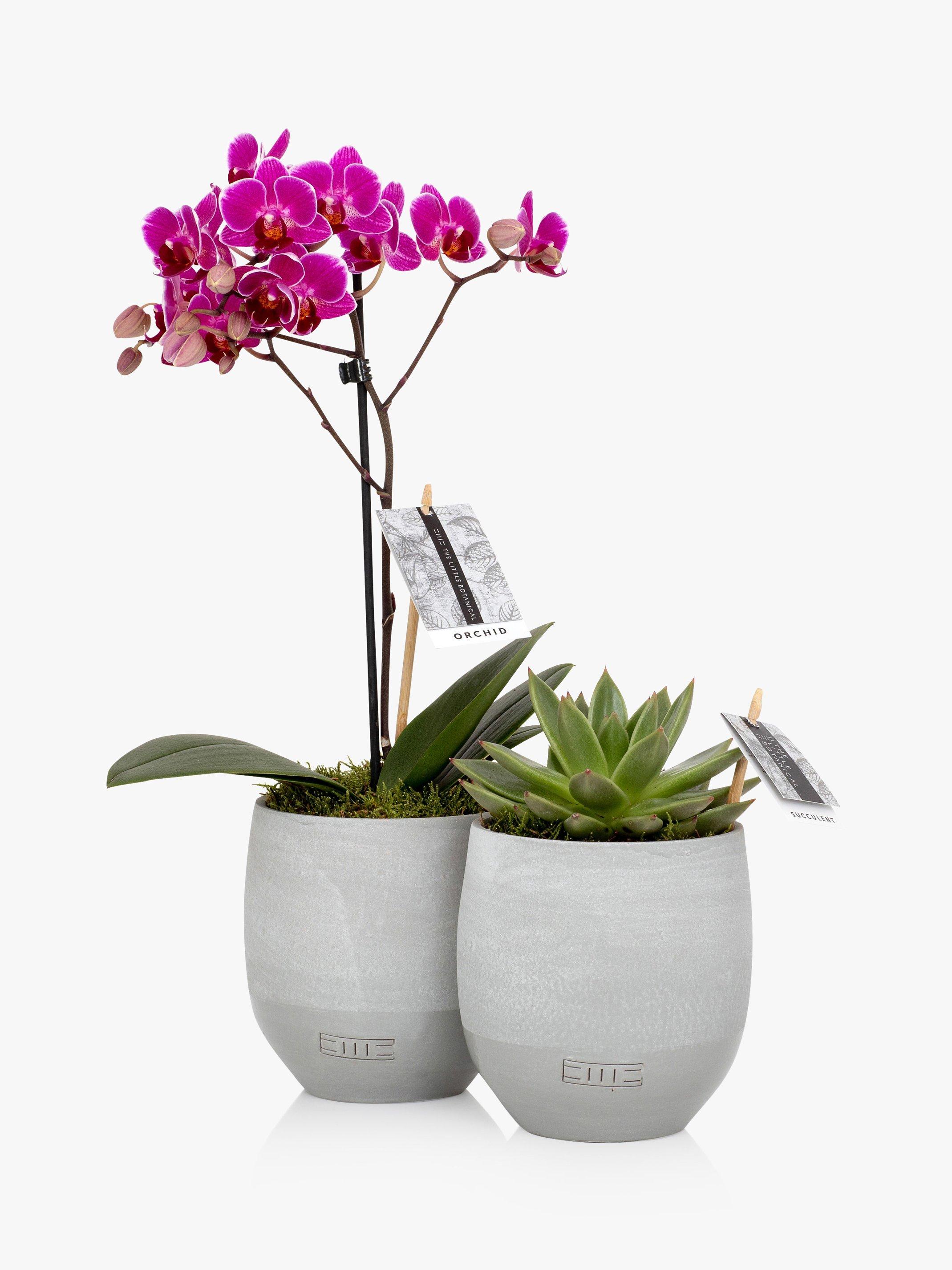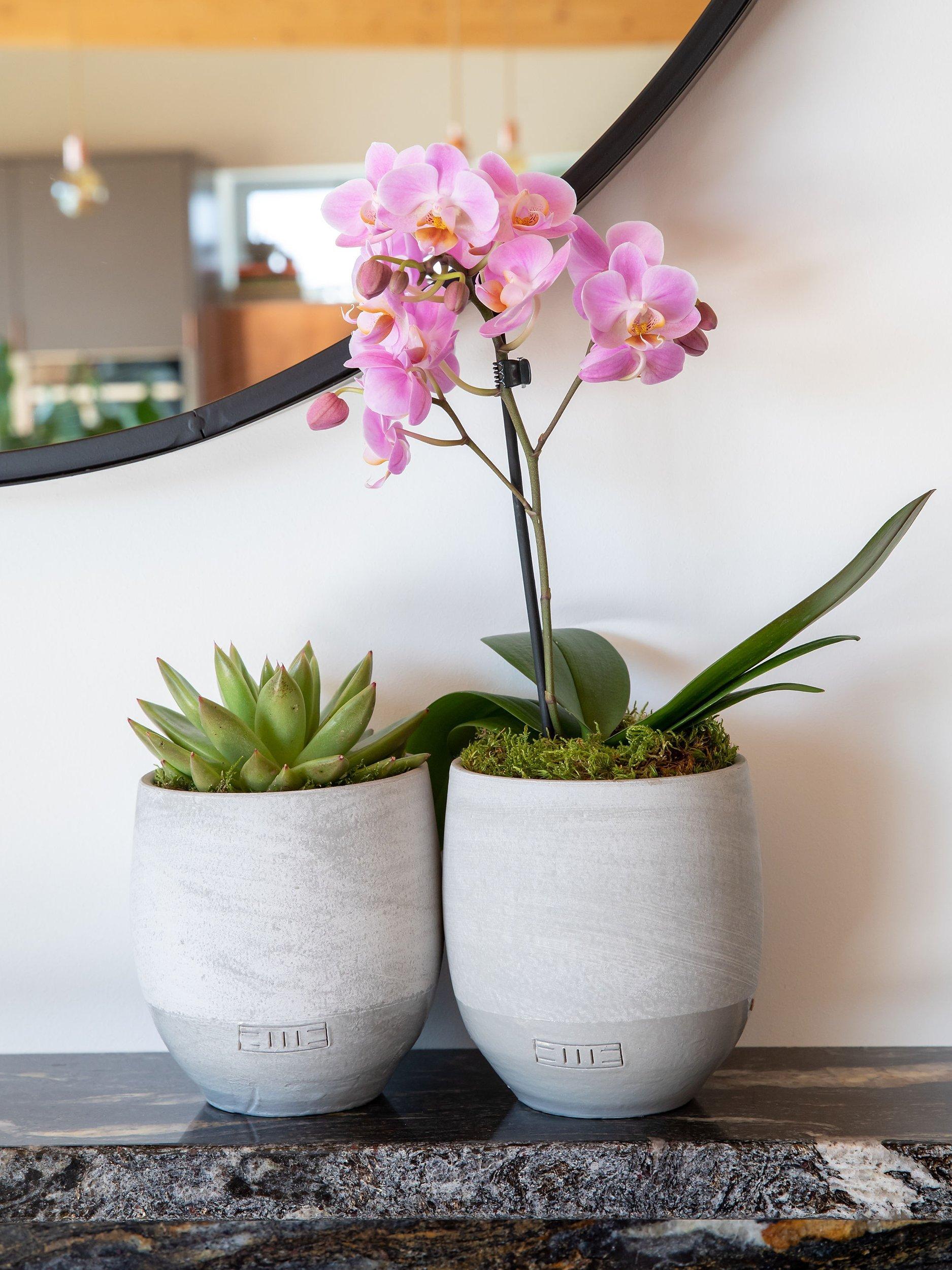This modern duo includes a phaelanopsis orchid and an echeveria miranda succulent potted in matching concrete pots.