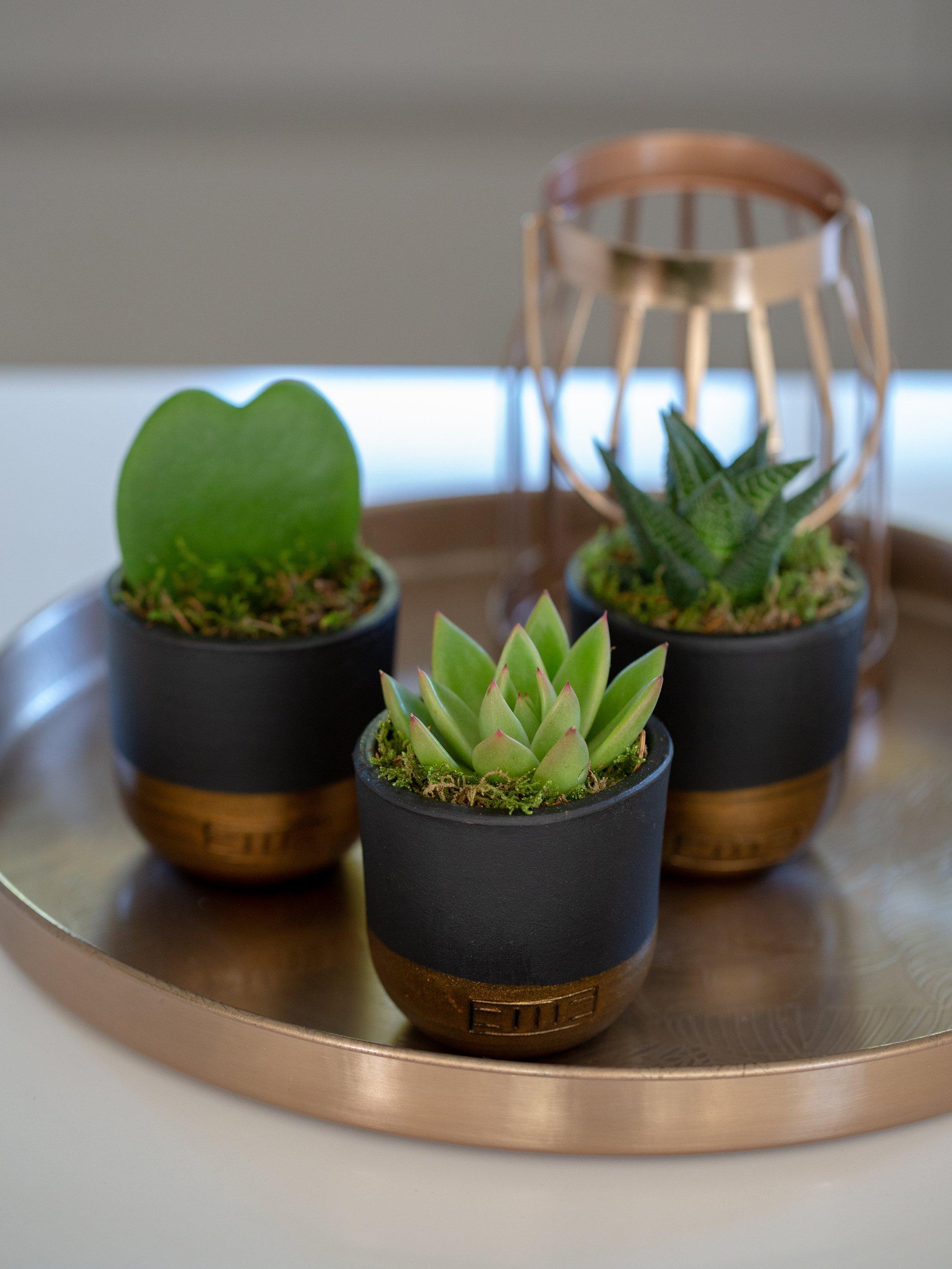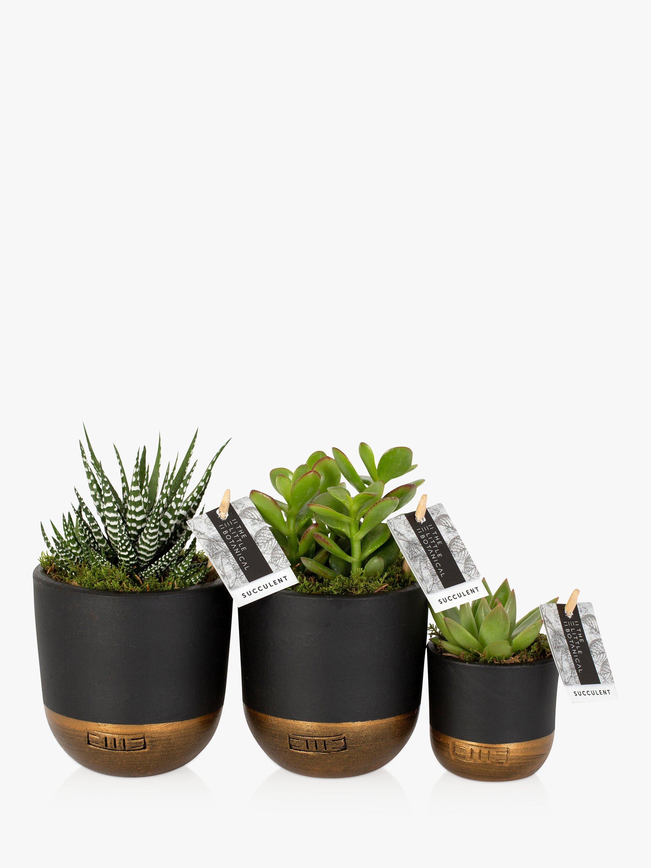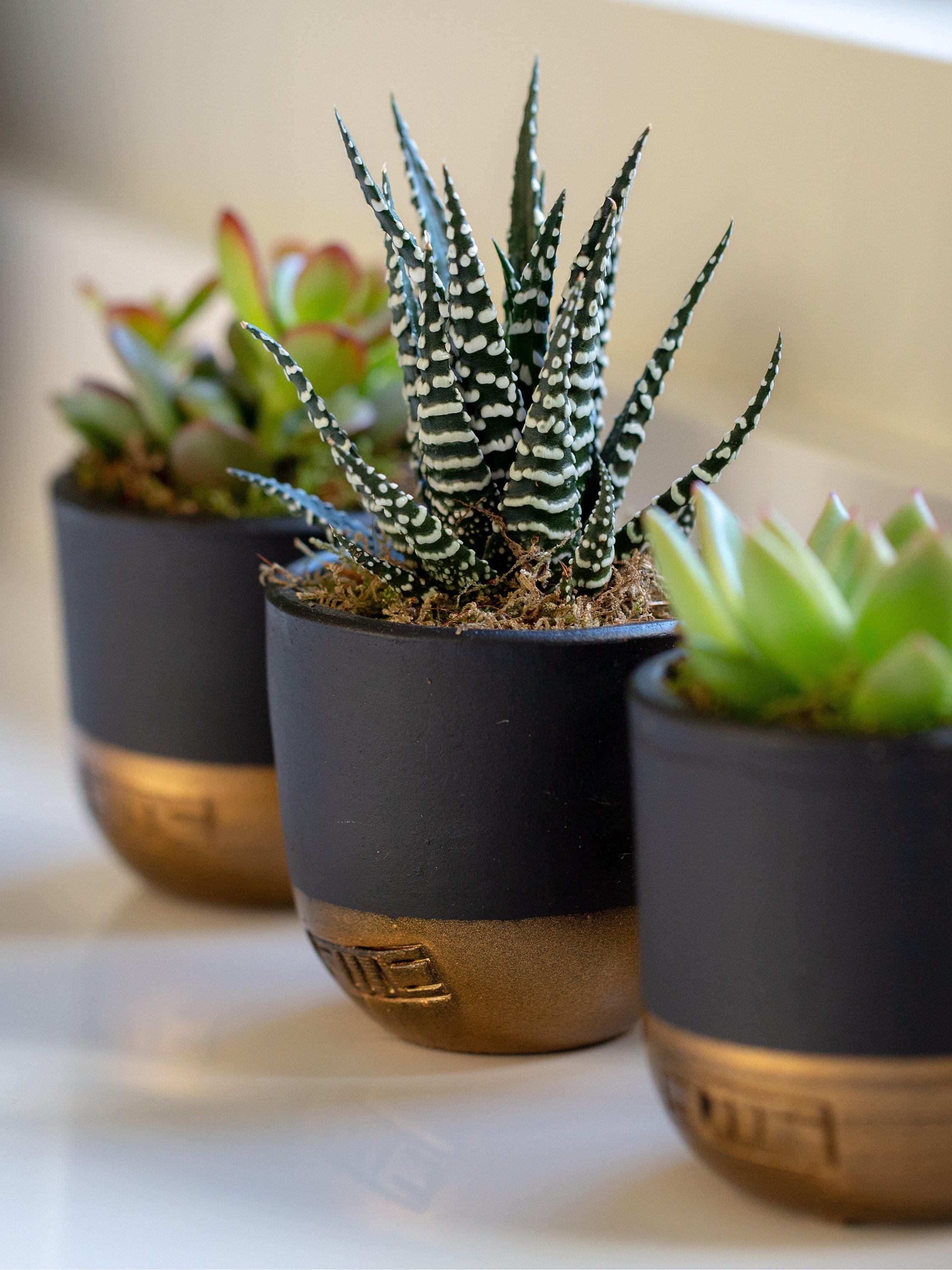 This gang of striking Succulents is a great way of introducing plants in to your home. Potted in our signature black and gold ceramics, these little plants look fabulous alone or grouped together on a mantelpiece or coffee table. Super stylish and easy to care for.