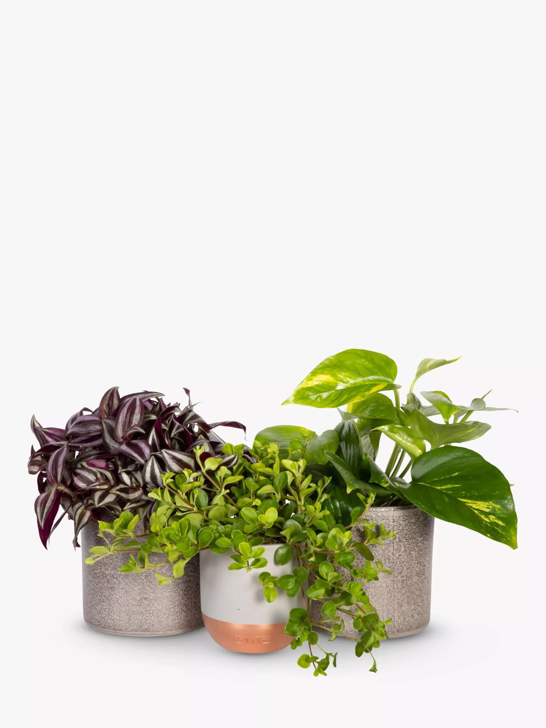 The Little Botanical Trailing Plants Bundle include 1 x Tradescantia Zebrina, 1 x Devil's Ivy and 1 x Medium Peperomia Rotundifolia. All plants arrive in the stunning ceramic pots.