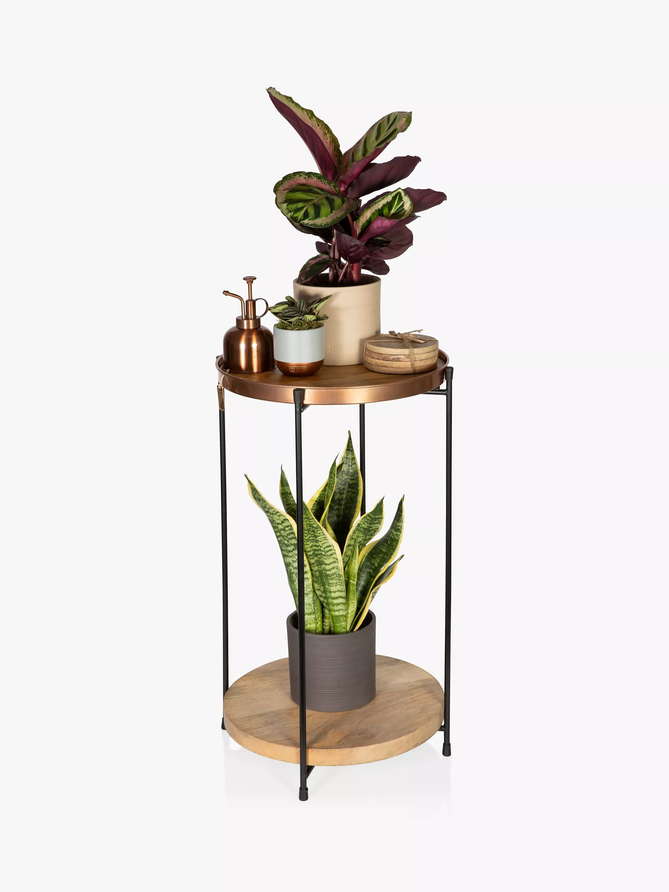 Included in this set: Plant Table, Mister, Set of 4 Coasters, Mini succulent in grey/copper Pot, Calathea Houseplant in almond pot, Sansevieria Snaky Houseplant in dark grey pot.