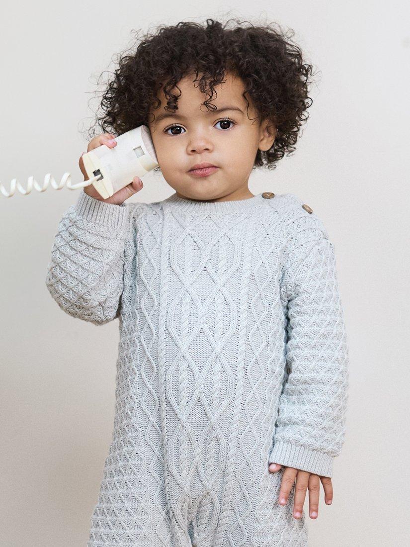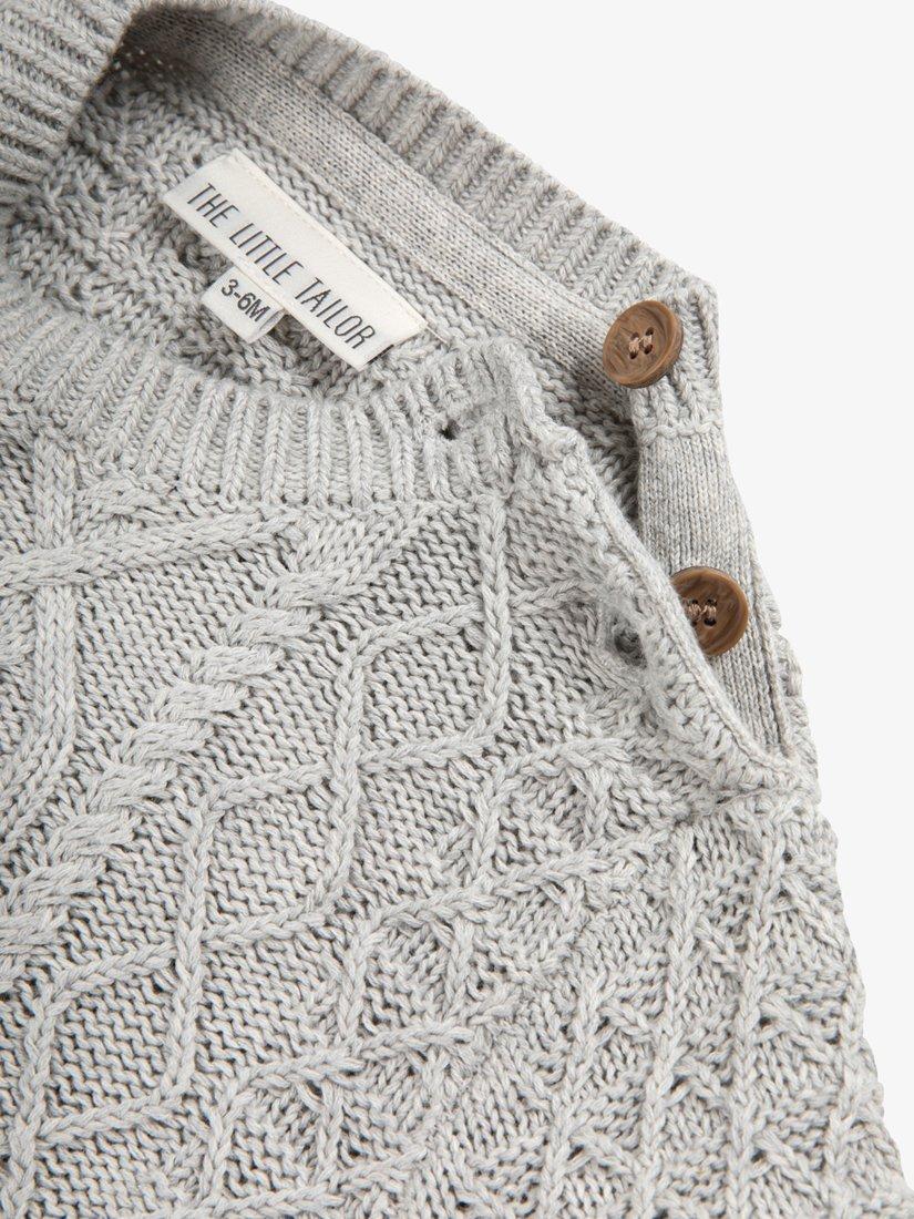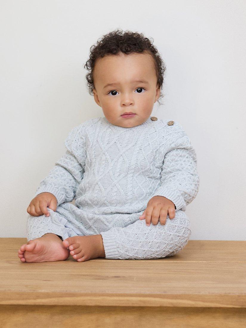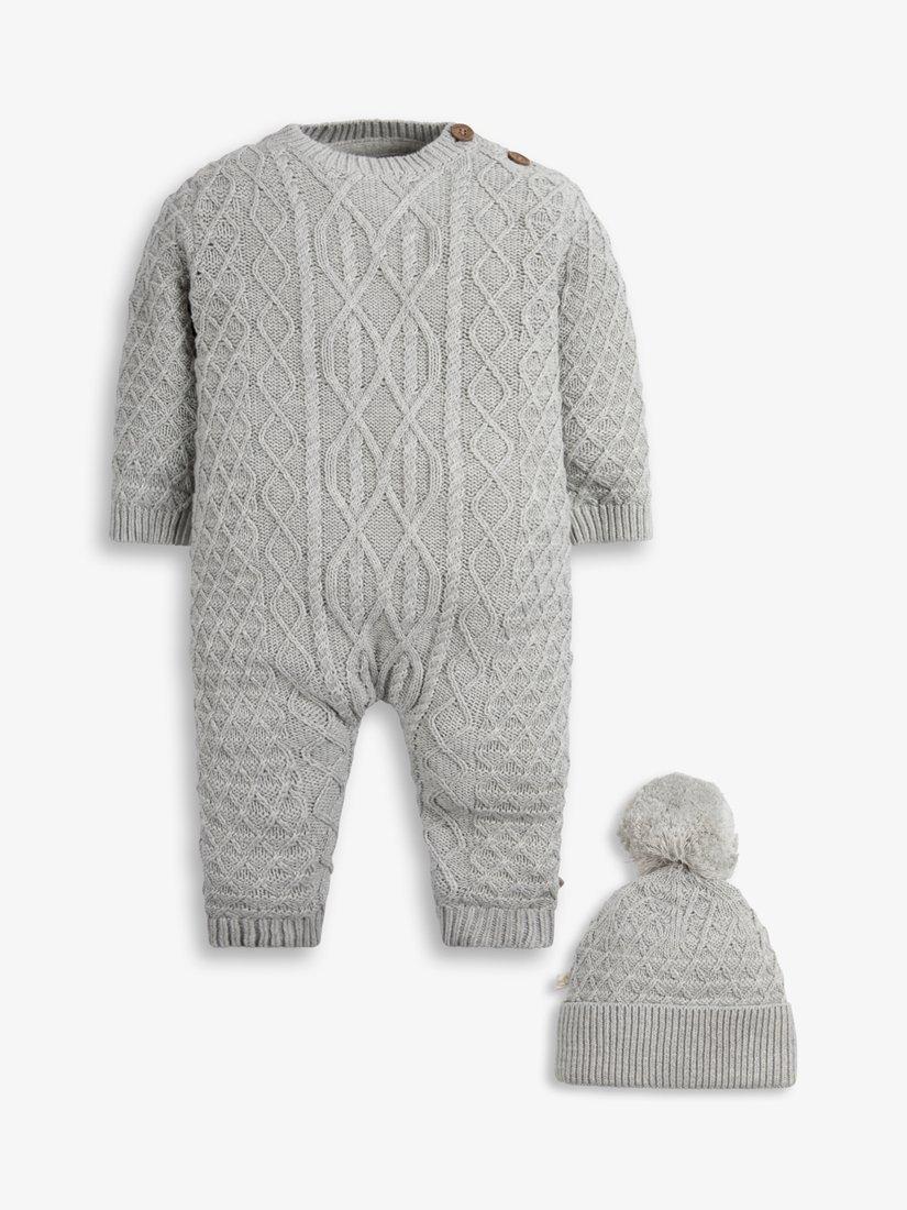 This timeless knitted cable romper and hat gift set is made from 100% cotton. With its pom pom hat and soft yarn this set is just adorable on and makes the perfect gift, comes with flat packed gift card and packaging.