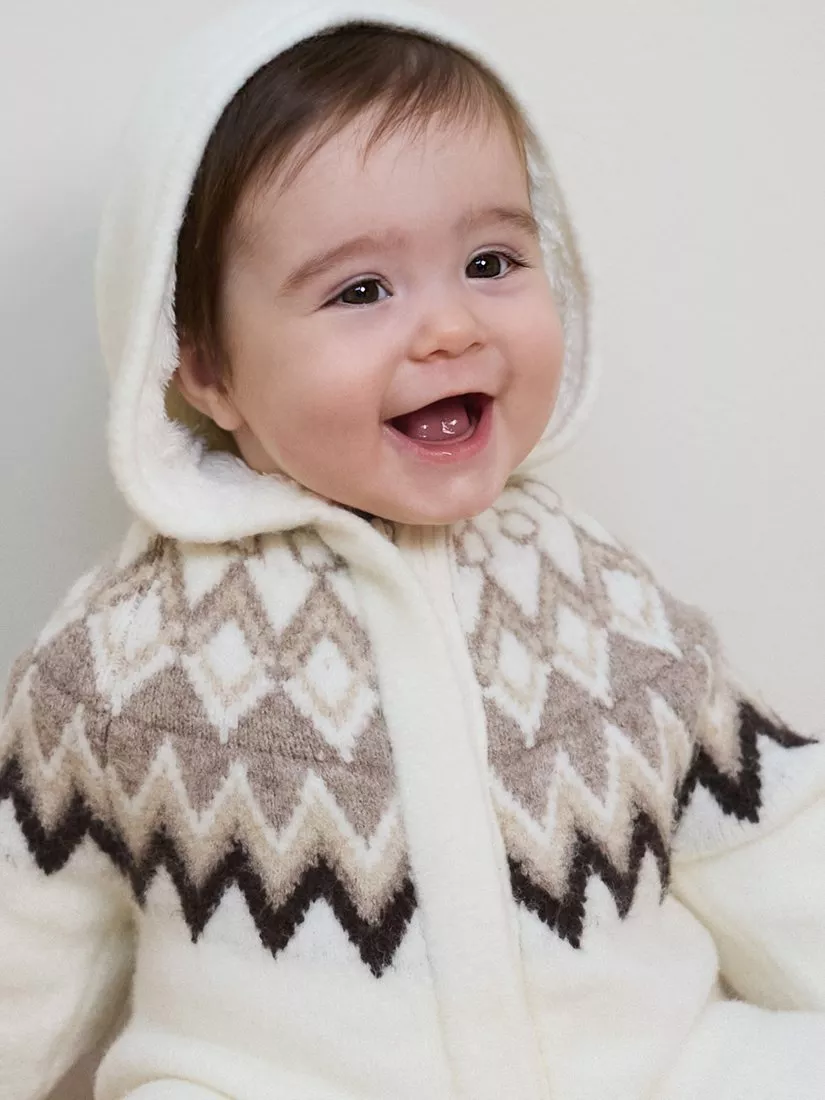 The Little TailorBaby Fair Isle Knitted Hooded Pramsuit, Cream/Taupe, 9-12 months