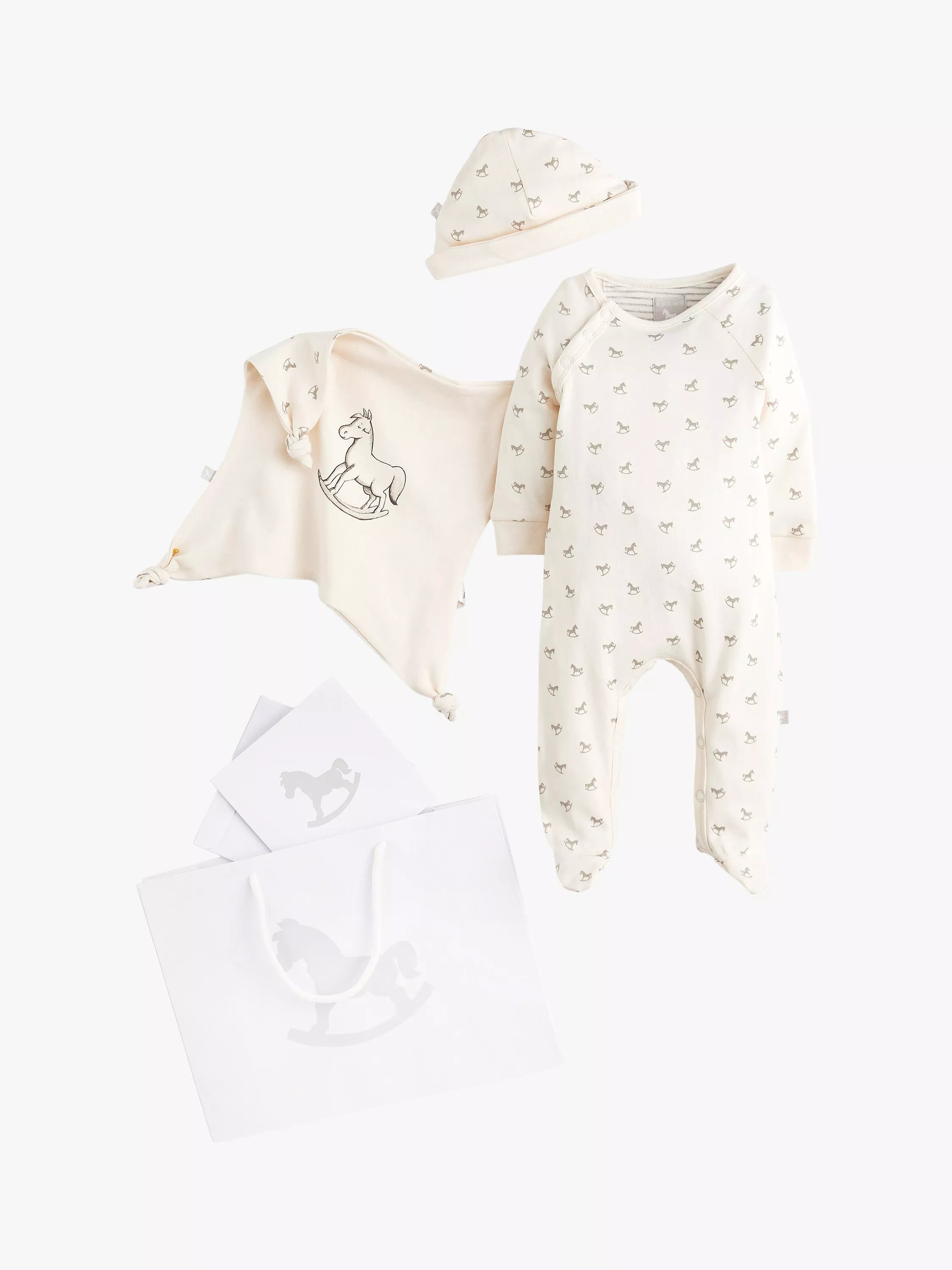 The perfect gift for little ones, this three-piece set from The Little Tailor includes a babygrow, hat and comforter. All made with supersoft cotton for ultimate comfort and finished with the brand's signature rocking horse design.