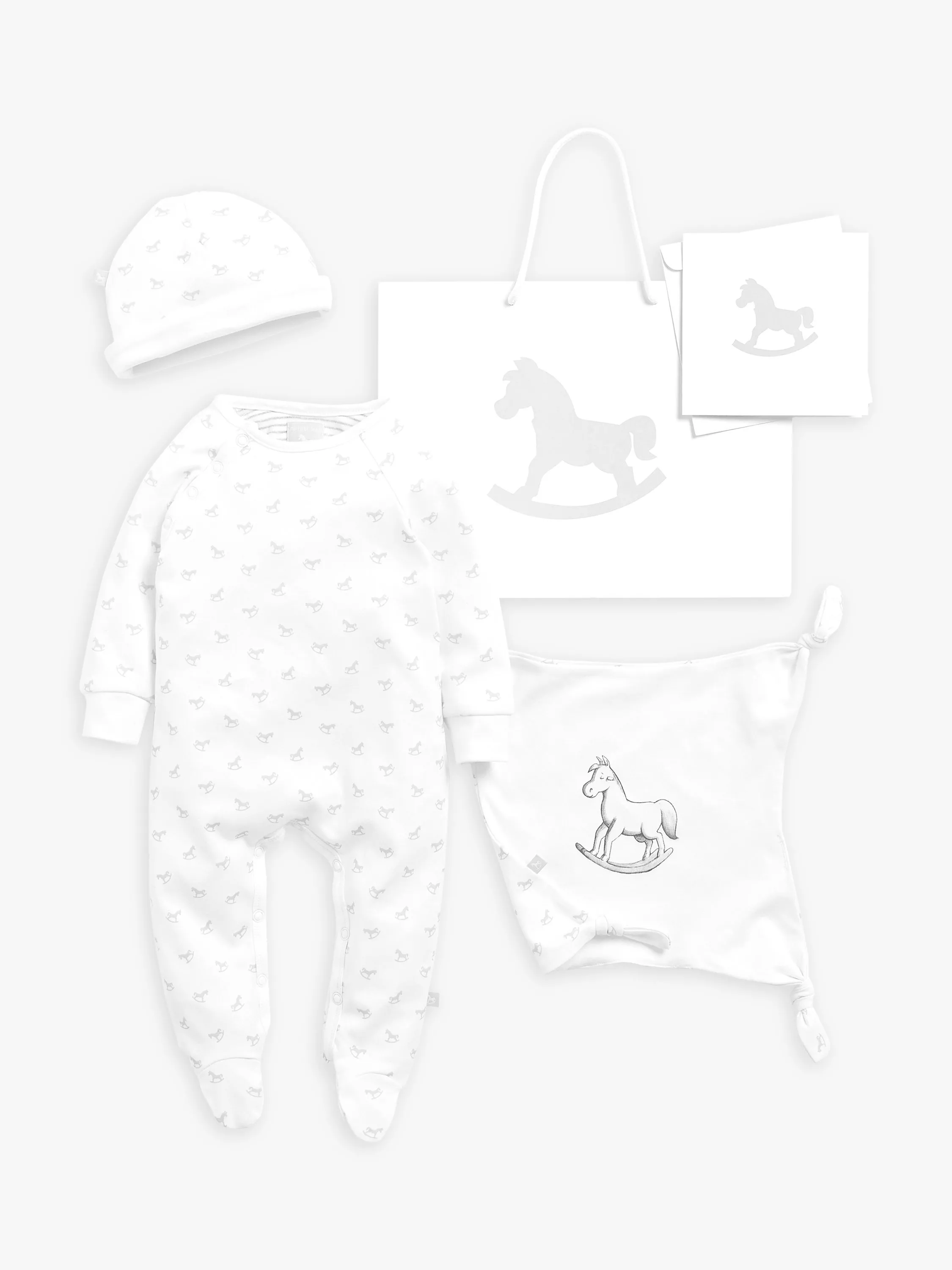 The perfect gift for little ones, this three-piece set from The Little Tailor includes a babygrow, hat and comforter. All made with supersoft cotton for ultimate comfort and finished with the brand's signature rocking horse design.