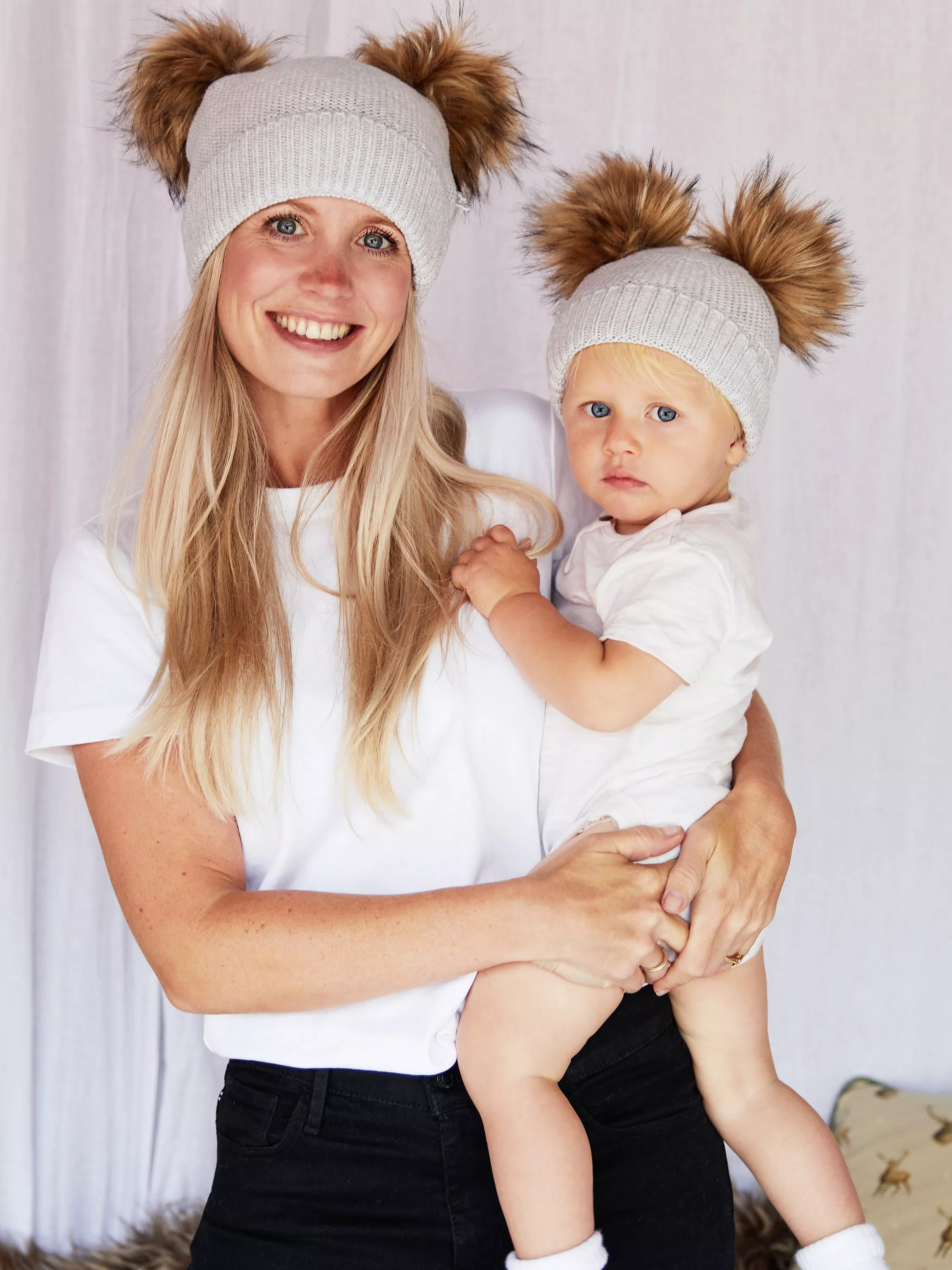 This fun, adorable pom pom hat will keep your baby super cosy. Made in soft snuggly cotton with faux fur Double Pom Pom detailing. Designed in England.