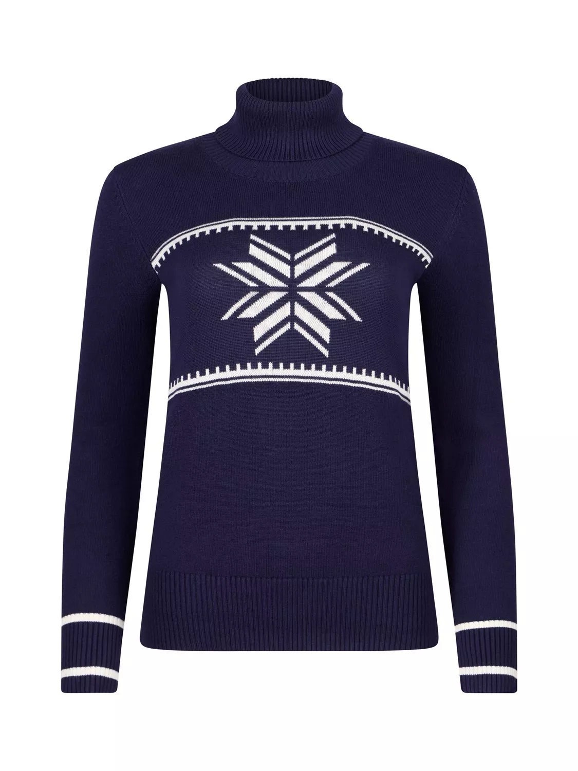 Slim fitting jumper with roll-neck and snowflake design featuring luxurious soft yarn, perfect for wearing on and off the slopes.
