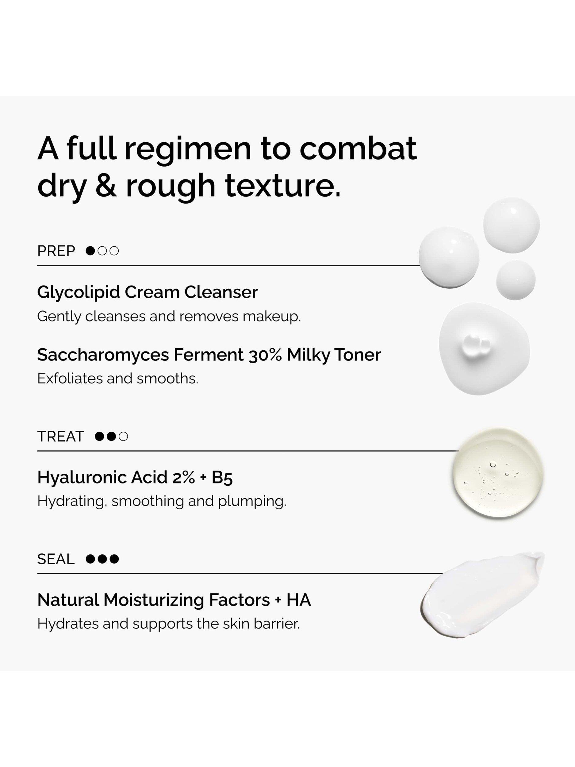 This set offers a full regimen to target dull, dry and uneven skin texture with products that offer hydration and skin barrier support. Includes a complementary pouch to store the formulations for your daily regimen.