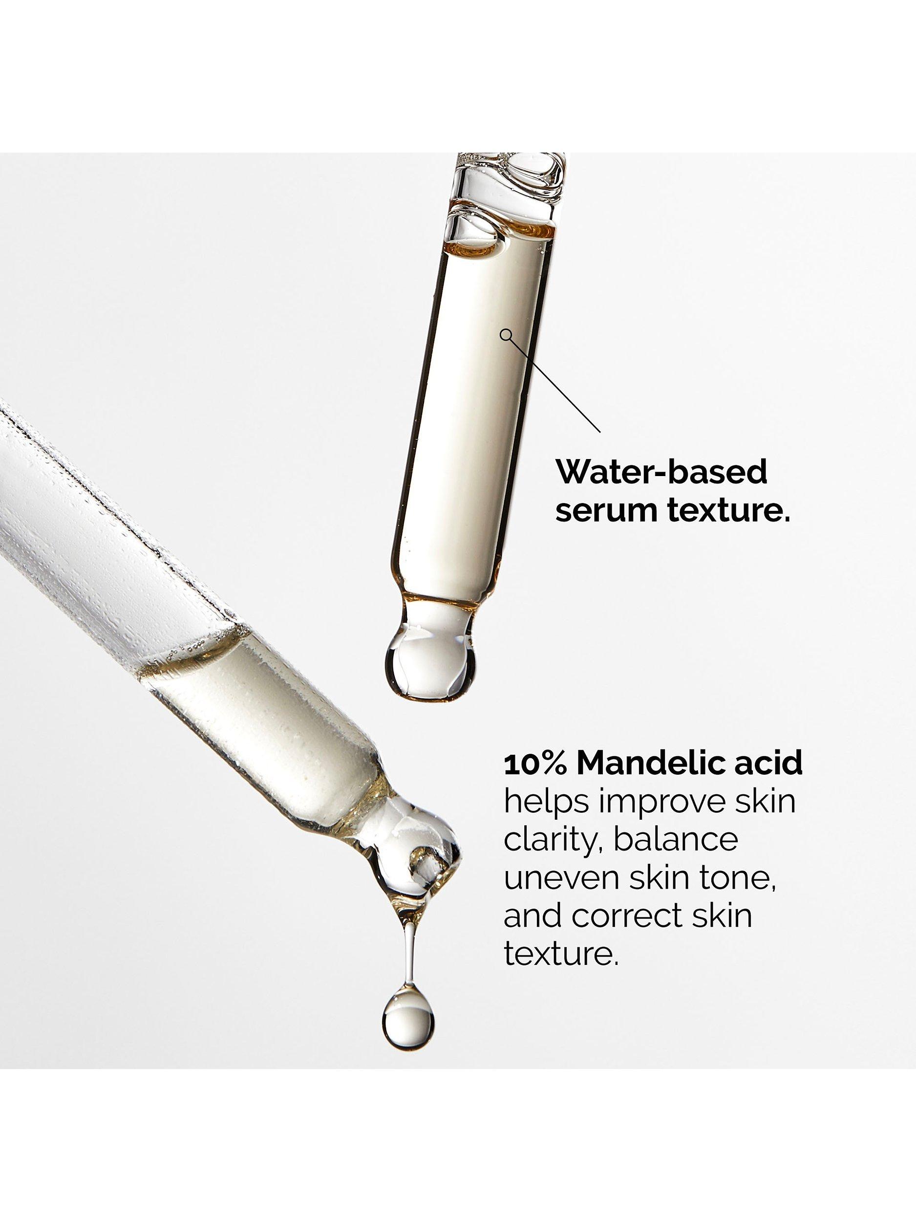 It does so by targeting the outermost layer of the skin and promoting its shedding to enhance overall radiance. This 10% formulation offers mild exfoliation for visible clarity. The molecular weight of Mandelic Acid is 152.1 daltons which is larger than other alpha hydroxy acids, such as Glycolic Acid (Glycolic Acid is 76.0 daltons).