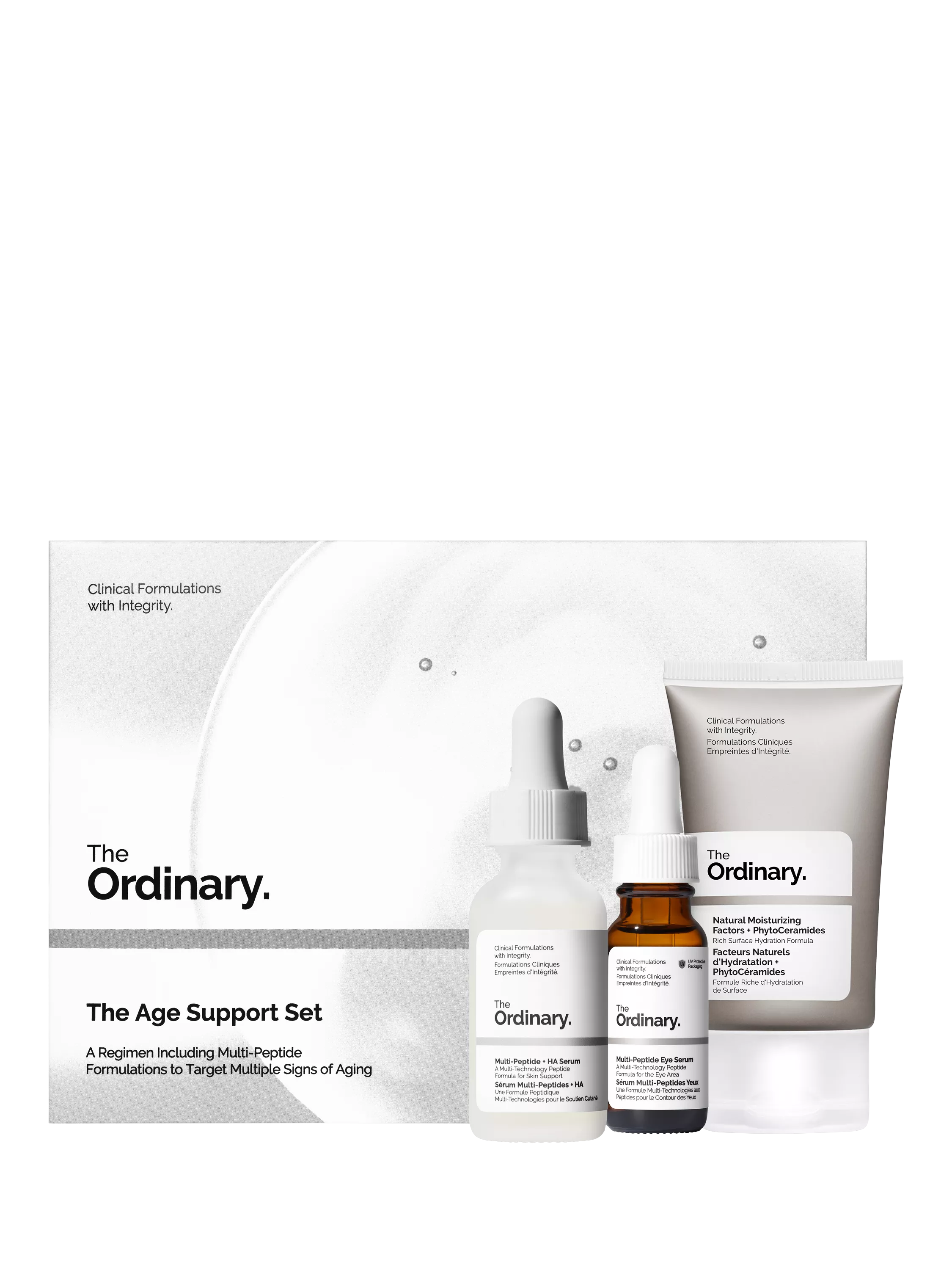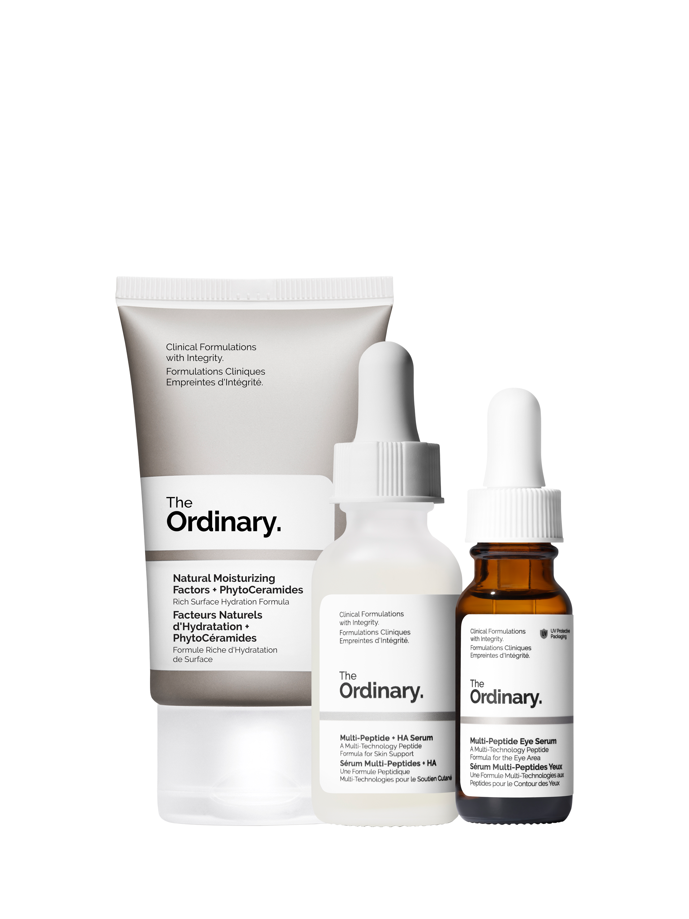To use the formulations together in a regimen, after cleansing with your preferred cleanser, apply a few drops of Multi-Peptide + HA Serum and massage into skin. Follow with a small amount of Multi-Peptide Eye Serum around the eye contour. Finish with a small amount of Natural Moisturising Factors + PhytoCeramides.