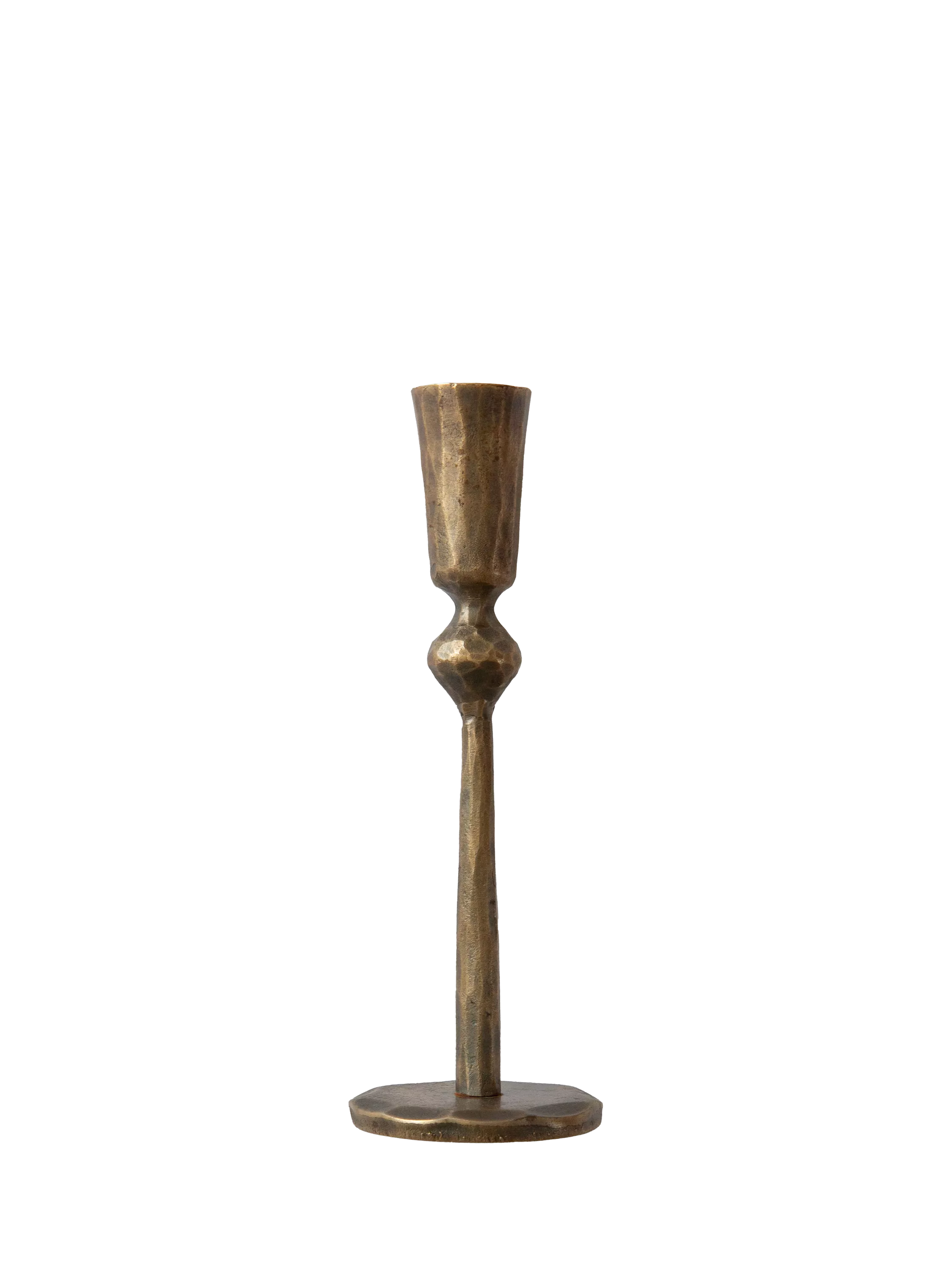 Handmade from iron and plated in brass, this candle holder has a softly aged patina that lends it a vintage character. Its understated design brings a quiet touch of opulence to a dining table or mantle. Made to fit a standard 22mm taper dinner candle.