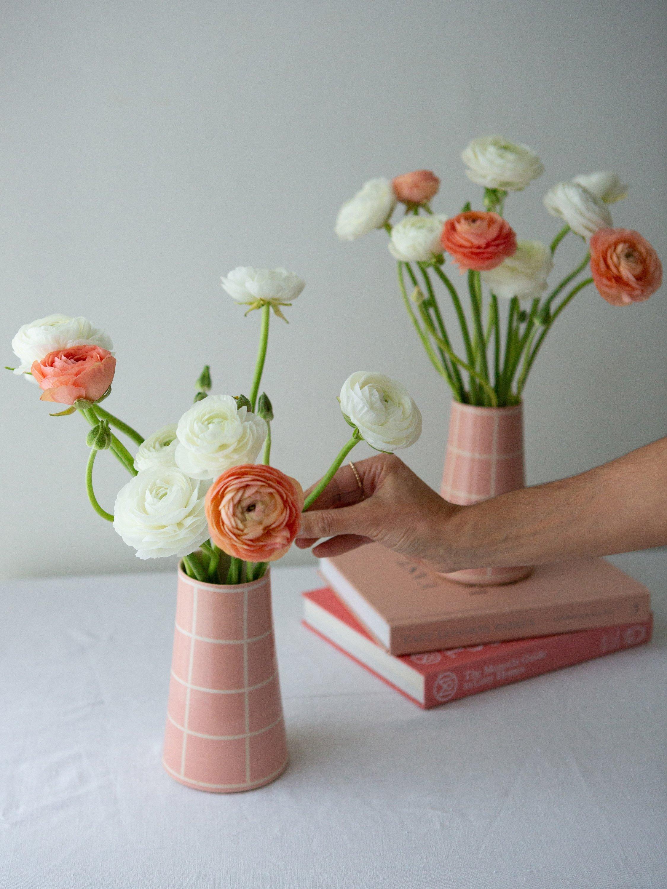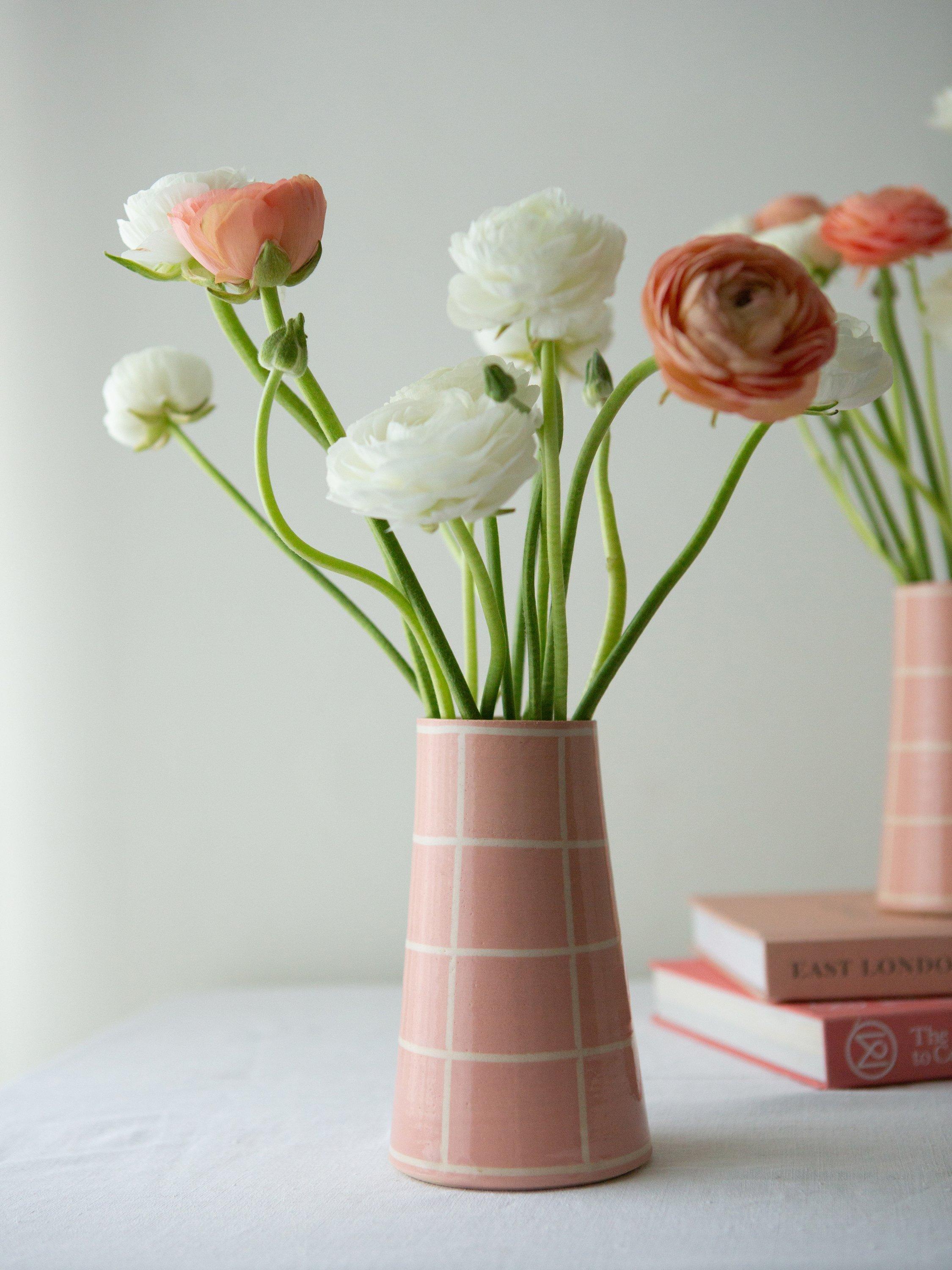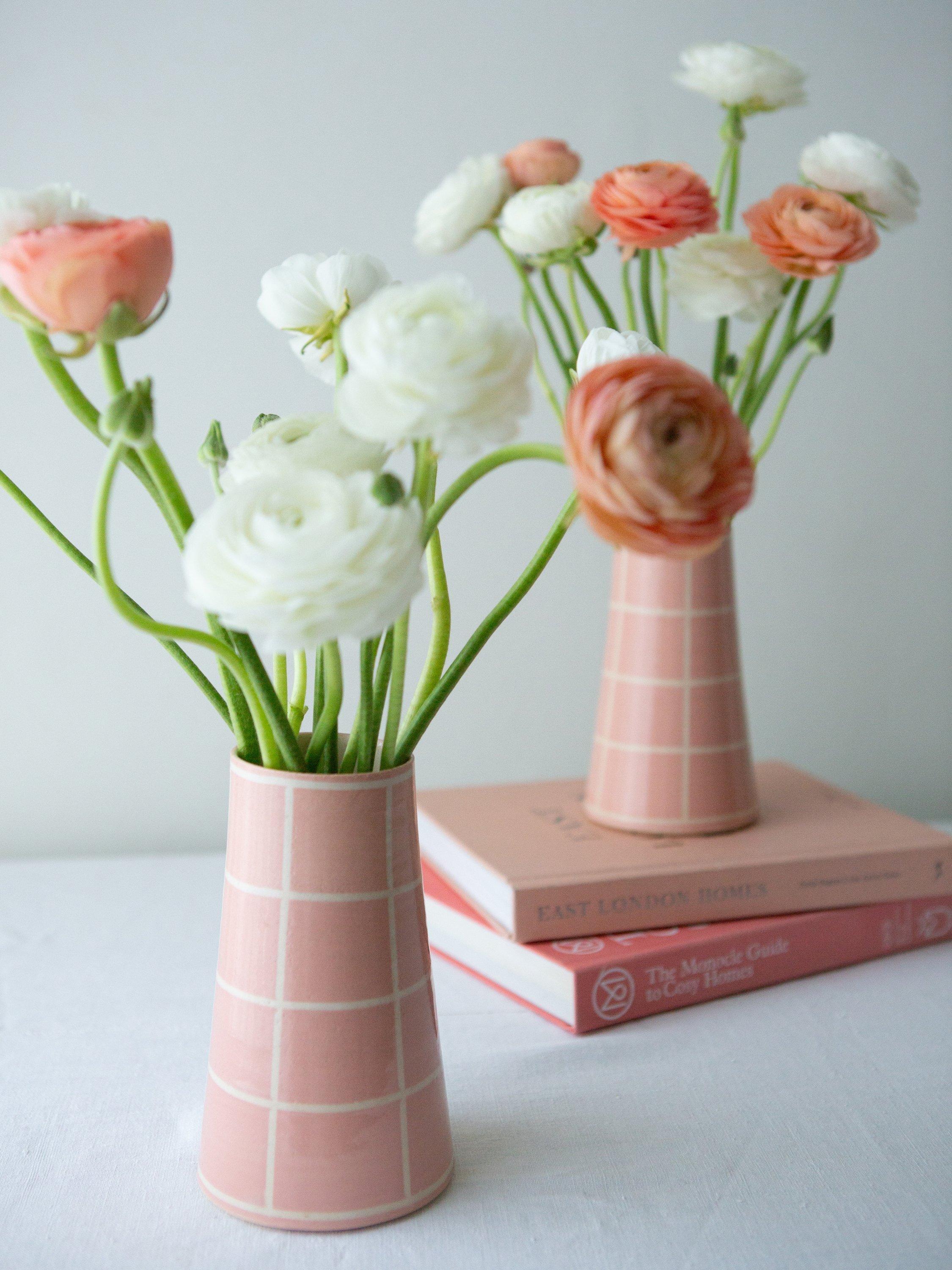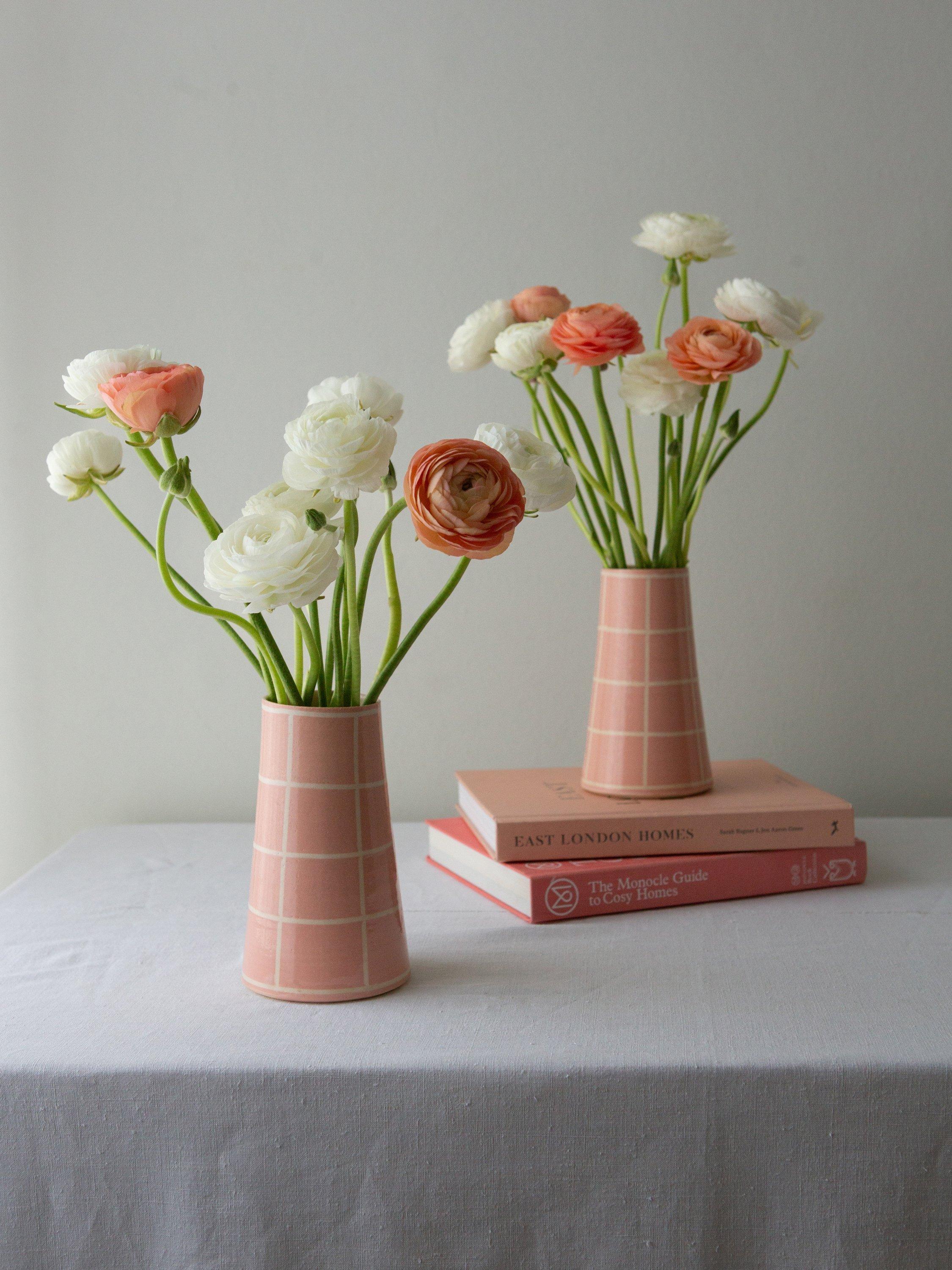 A wheel-thrown stoneware vase, hand-painted with a simple square design. Finished with a clear glaze that brings out the warmth of the colour and the texture of the clay. An easy, everyday piece — just the right size for a small bunch of spring blooms or a few gathered stems. Each vase is made by hand, so no two are exactly the same.