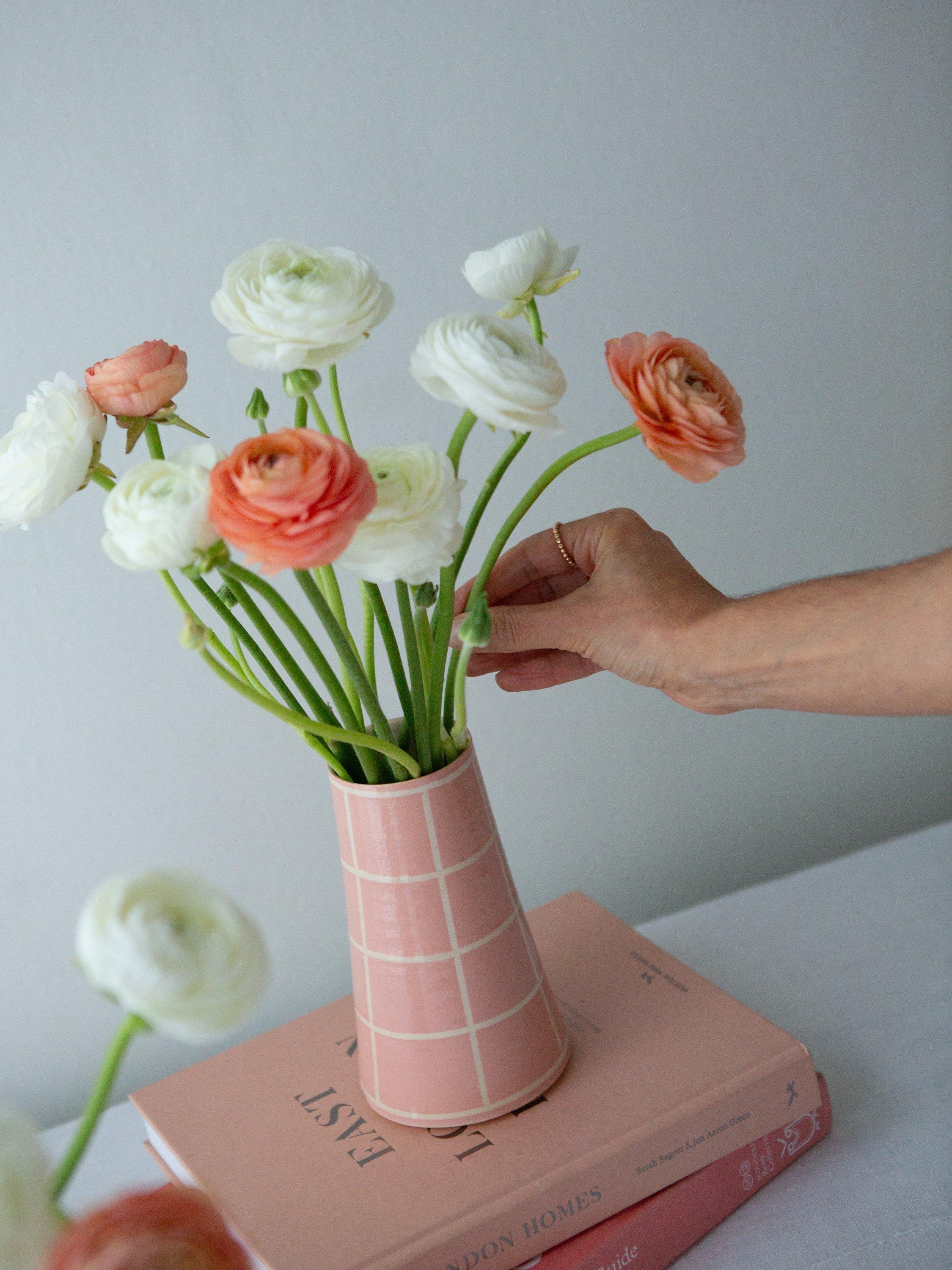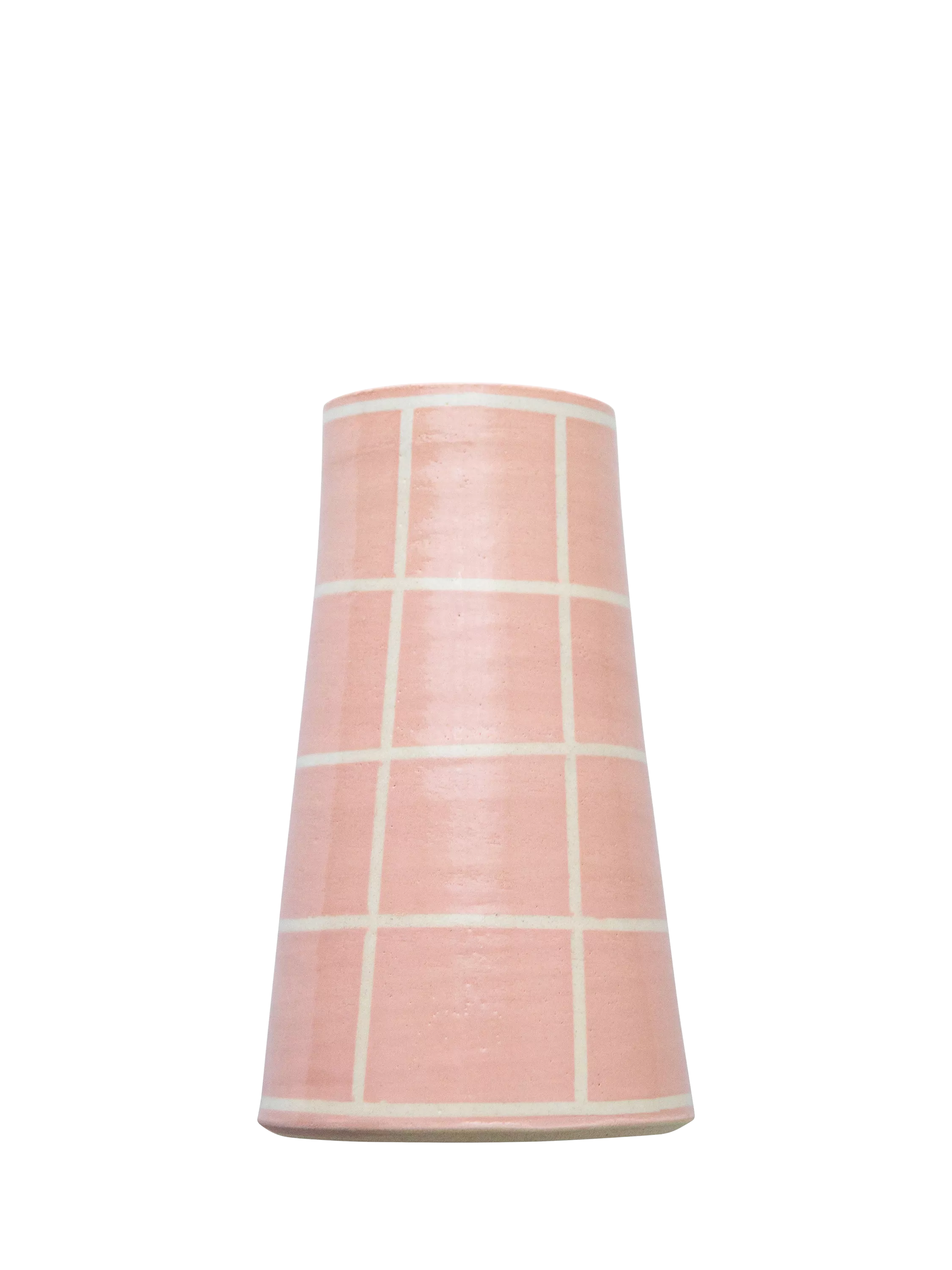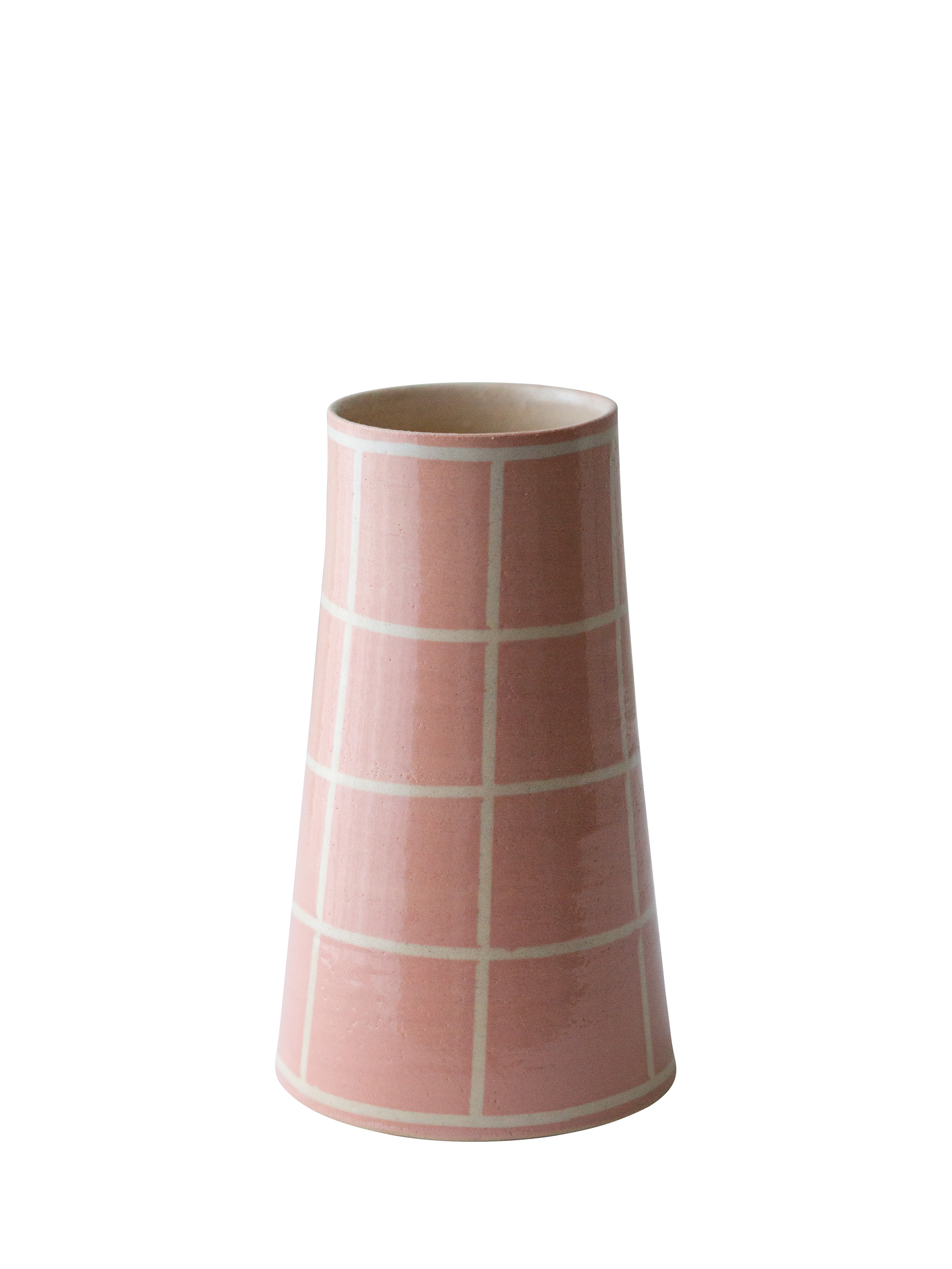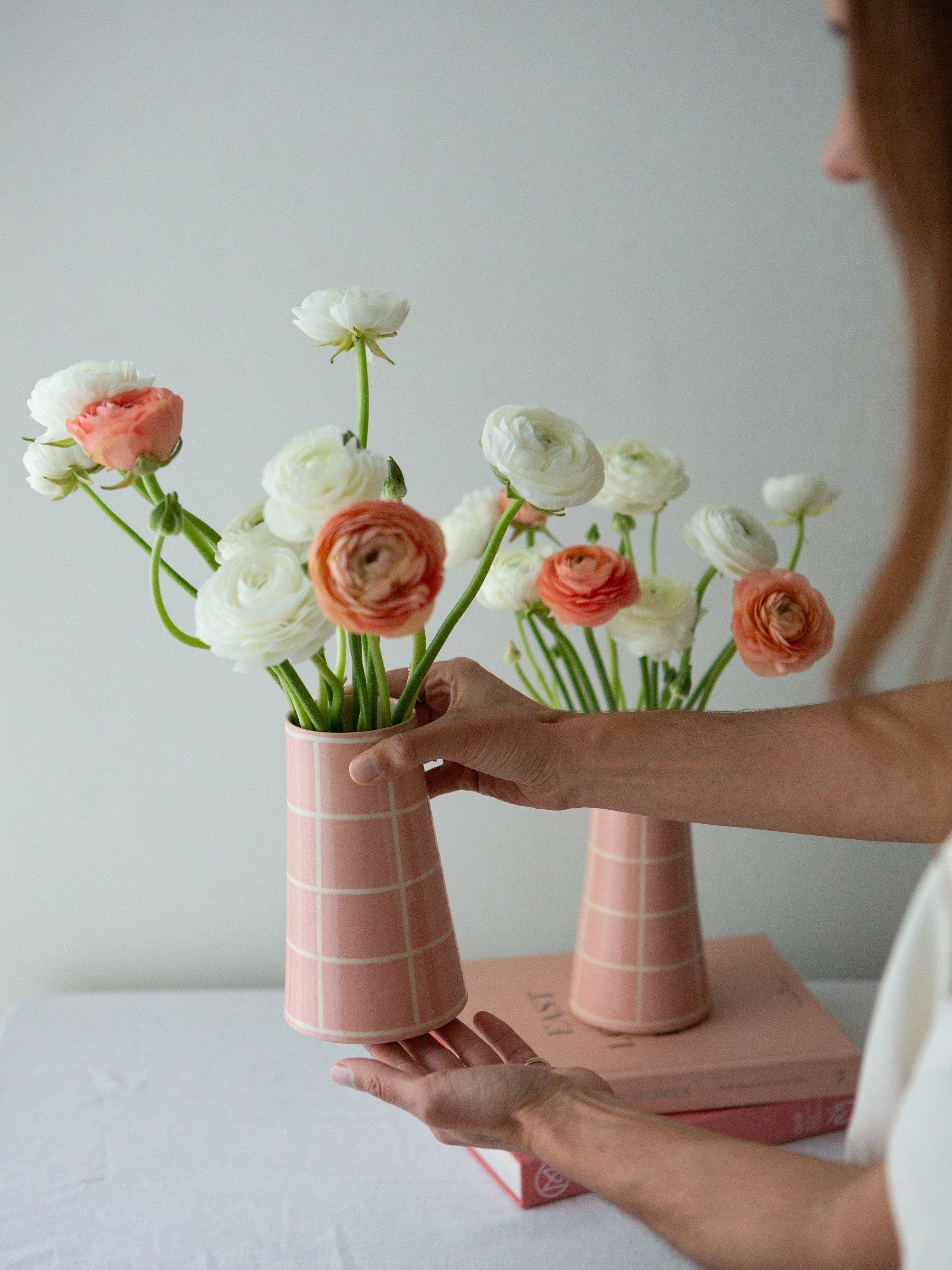 A wheel-thrown stoneware vase, hand-painted with a simple square design. Finished with a clear glaze that brings out the warmth of the colour and the texture of the clay. An easy, everyday piece — just the right size for a small bunch of spring blooms or a few gathered stems. Each vase is made by hand, so no two are exactly the same.
