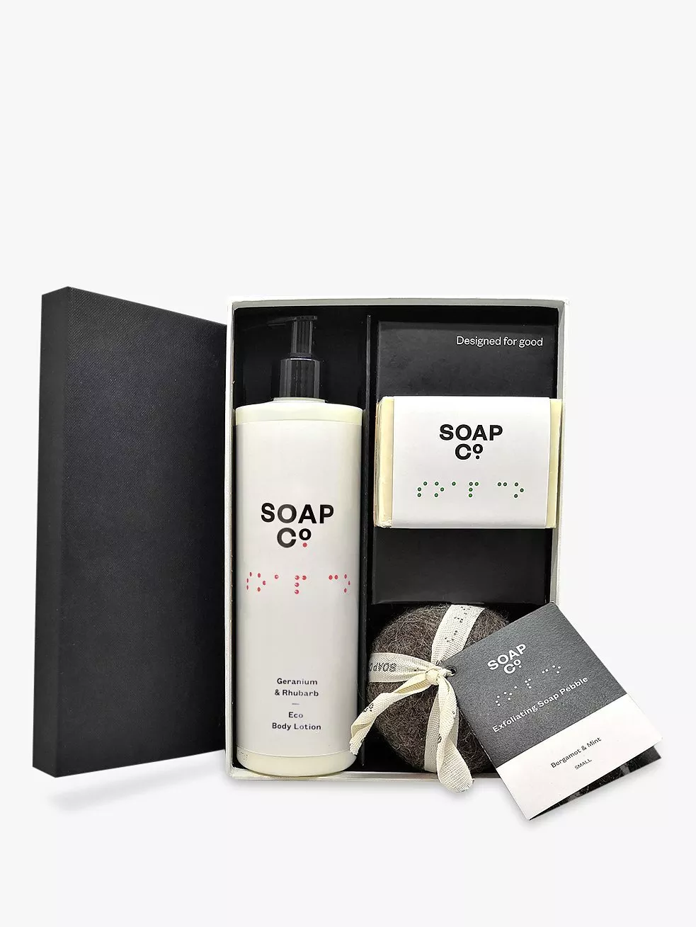 Features our popular exfoliating soap pebble, an indulgent Geranium & Rhubarb body lotion and a handmade, hand stamped and hand wrapped cold processed soap in Wild Nettle and Sage.