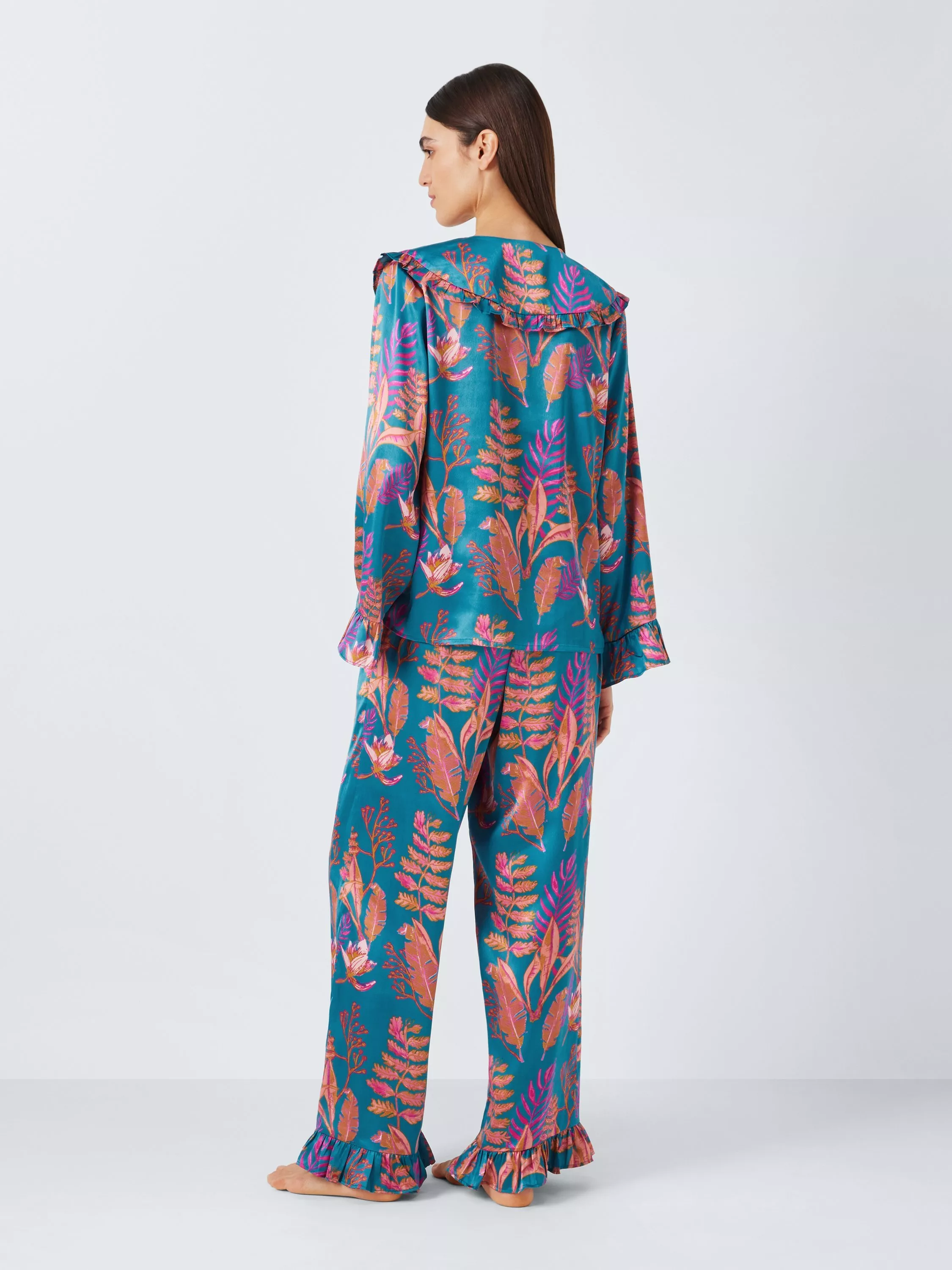Perfect for early nights and long lie-ins, these mood-boosting pyjamas feature an array of Autumn leaves inspired by beautiful winter sunsets and all the wonderful colours she brings. A comfortable and generous take on a classic pyjama design allowing for free movement and the essential addition of pockets. This long leg and long sleeve pyjama set is made from durable satin that washes well, topped with elegant frills around the oversized collar, and contrast piping for elevated detail.