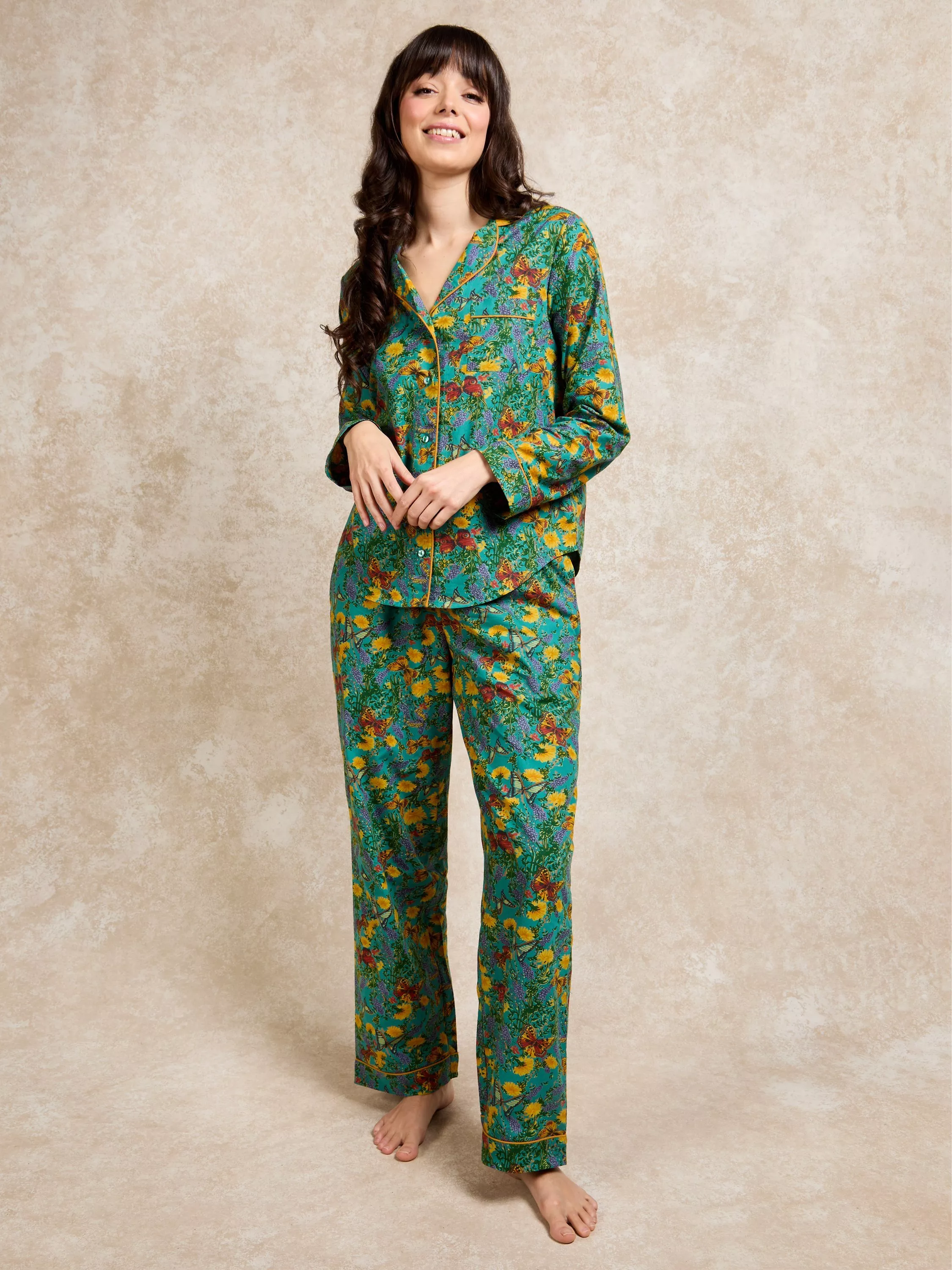 Perfect for early nights and long lie-ins, these mood-boosting pyjamas feature an array of fluttering butterflies amongst a field of flowers on a soft base. A comfortable and generous take on a classic pyjama design allowing for free movement and the essential addition of pockets. This long leg and long sleeve pyjama set is made from durable fabric that washes well, finished with contrasting piping for elevated detail.