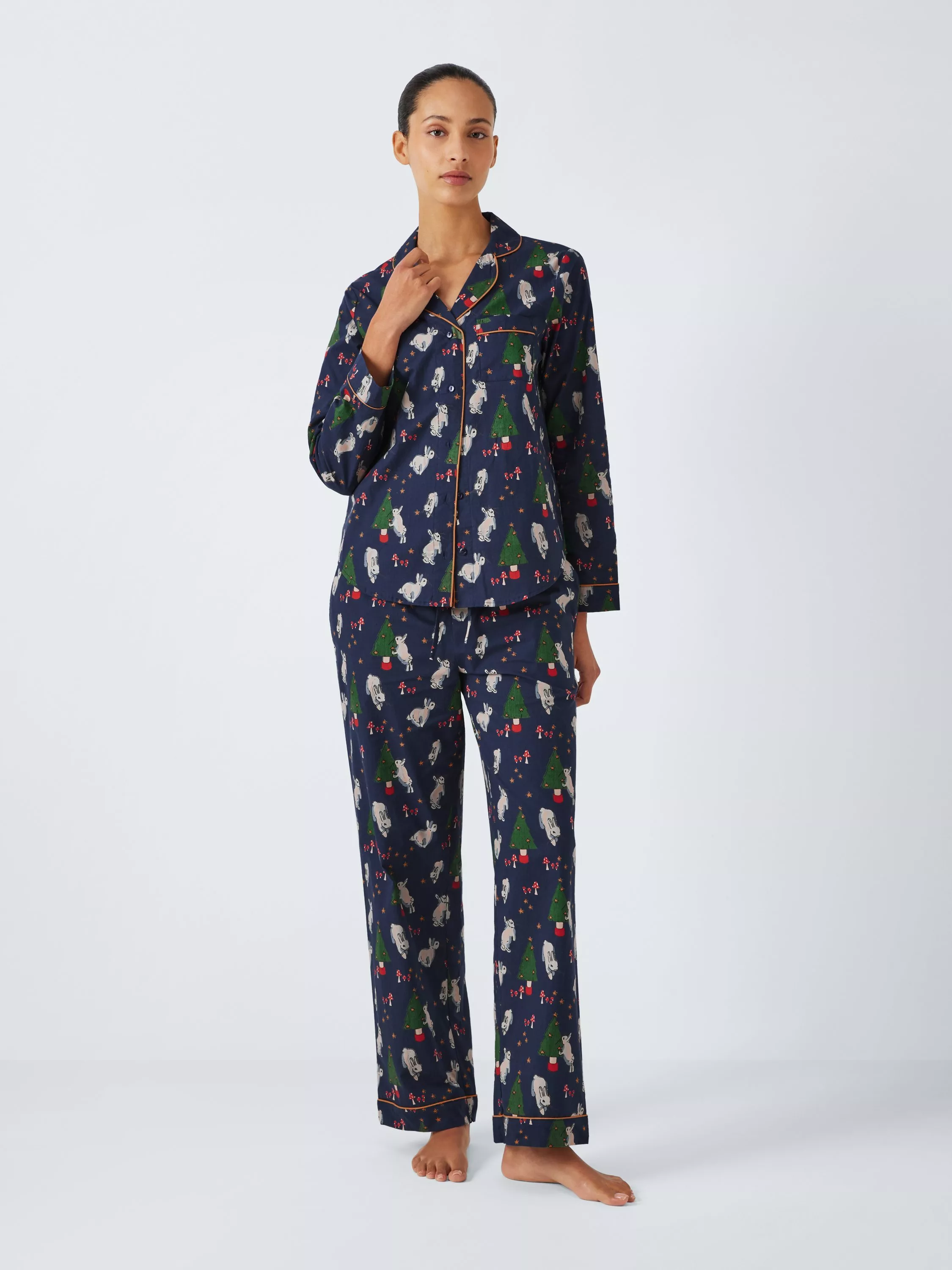 Perfect for early nights and long lie-ins, these mood-boosting pyjamas feature a hand-drawn festive bunny rabbit print. With busy popping stars and Christmas trees. A comfortable and generous take on a classic pyjama design allowing for free movement and the essential addition of pockets. This long leg and long sleeve pyjama set is made from durable, soft cotton that washes well, topped with contrast piping for elevated detail. The button-down shirt with a front pocket is the perfect match for the comfortable wide-leg trousers with an elasticated tie waist.