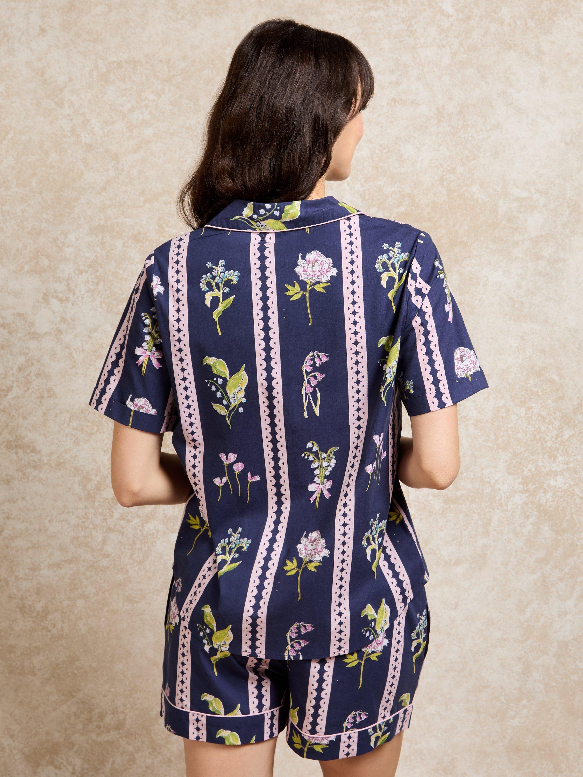 Perfect for early nights and long lie-ins, these mood-boosting pyjamas feature a curated collection of hand-drawn florals and scallop pattern detailing. A comfortable and generous take on a classic short pyjama design allowing for free movement and the essential addition of pockets. This short sleeve and short bottom pyjama set is made from durable cotton that washes well, finished with contrasting piping for elevated detail.