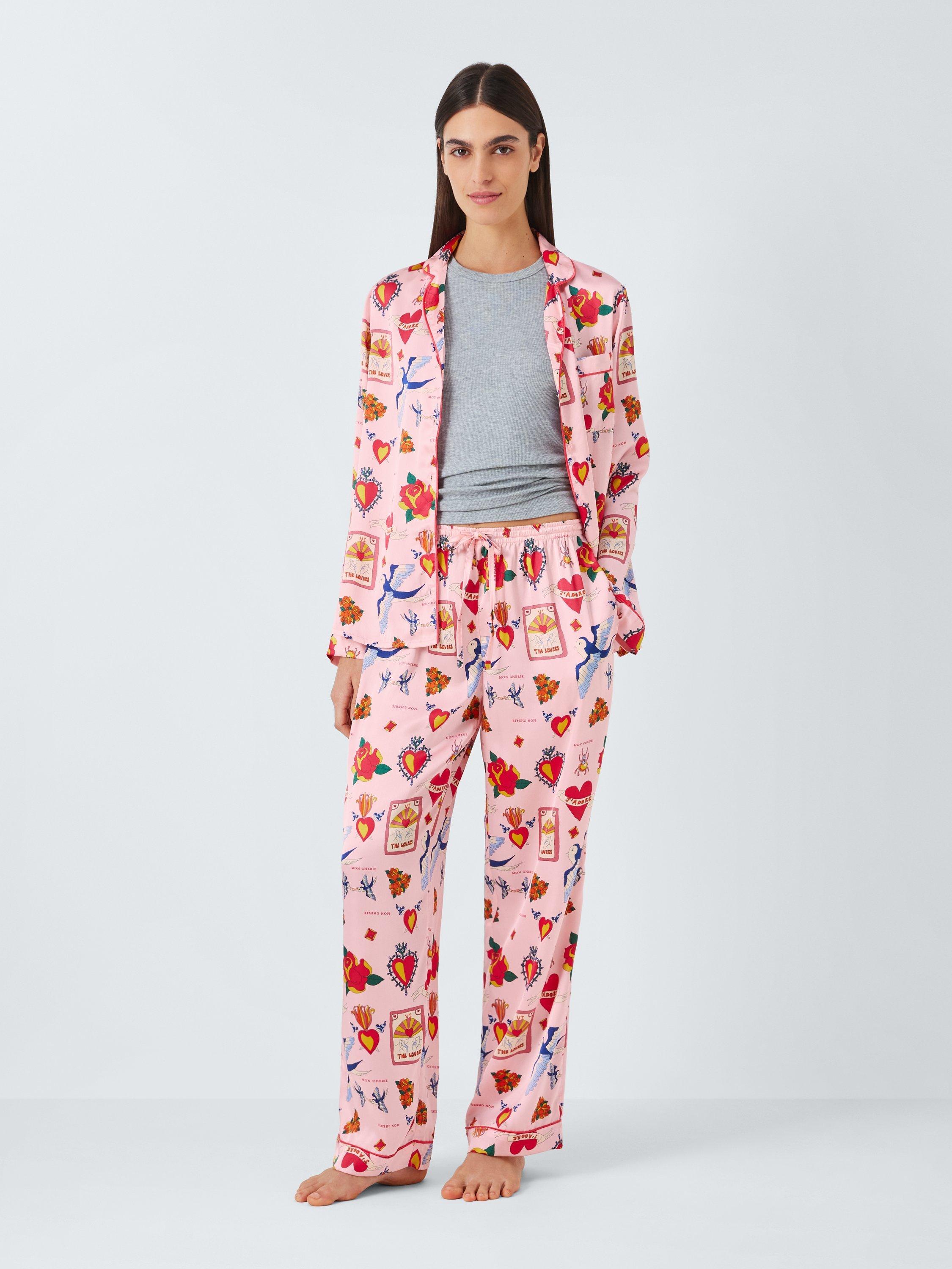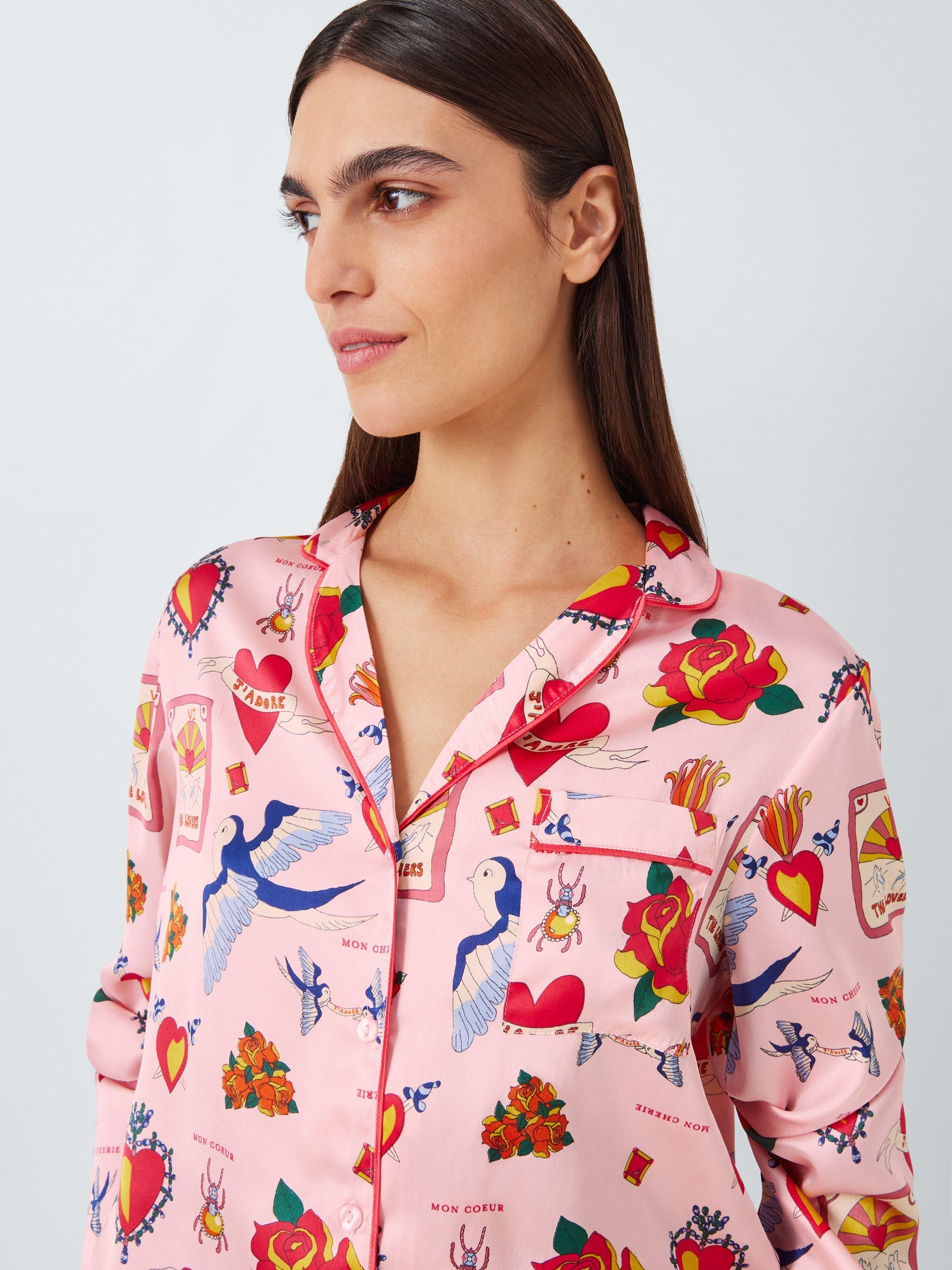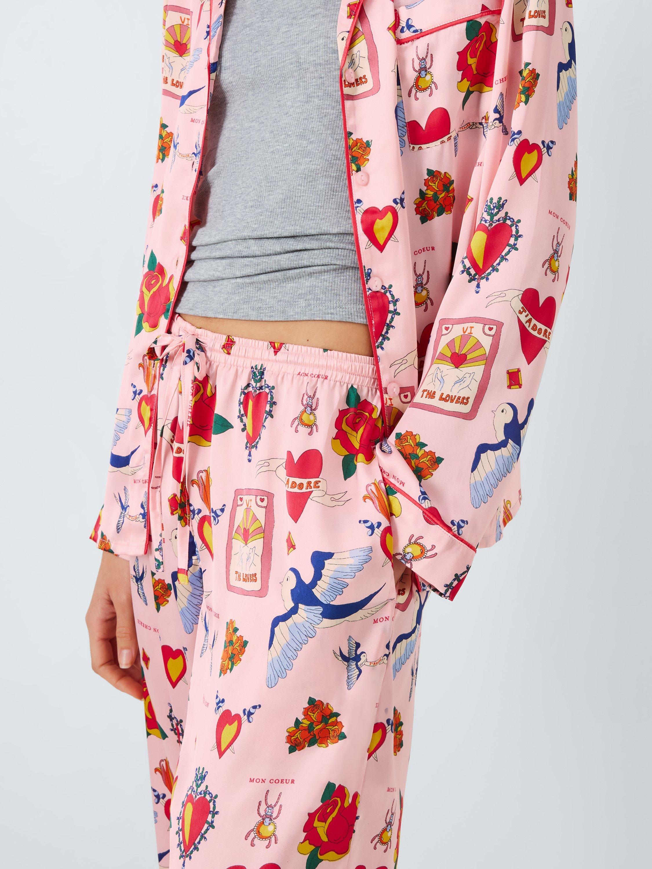 Perfect for early nights and long lie-ins, these mood-boosting pyjamas are inspired by traditional tattoos as a way to show love. This loveable print is on a pretty soft base with contrasting colours to really make the quirky hand-drawn sketches stand out. A comfortable and generous take on a classic pyjama design allowing for free movement and the essential addition of pockets. This long leg and long sleeve pyjama set is made from durable satin that washes well, topped with contrast piping for elevated detail. The button-down shirt with a front pocket is the perfect match for the comfortable wide-leg trousers with an elasticated tie waist.