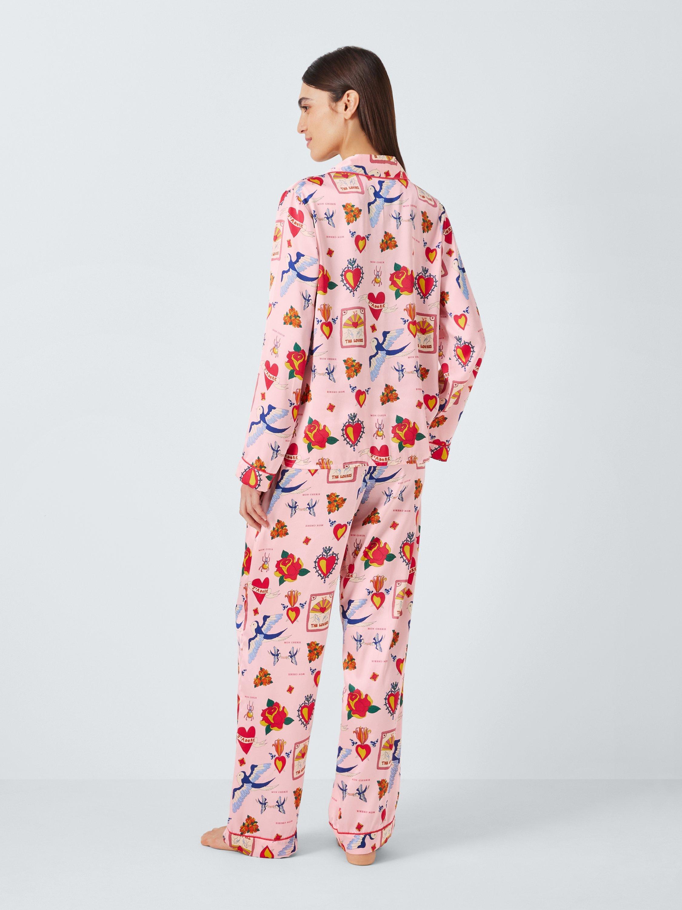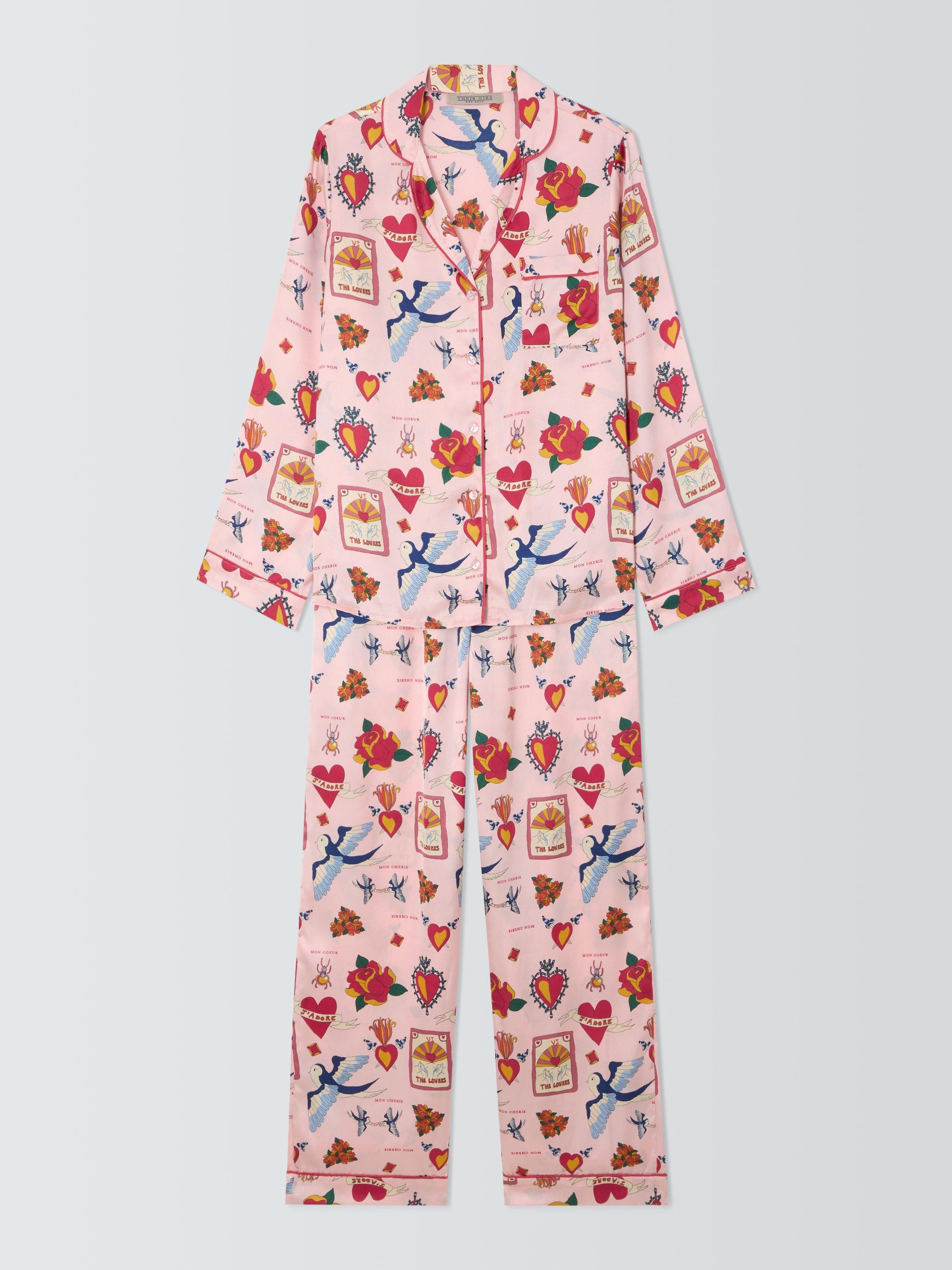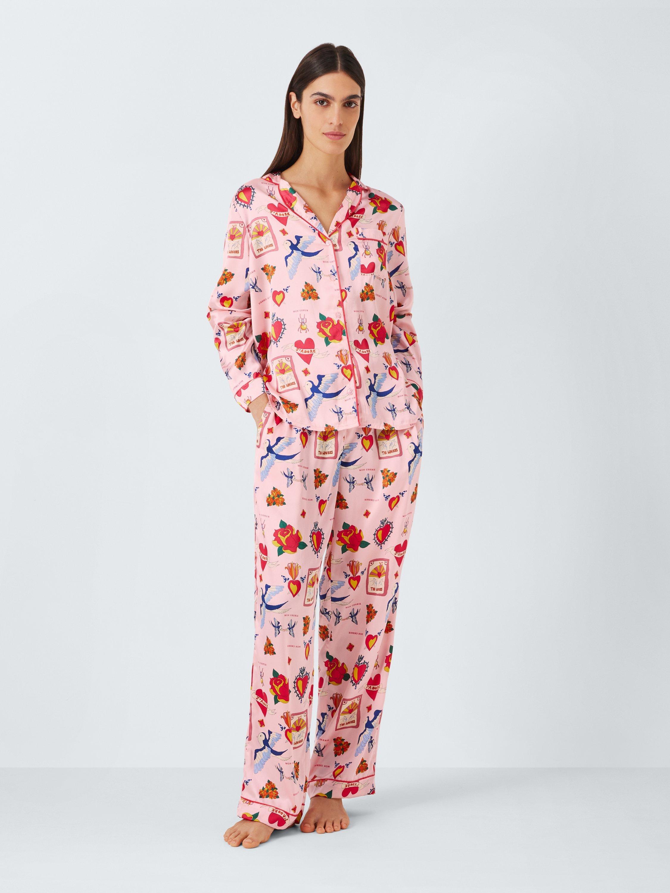 Perfect for early nights and long lie-ins, these mood-boosting pyjamas are inspired by traditional tattoos as a way to show love. This loveable print is on a pretty soft base with contrasting colours to really make the quirky hand-drawn sketches stand out. A comfortable and generous take on a classic pyjama design allowing for free movement and the essential addition of pockets. This long leg and long sleeve pyjama set is made from durable satin that washes well, topped with contrast piping for elevated detail. The button-down shirt with a front pocket is the perfect match for the comfortable wide-leg trousers with an elasticated tie waist.