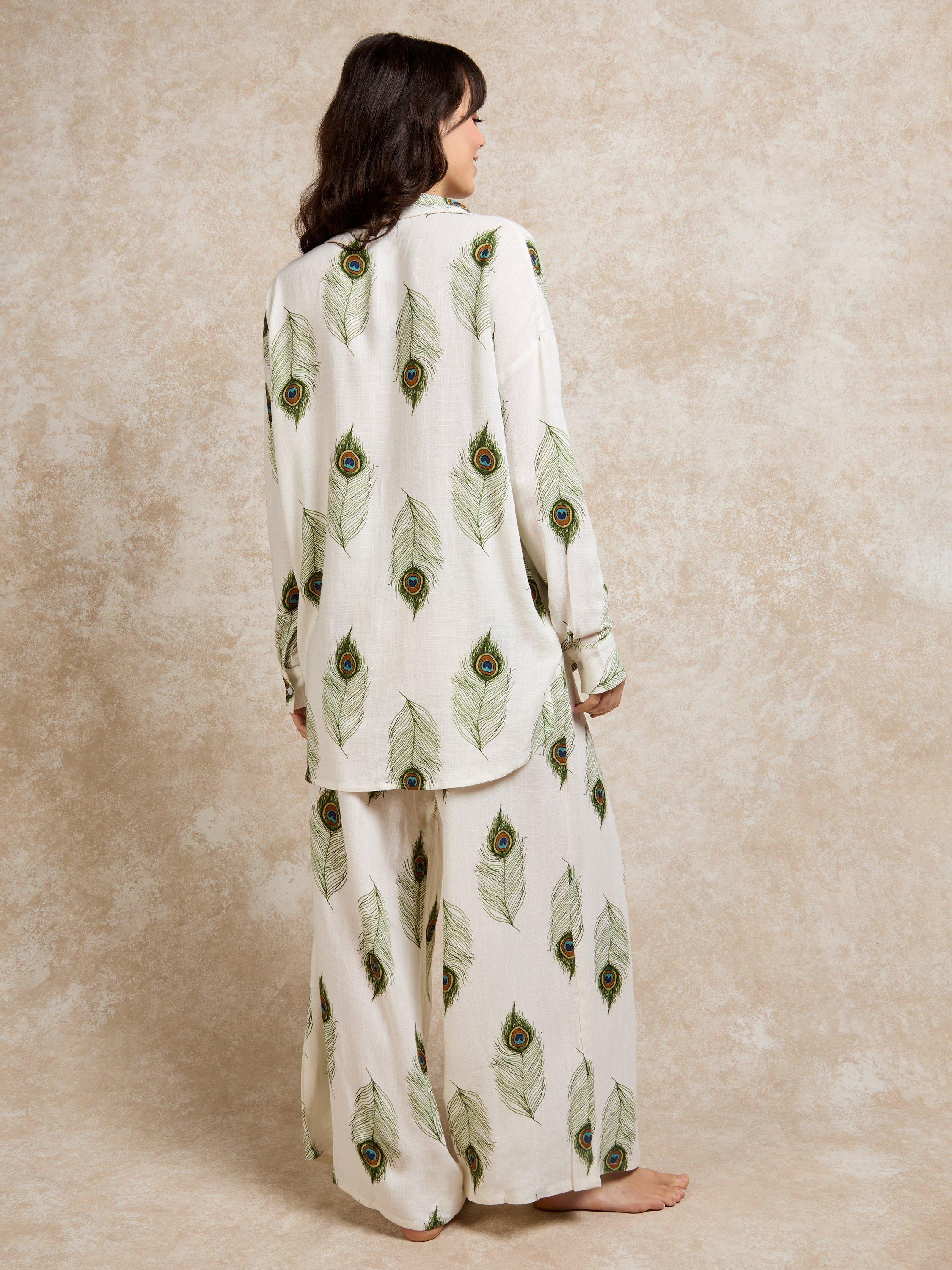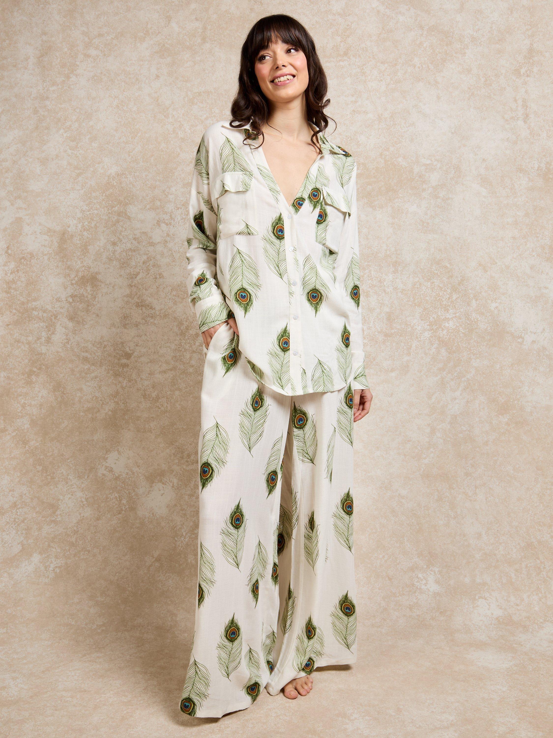A versatile linen blend pyjama set that can be worn for a comfortable lounging experience, or dressed up to wear out and about. Featuring our iconic hand-drawn peacock feather on a soft base, these pyjamas are oversized with an elasticated waist and a boyfriend style button-through shirt.