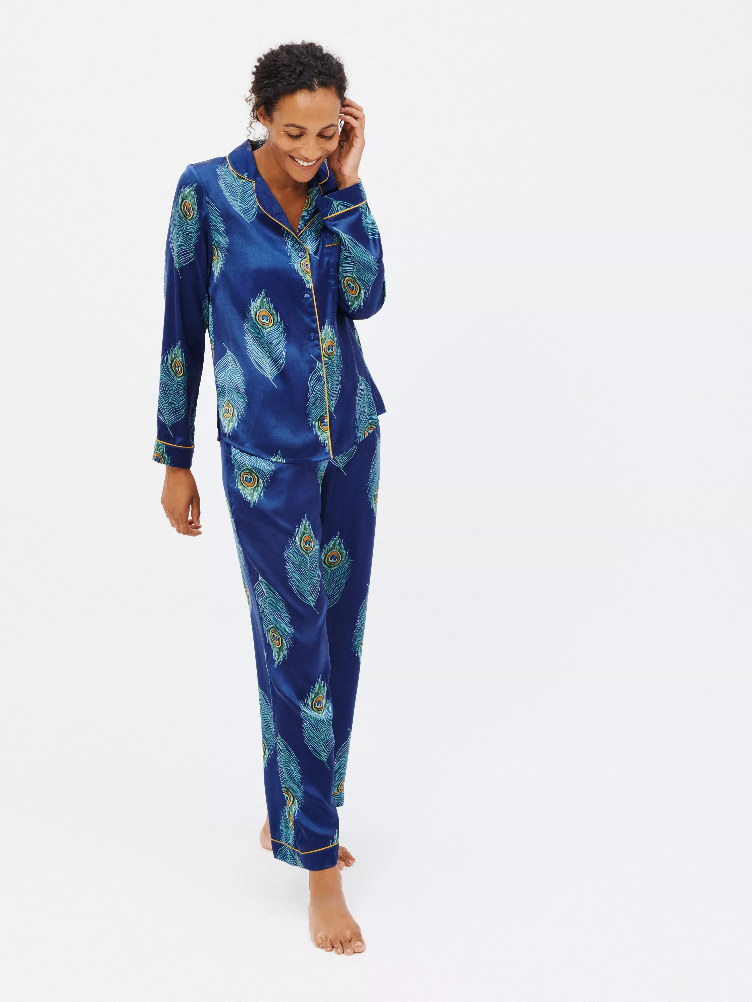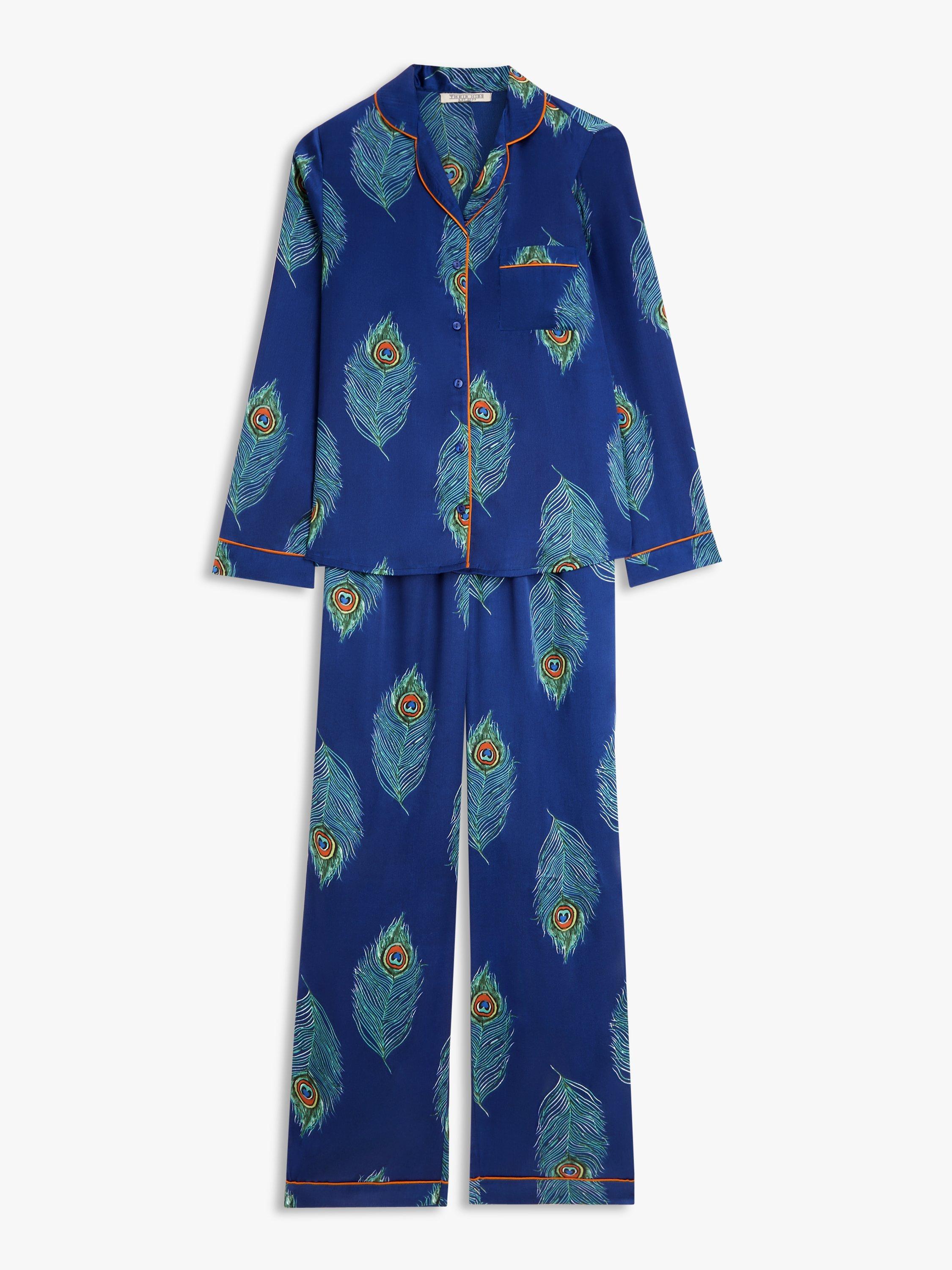 In a hand-painted peacock feather print, this long-sleeve pyjama set by Their Nibs is finished in satin with contrast piping.