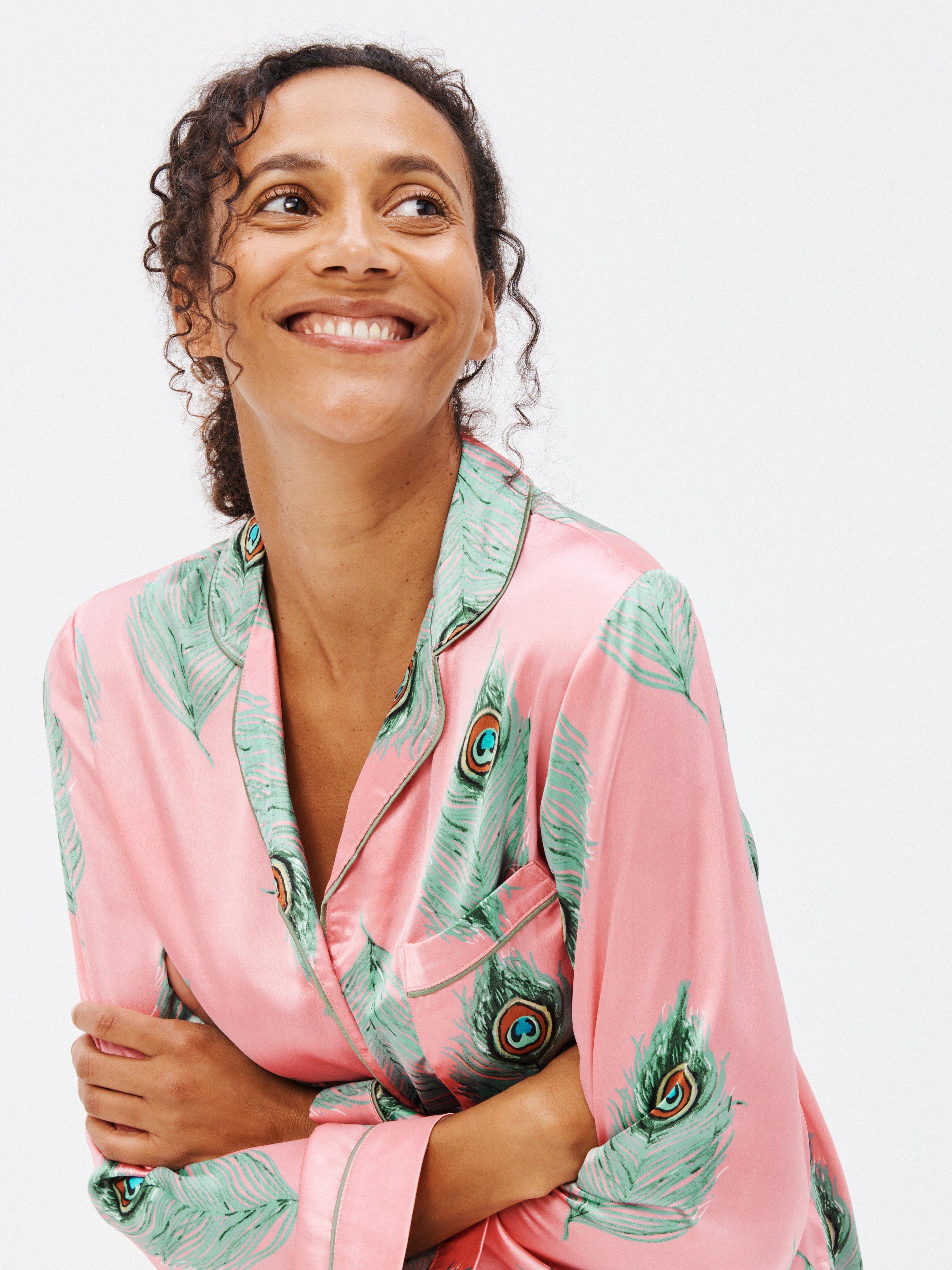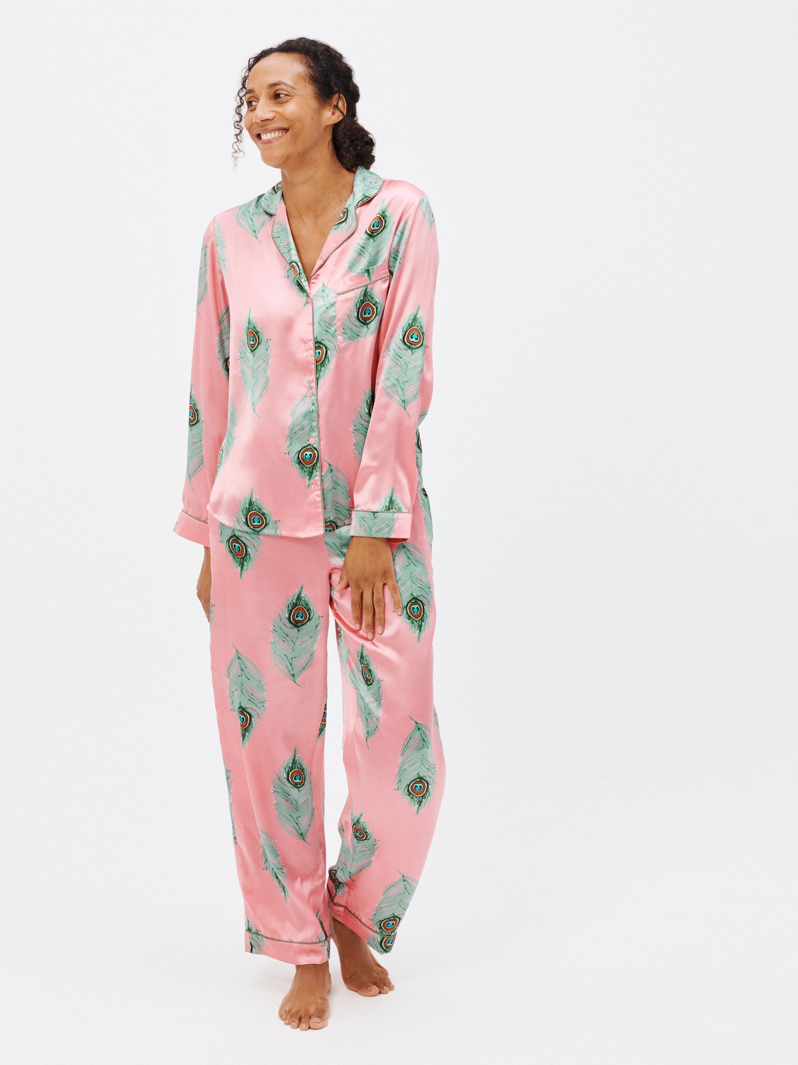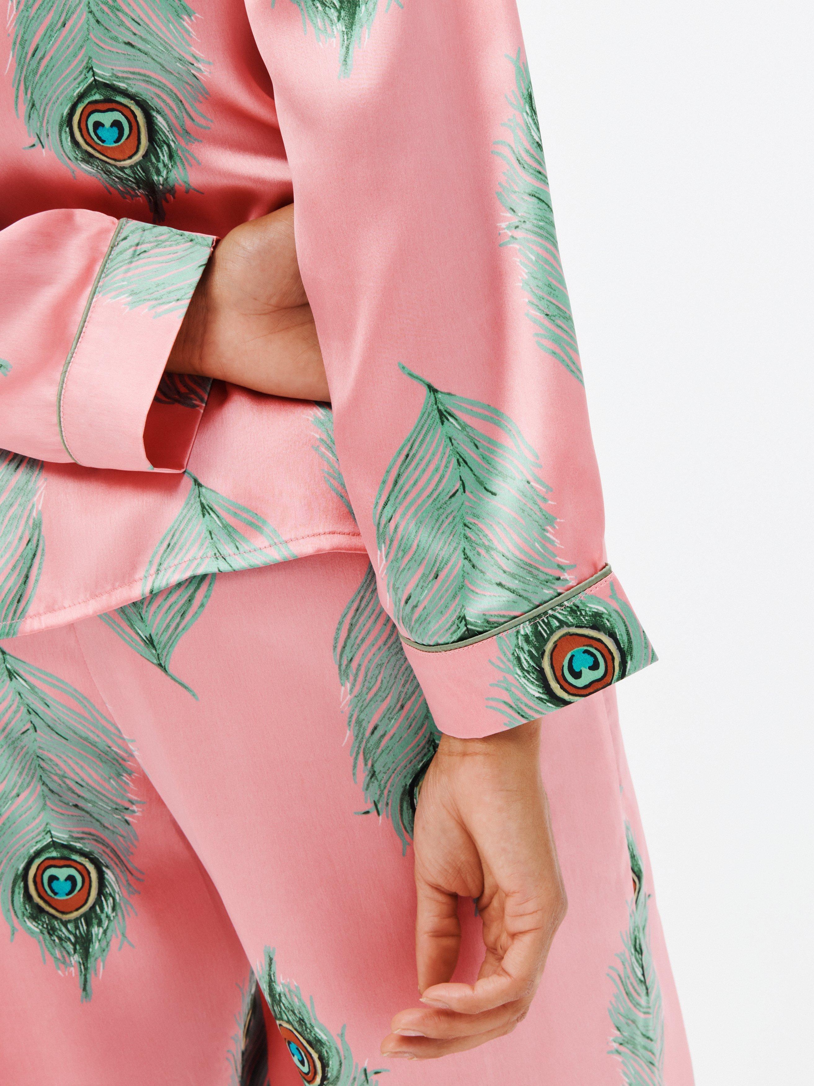 In a hand-painted peacock feather print, this long-sleeve pyjama set by Their Nibs is finished in satin with contrast piping.