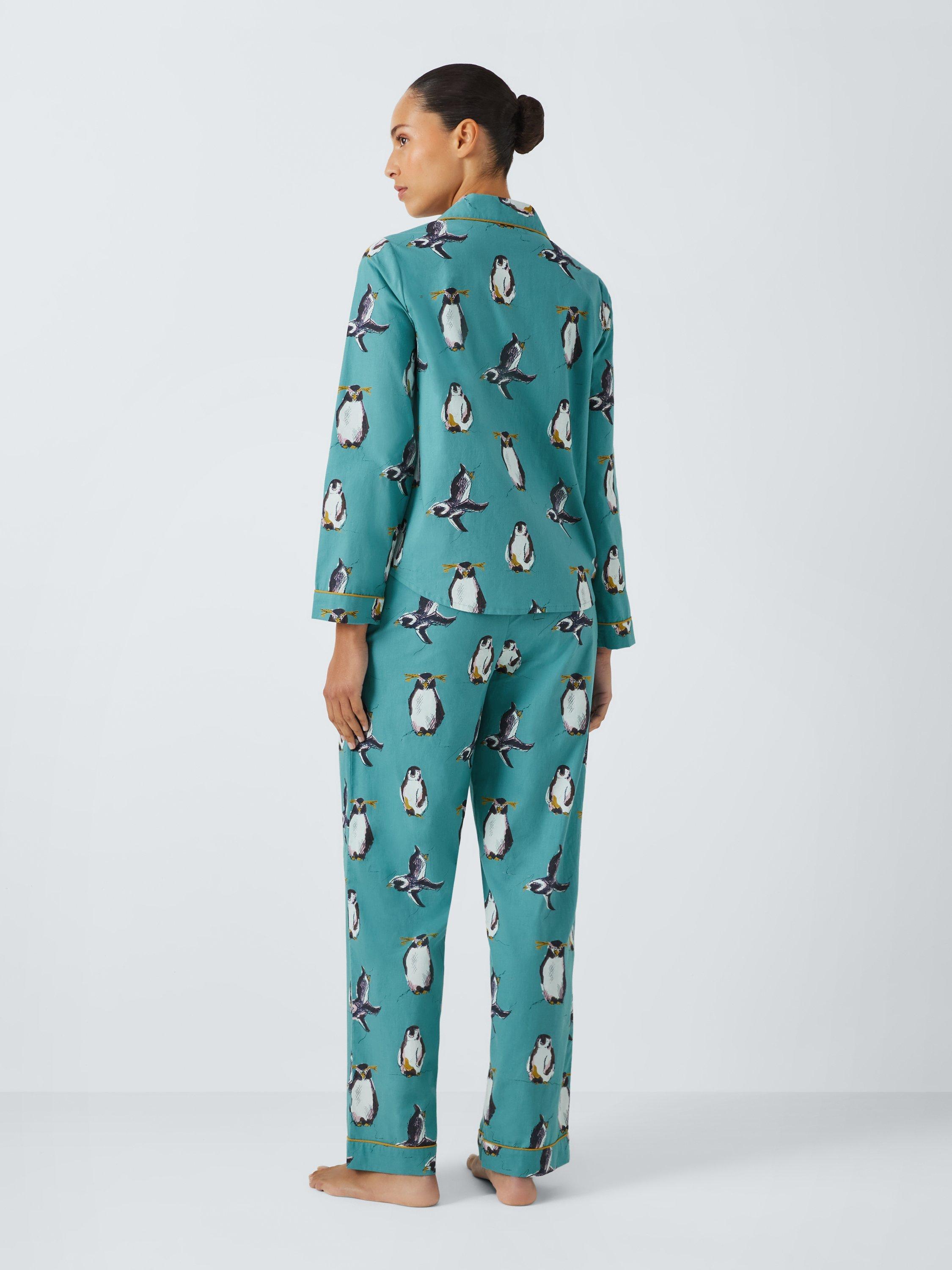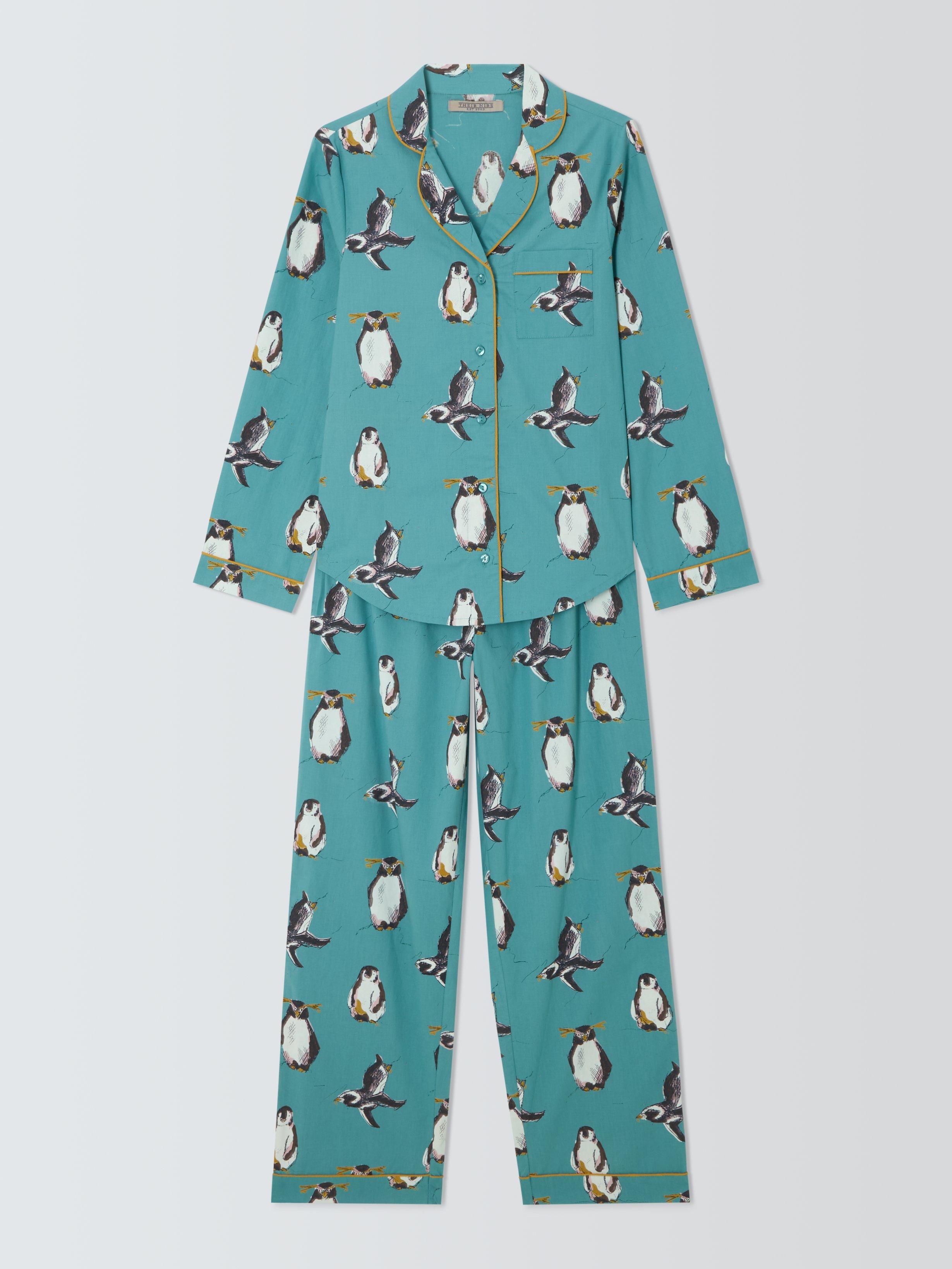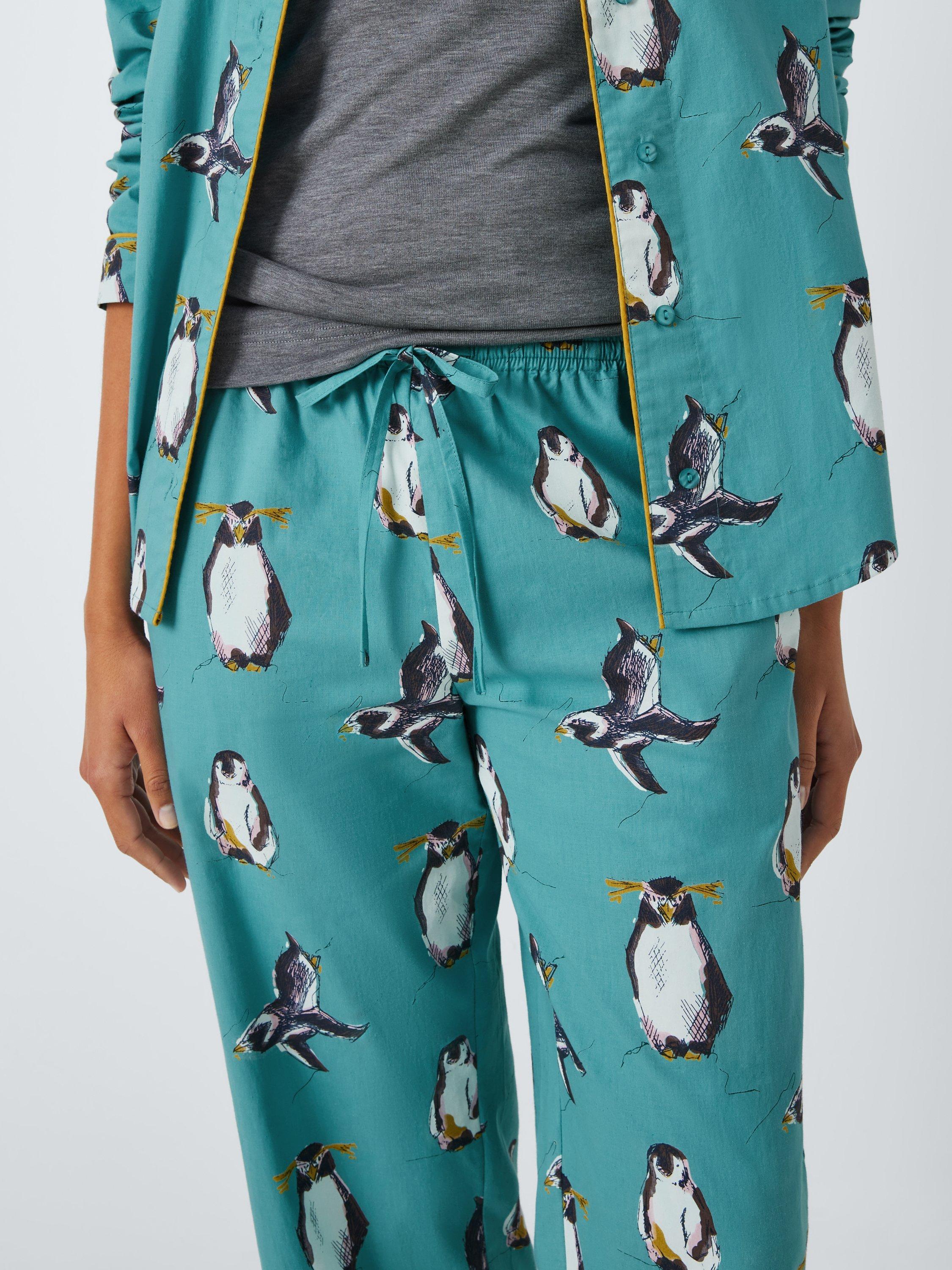 Perfect for early nights and long lie-ins, these mood-boosting pyjamas feature a loveable hand-drawn penguin print, capturing the cute details of a festive winter favourite on an icy base with warm pops of clour. A comfortable and generous take on a classic pyjama design allowing for free movement and the essential addition of pockets. This long leg and long sleeve pyjama set is made from durable, soft cotton that washes well, topped with contrast piping for elevated detail. The button-down shirt with a front pocket is the perfect match for the comfortable wide-leg trousers with an elasticated tie waist.>/p>