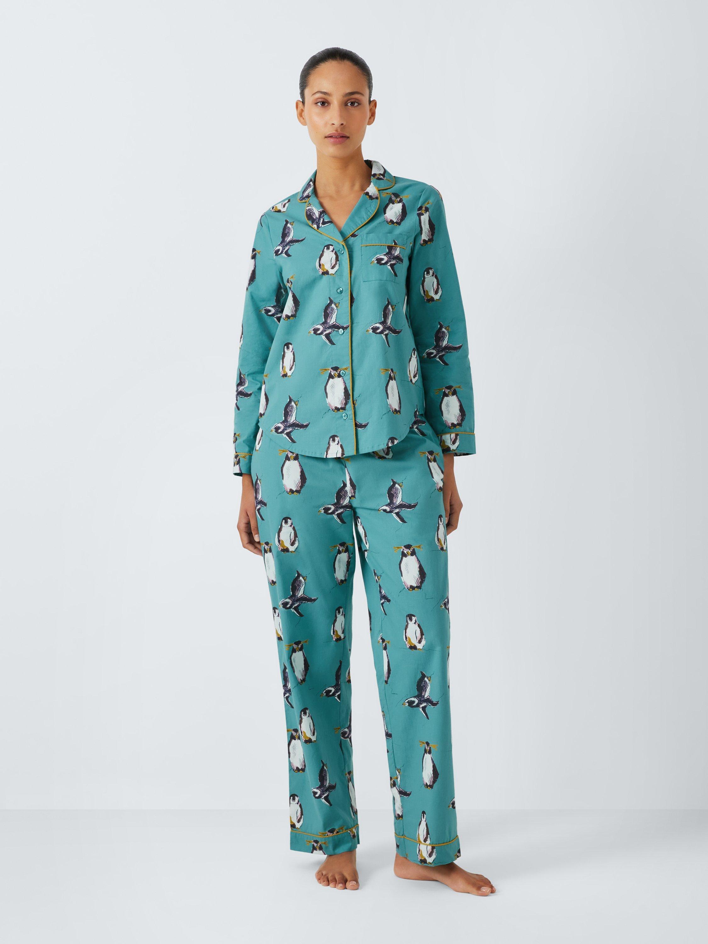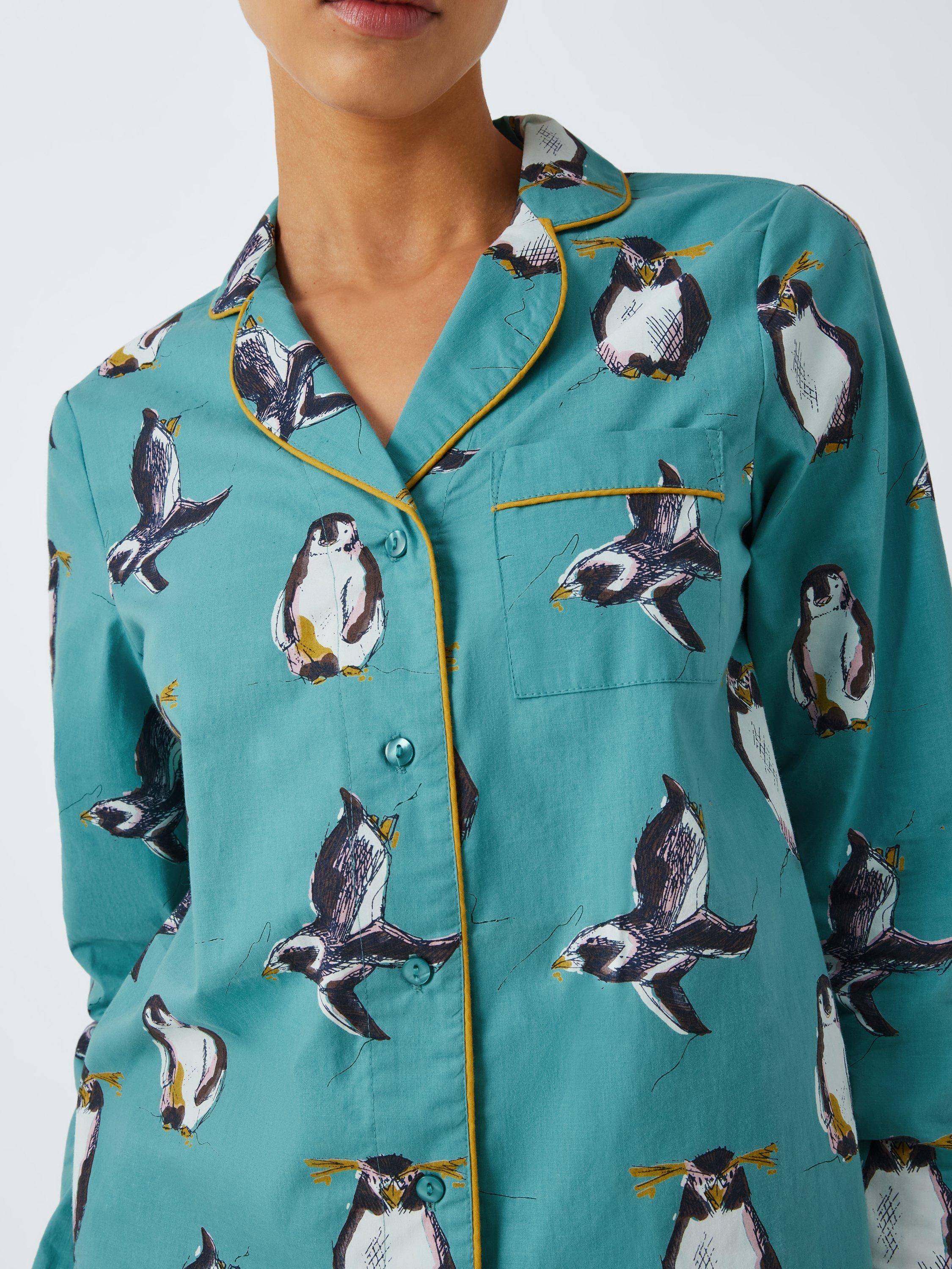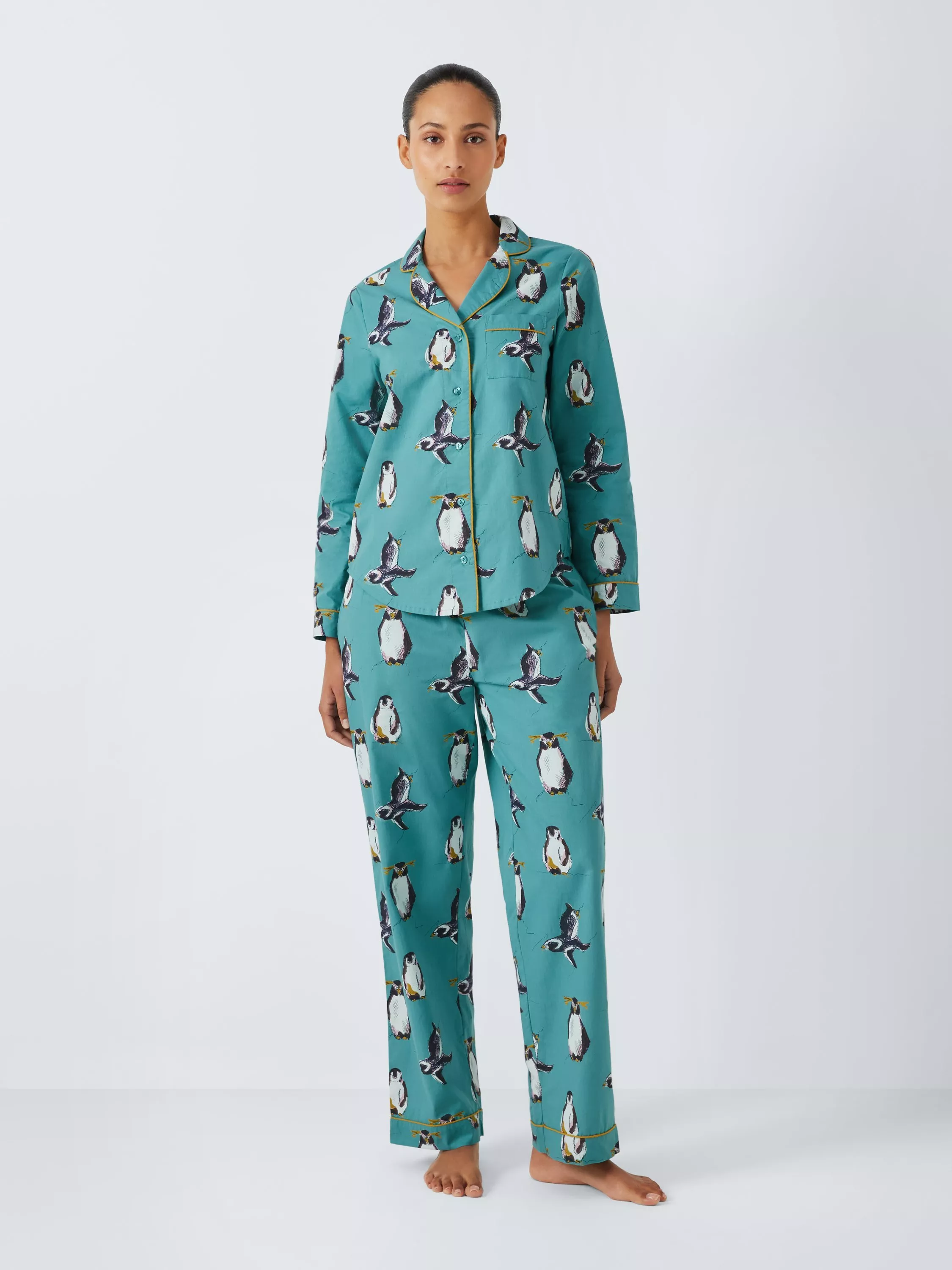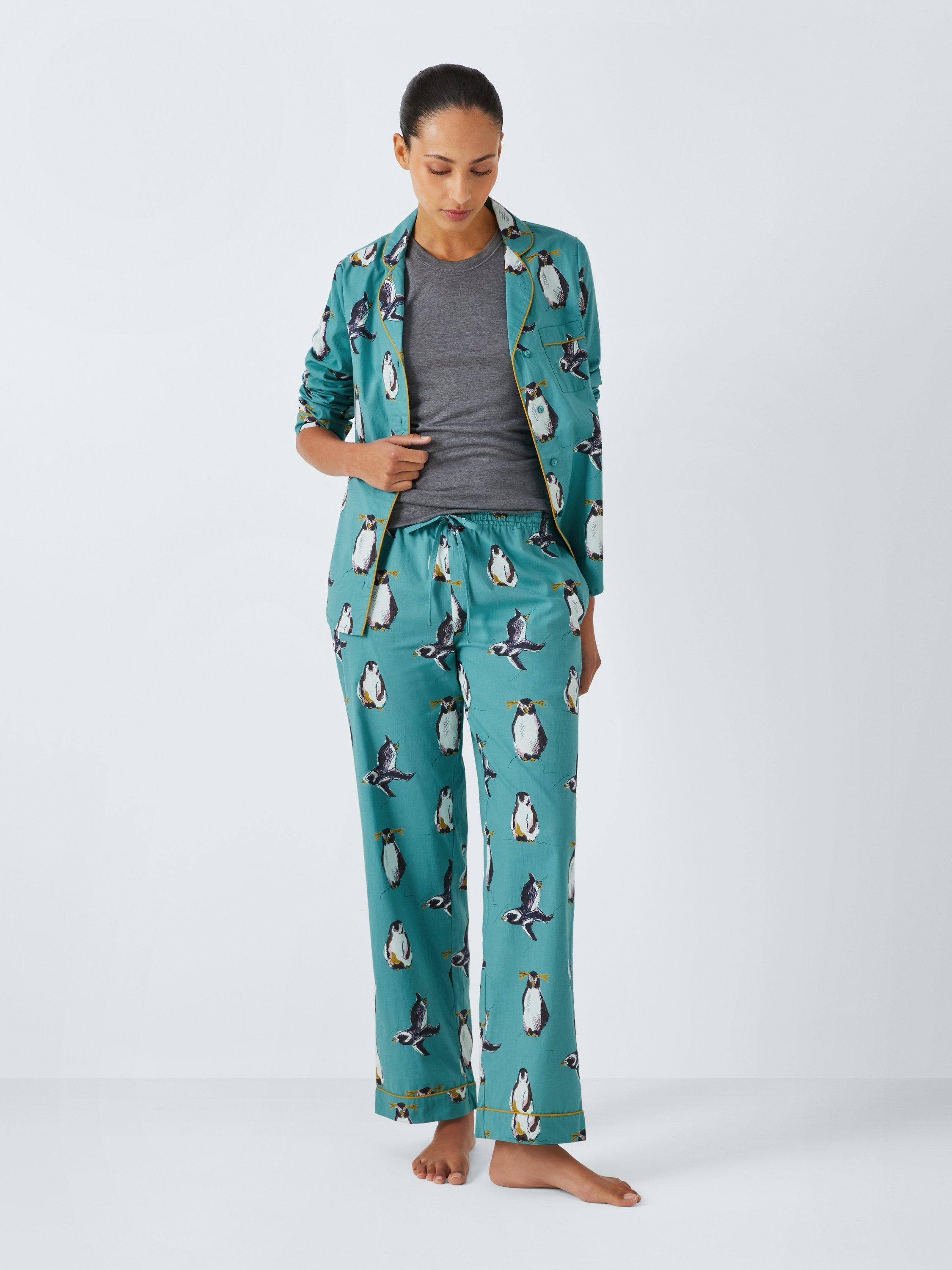 Perfect for early nights and long lie-ins, these mood-boosting pyjamas feature a loveable hand-drawn penguin print, capturing the cute details of a festive winter favourite on an icy base with warm pops of clour. A comfortable and generous take on a classic pyjama design allowing for free movement and the essential addition of pockets. This long leg and long sleeve pyjama set is made from durable, soft cotton that washes well, topped with contrast piping for elevated detail. The button-down shirt with a front pocket is the perfect match for the comfortable wide-leg trousers with an elasticated tie waist.>/p>