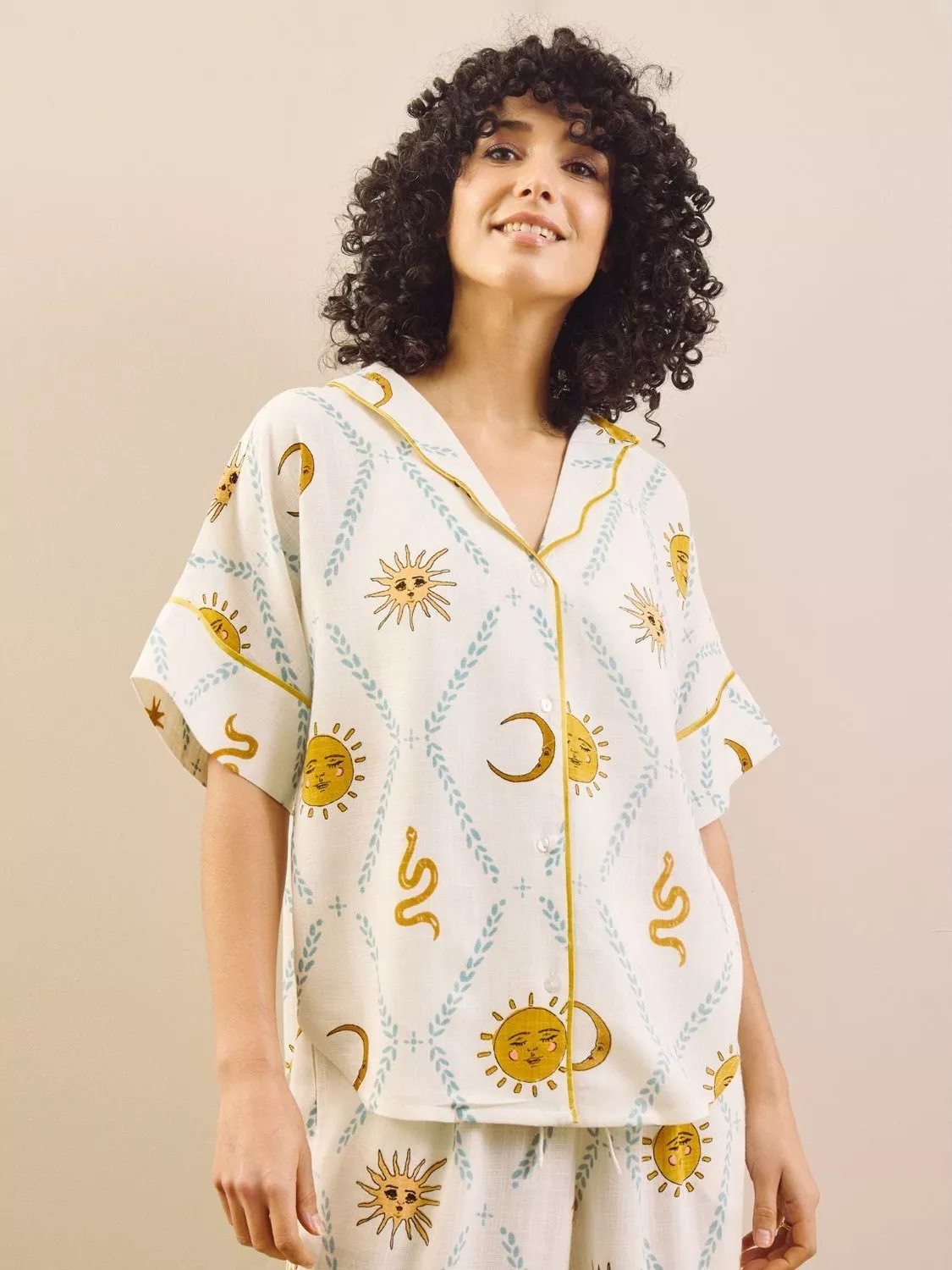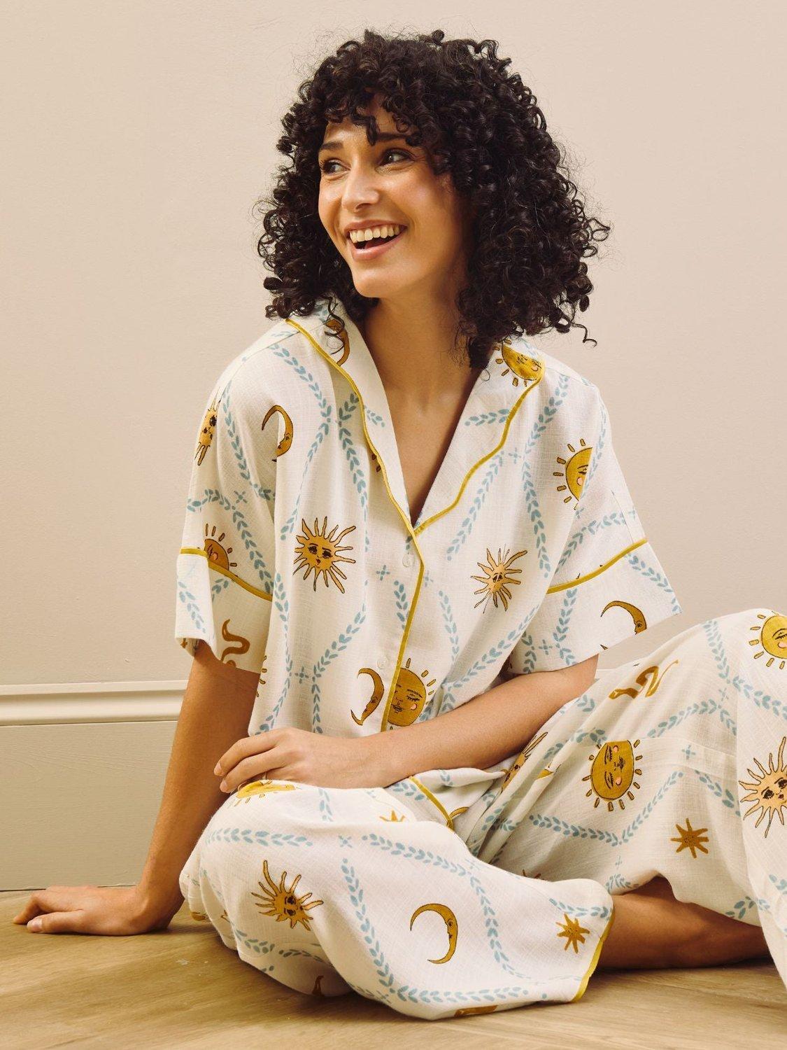 Light, breathable and made for warm evenings, this oversized pyjama set is cut from a soft linen-blend fabric for easy, relaxed wear. Featuring a short-sleeved button-through top and loose, wide-leg trousers, it’s finished in a playful Summer Solstice print returning moons and suns for effortless lounging, day or night.