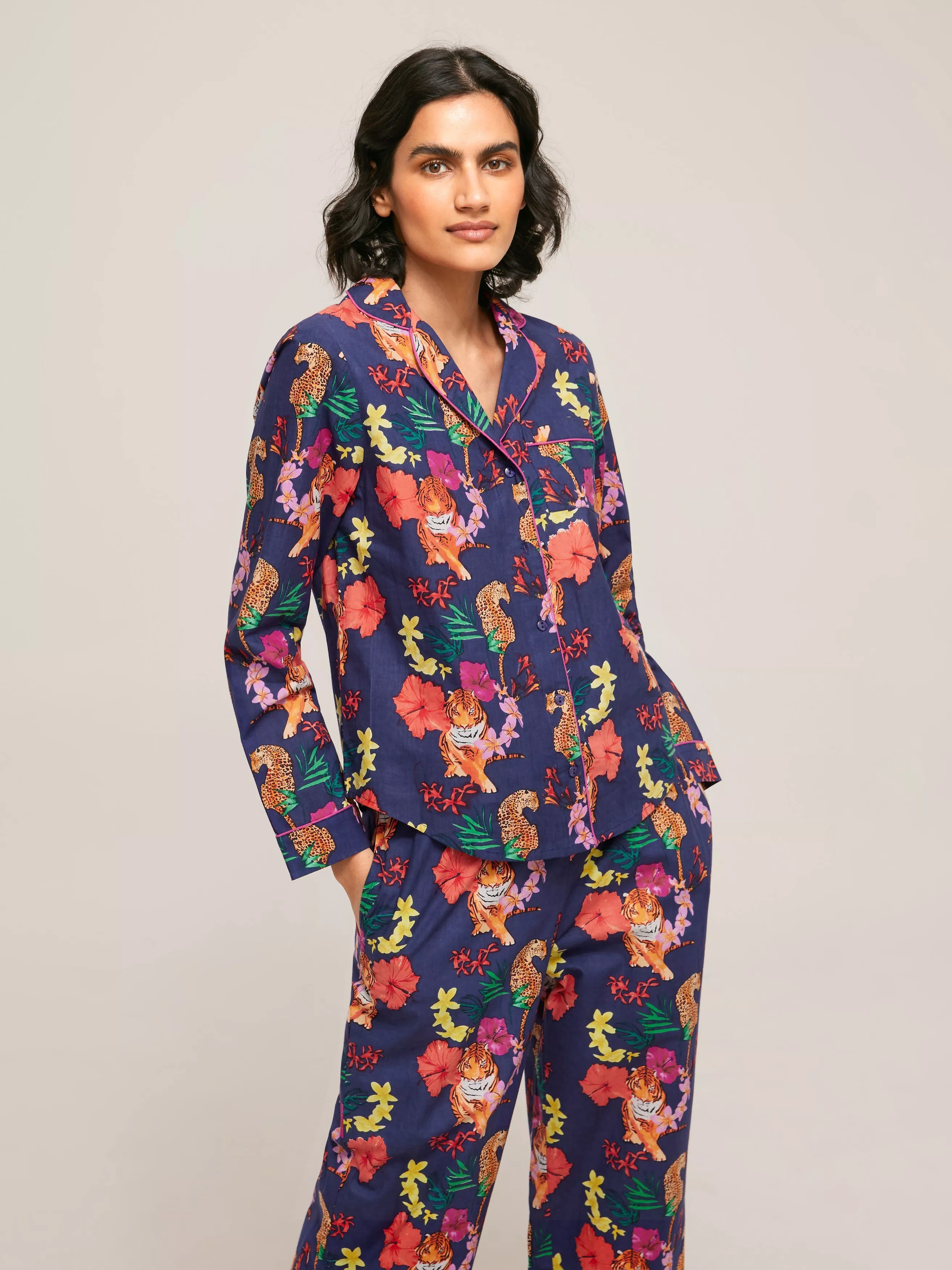 Perfect for early nights and long lie-ins, these pyjamas feature a hand-painted tropical design in bright, wild colours that beautifully contrast against the deep navy base, look out for Their Nibs' favourite big cats in amongst the tropics.