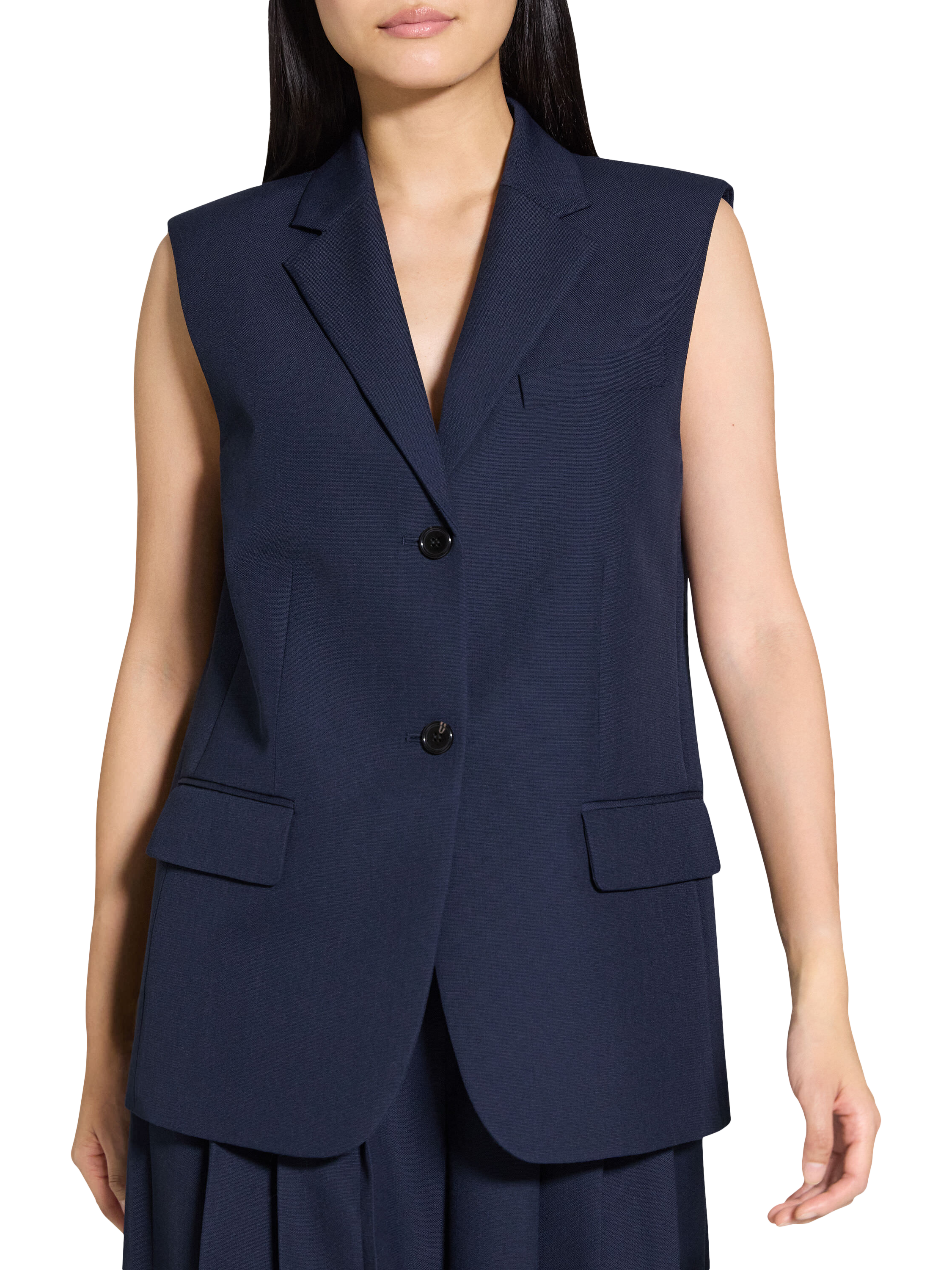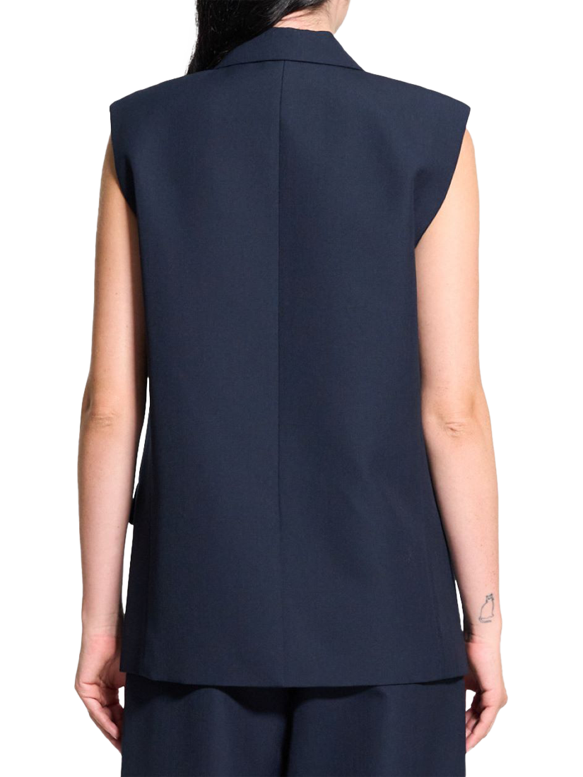 A two-button boxy oversized vest with traditional pocket details at front.