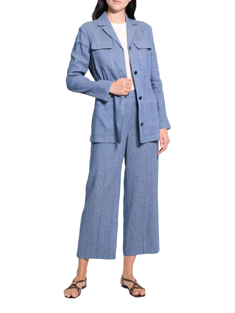 A jacket with exposed button closure, two chest and two lower flap patch pockets, a yoke at back, separate cuffs, and a vented sleeve with a button closure