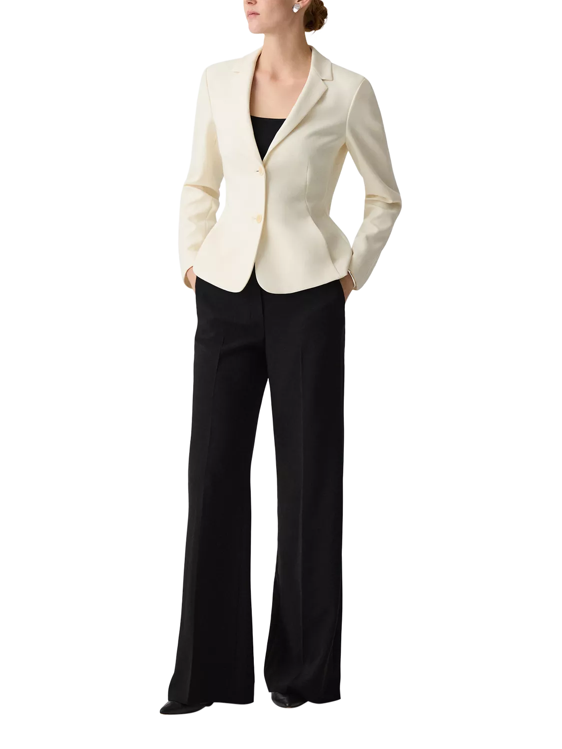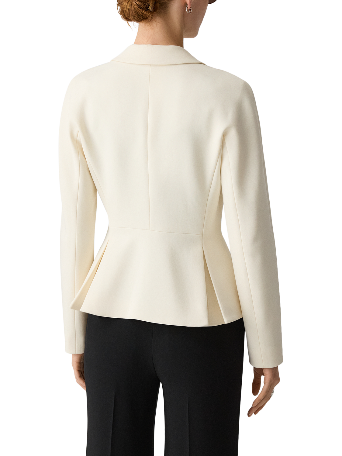A soft blazer with darting details, dolman back sleeve for softness, on seam pockets, cinched waistline and slight feminine peplum.
