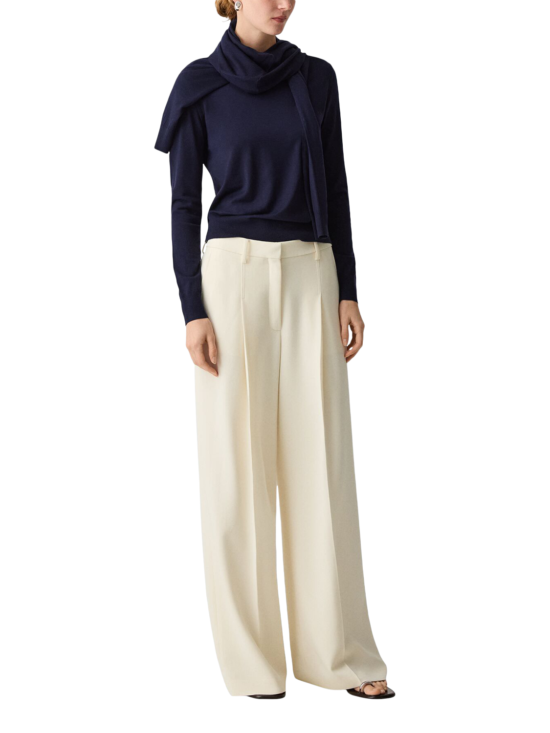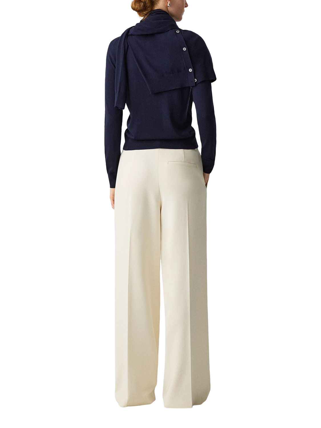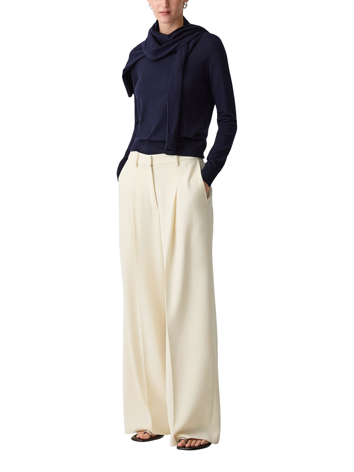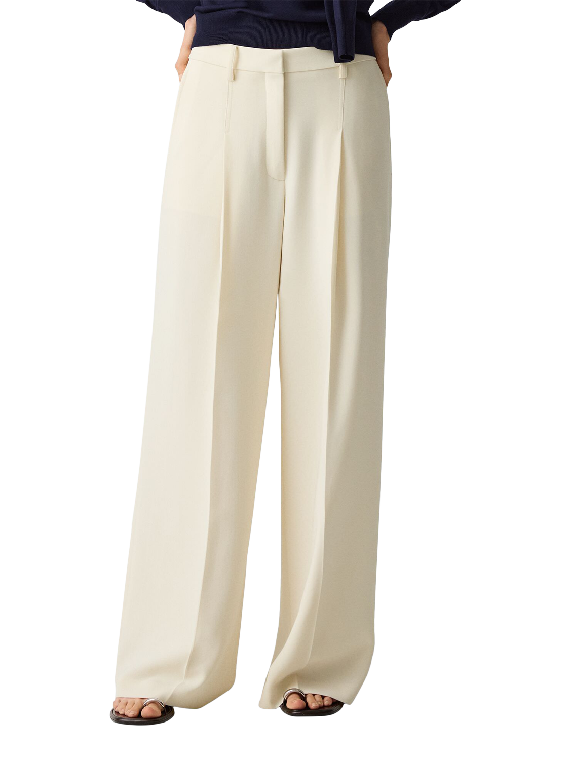 A wide leg trouser with slight A line shaping, a single deep pleat, slash pockets, and a single welt pocket at back.