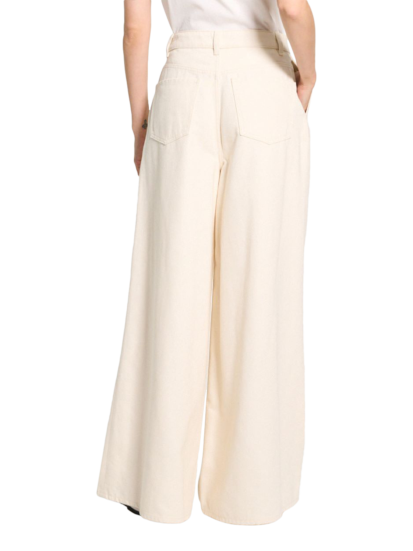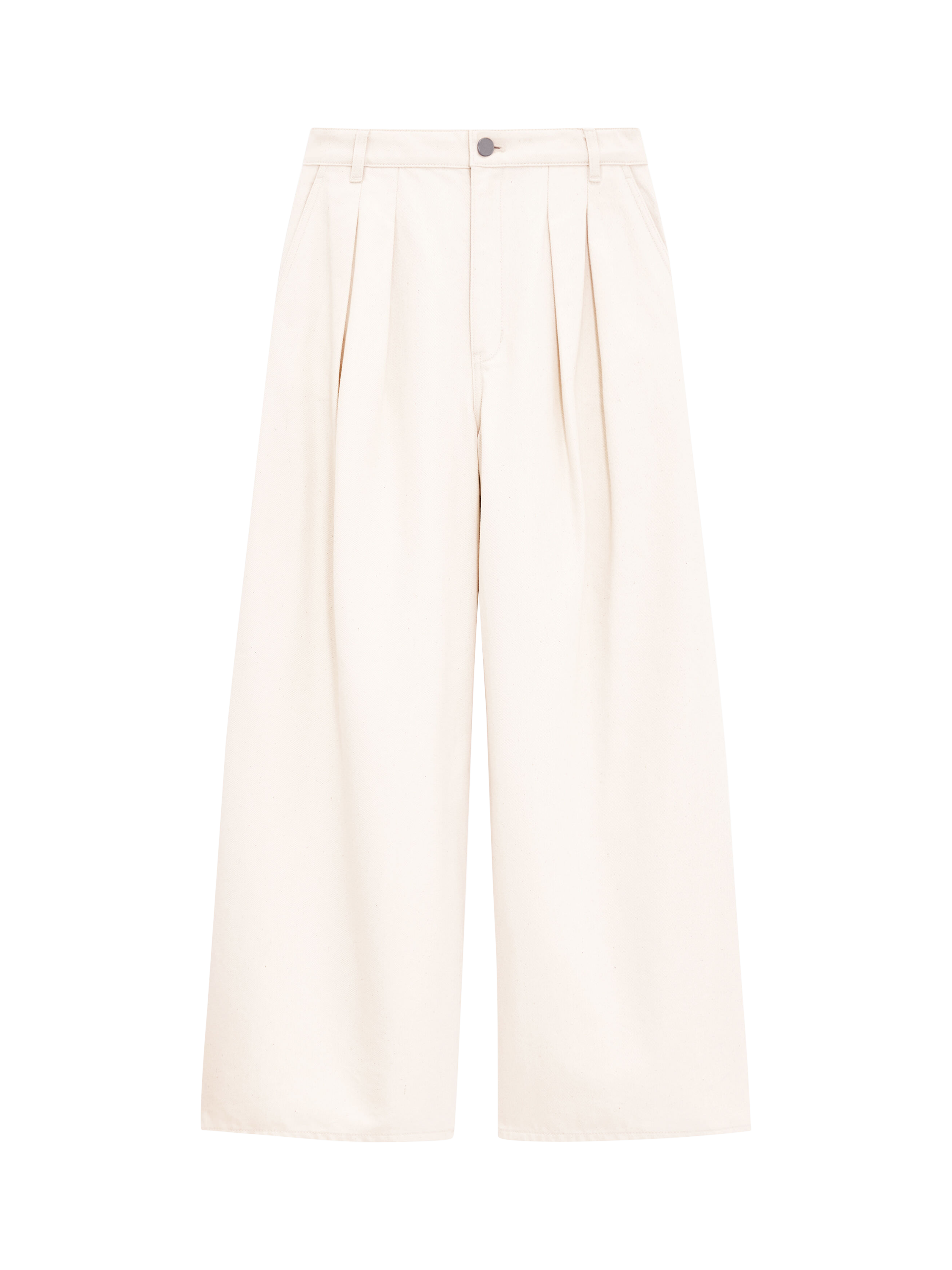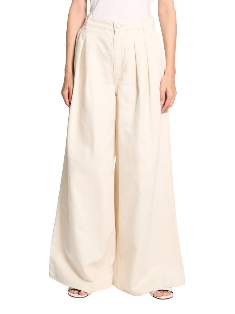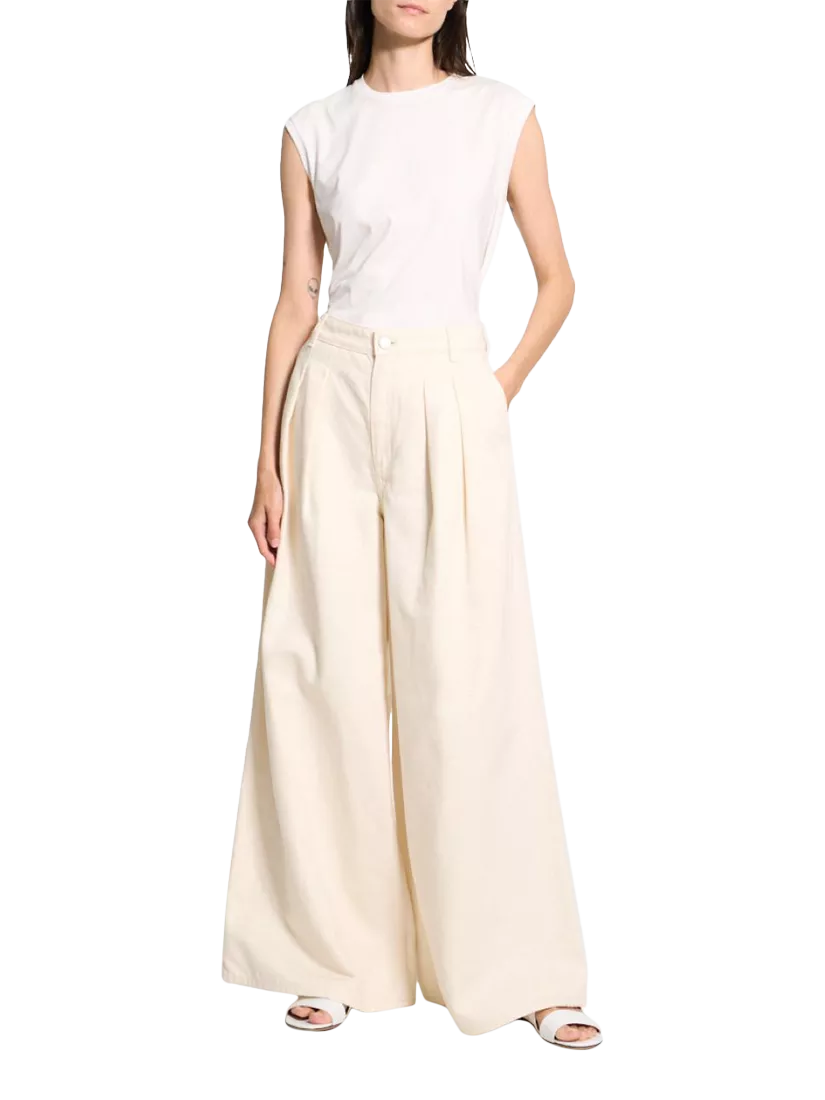 A lower rise wide leg pant with triple pleats and slash pockets at front, welt pockets at back, and classic belt loops.