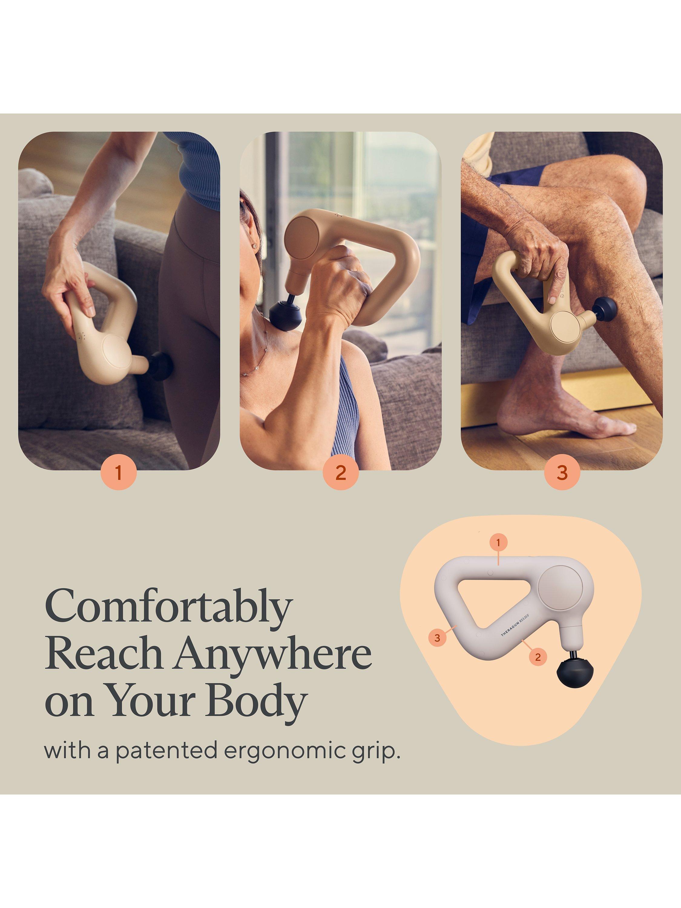 Patented triangle grip to reach more of your body than other devicesTheragun Relief features our easy-to-use patented triangle grip, so you can comfortably reach anywhere on your body without help from another person.