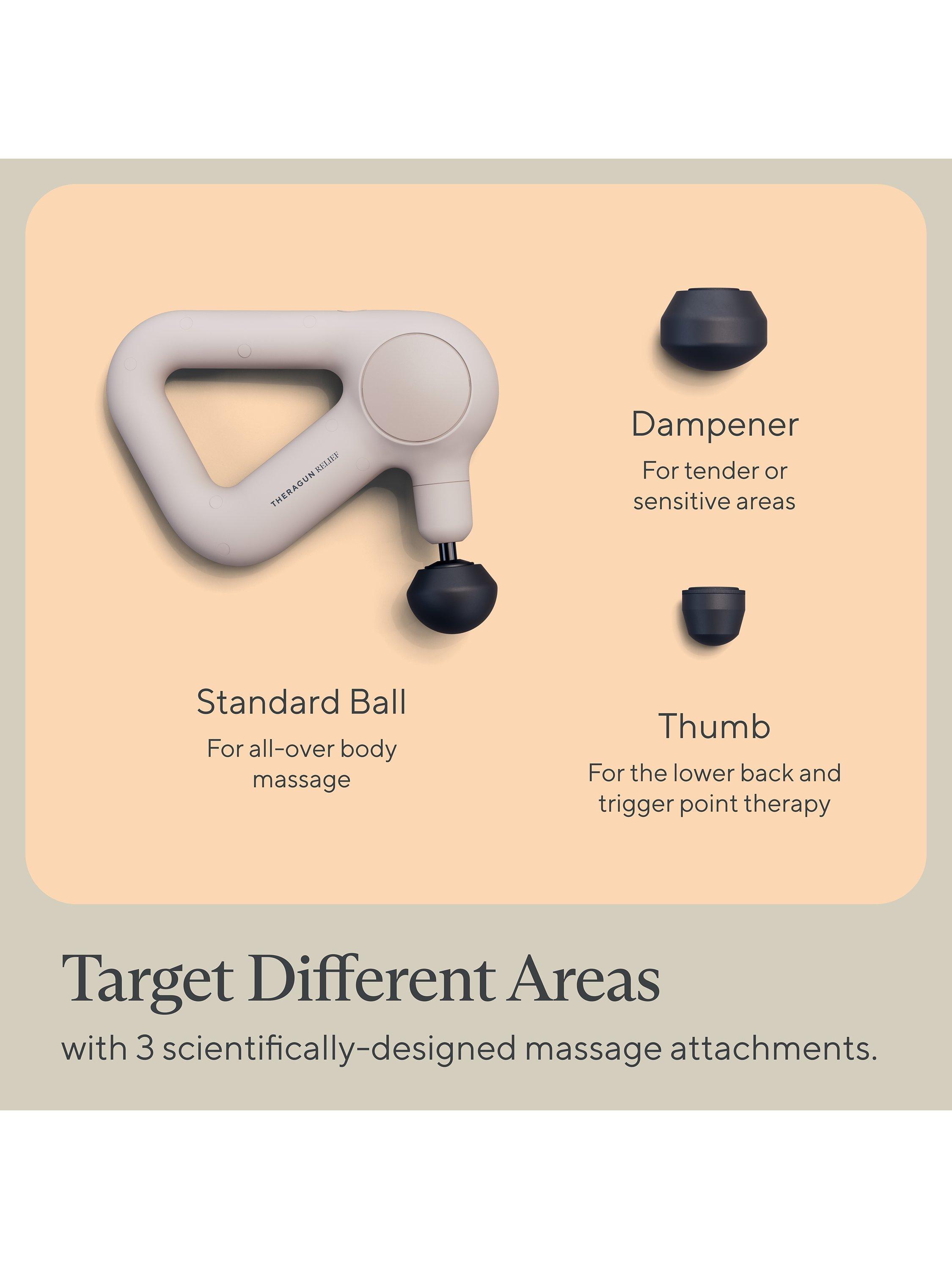 3 scientifically-designed attachments to treat different areas of your bodyTheragun Relief includes 3 unique attachments, designed to target different types of muscle pain: