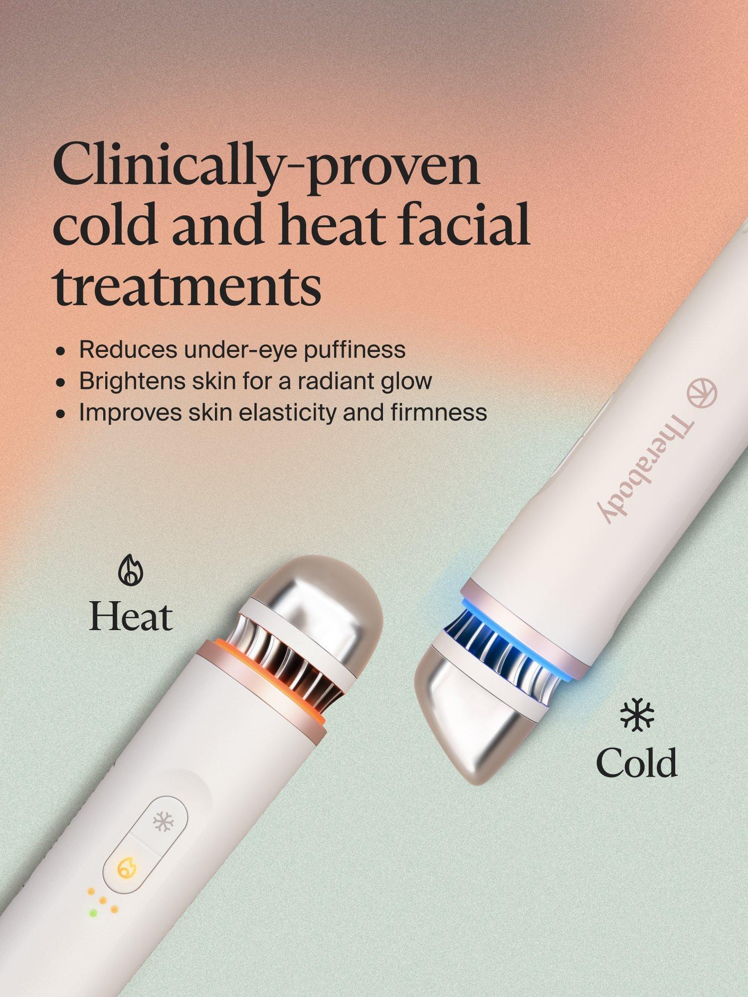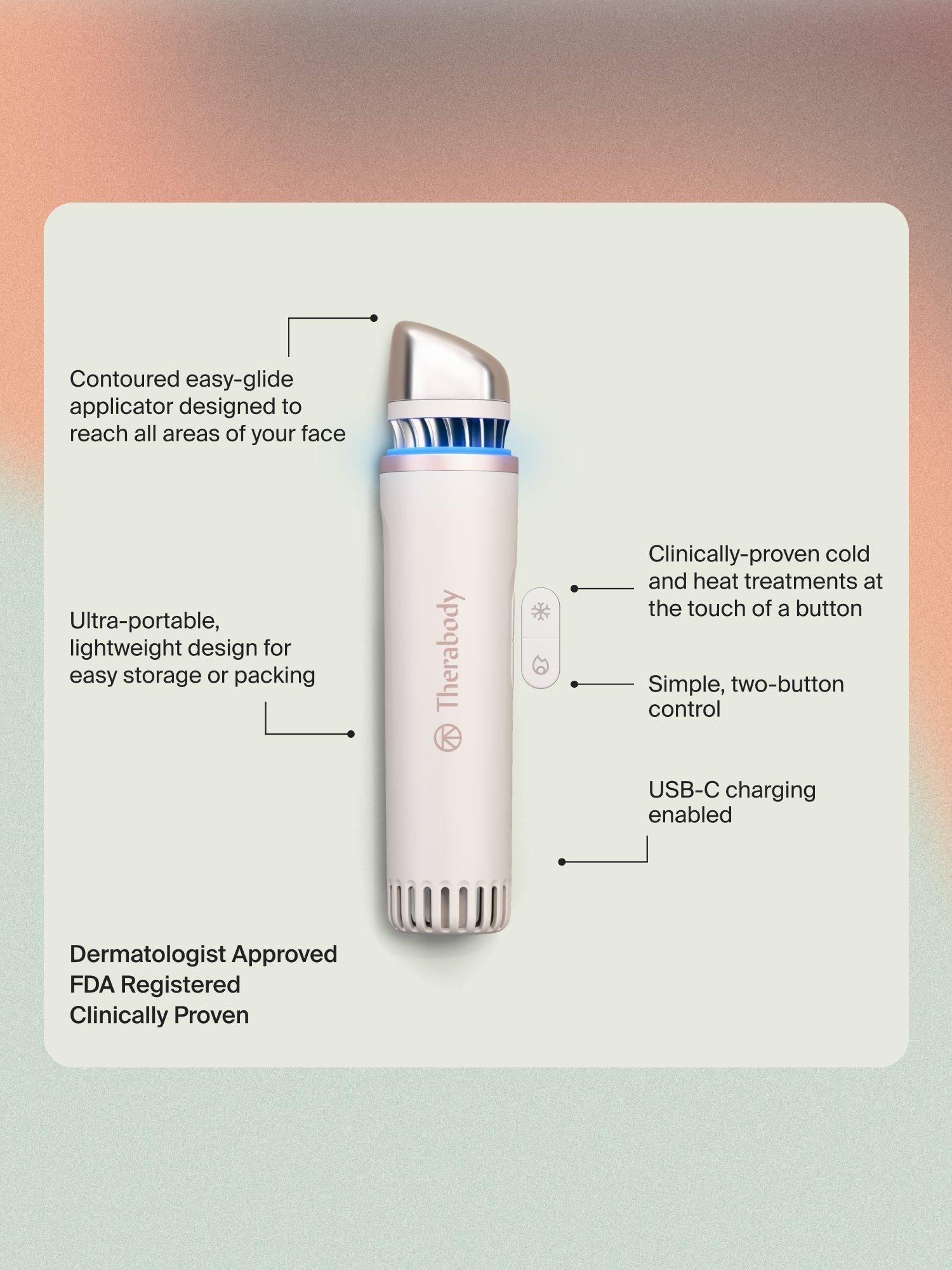 Peace out, puffiness. Say hello to your new skincare hero, the first-of-its-kind TheraFace Depuffing Wand that features cold and heat facial treatments in one portable device for use at home and on-the-go. Clinical studies showed decreased puffiness and dark circles under the eyes, and enhanced radiance. It delivers science-backed temperatures that are safe for delicate skin, ensuring consistent and reliable results across your entire face. Choose from 3 preset temperature levels suitable for all skin types. The wand reaches every corner and crevice of your face with its contoured applicator tip, giving you all-over, feel-good results you can see in just minutes.