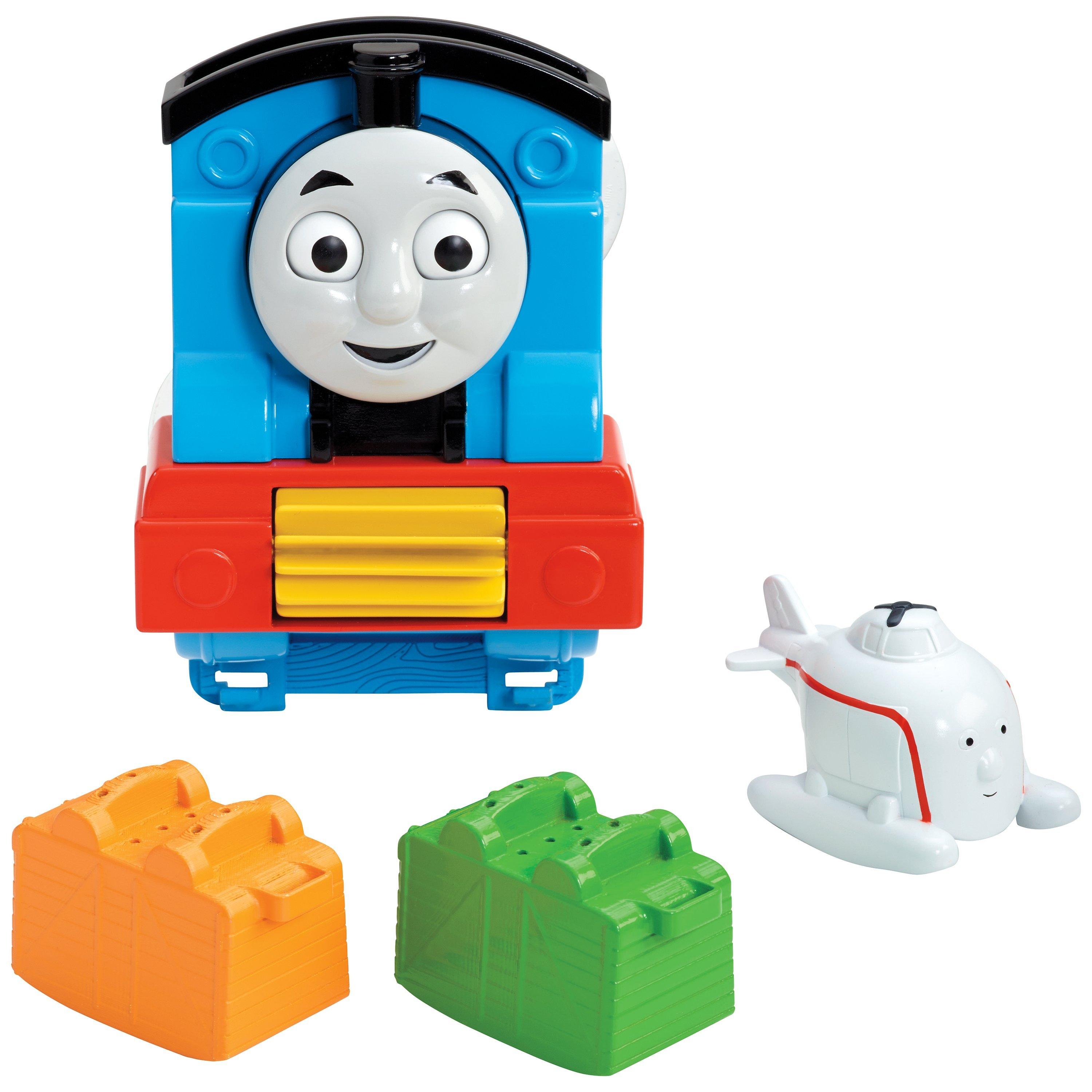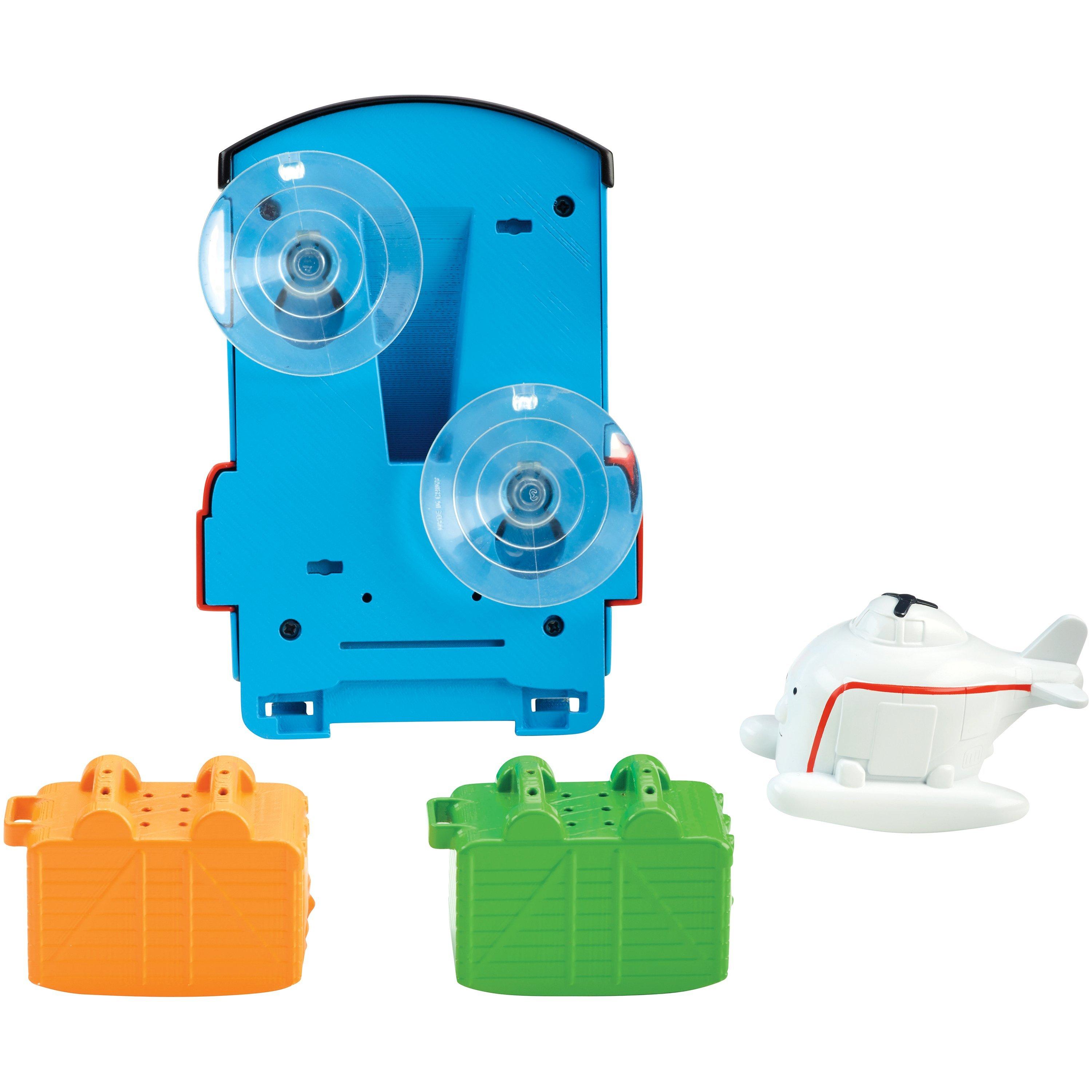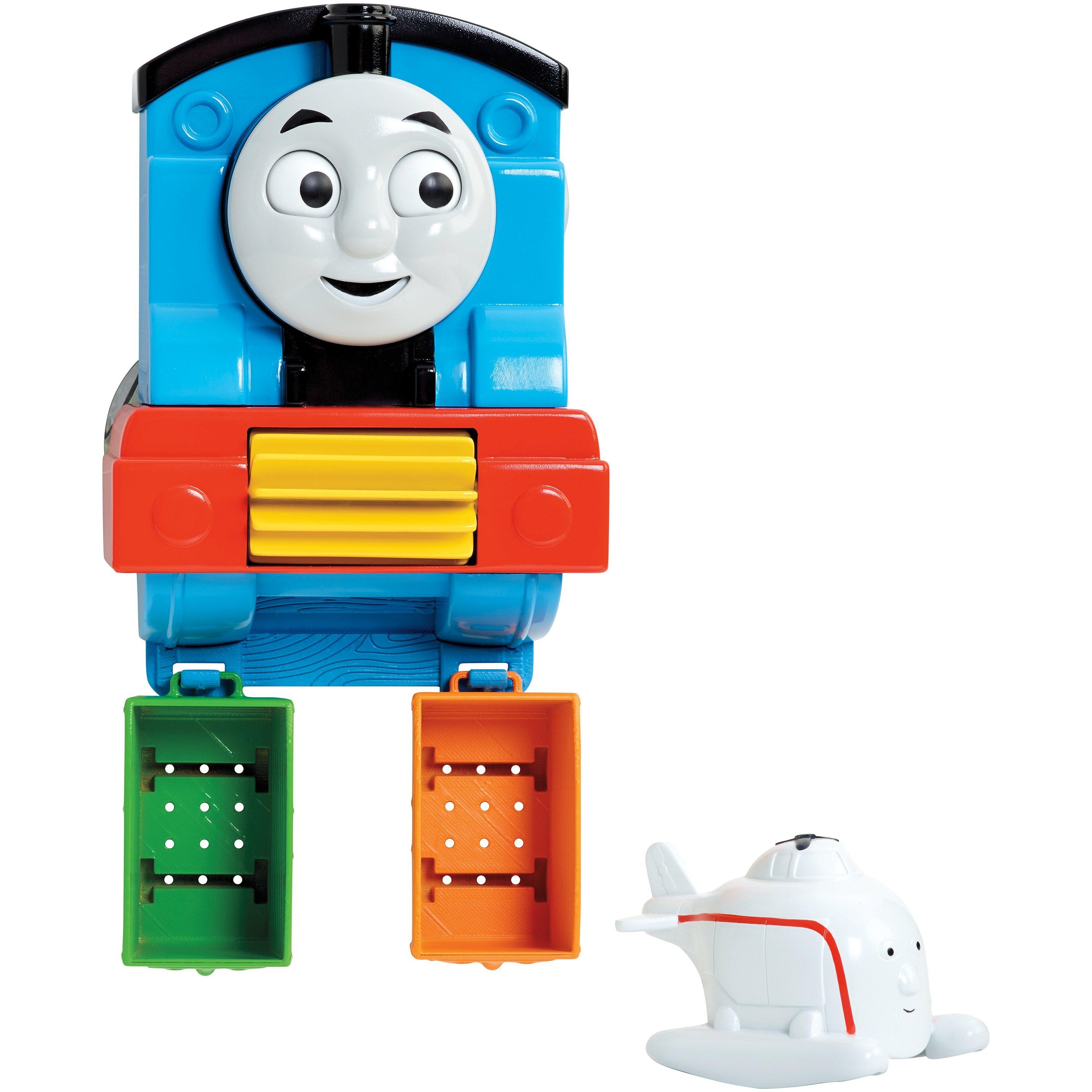 Bath time becomes an adventure as children use Harold and the Troublesome Trucks to scoop up water and pour it behind Thomas' funnel. As the water flows down, the spinner turns and Thomas' eyes move back and forth!