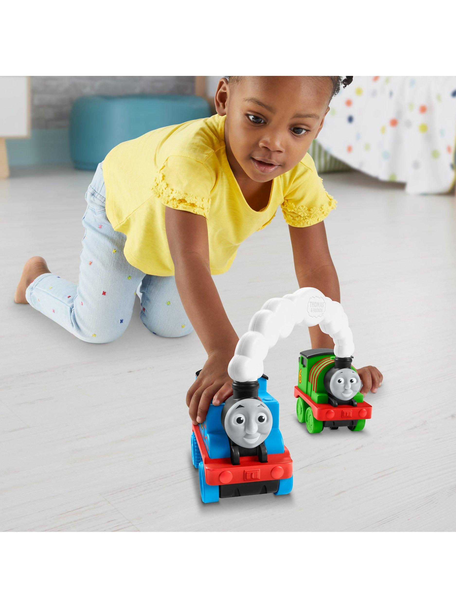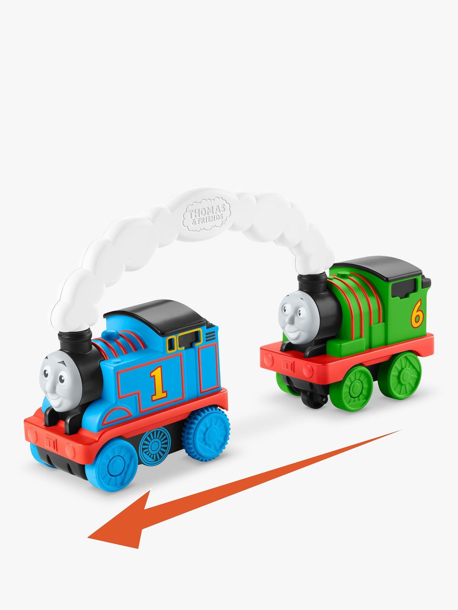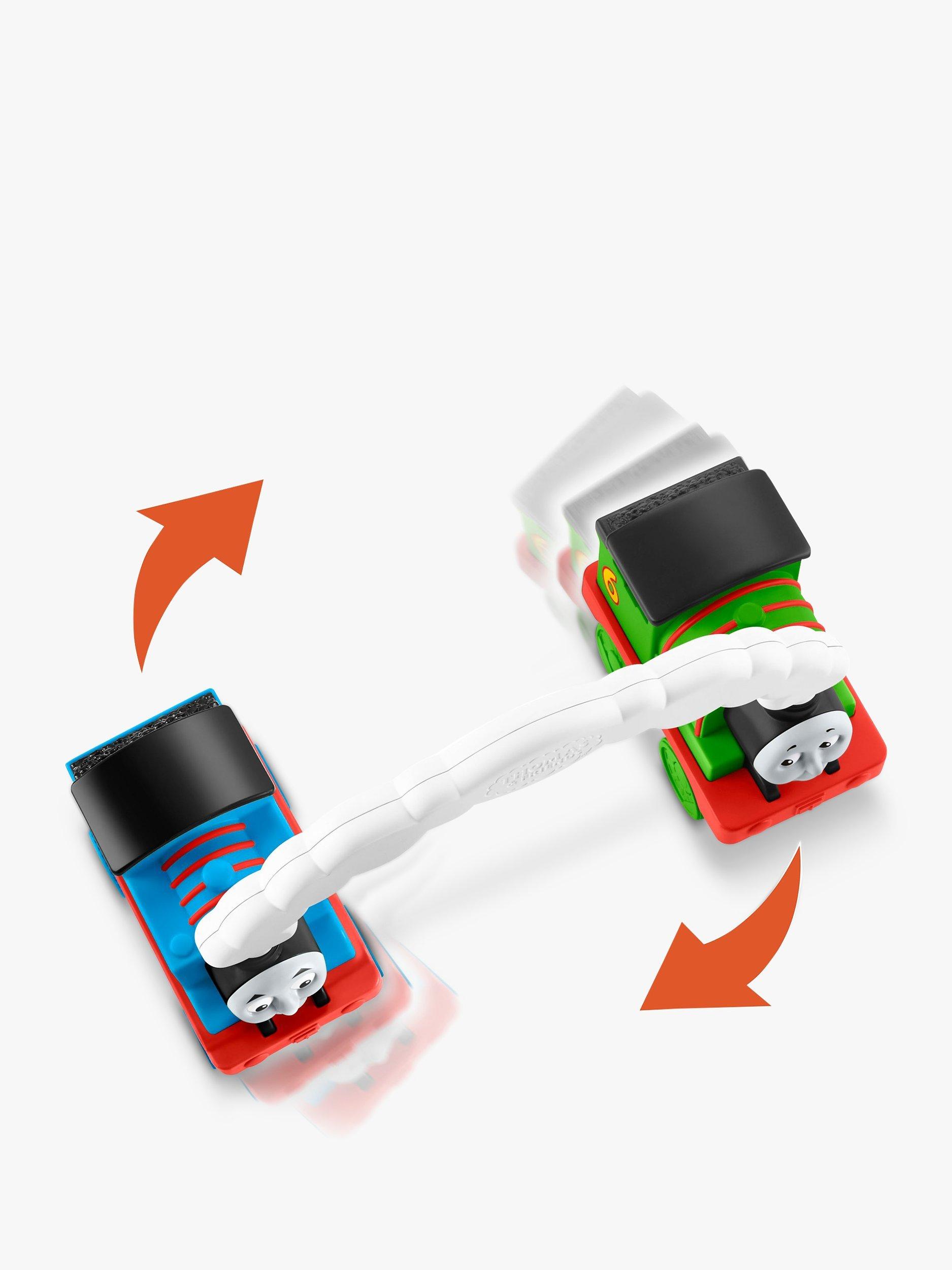 Little conductors can zoom all around Sodor and beyond, with the Thomas & Friends Race & Chase R/C from Fisher-Price. These large remote-controlled train engines of Thomas the Tank Engine and Percy are linked with a steam cloud handle.