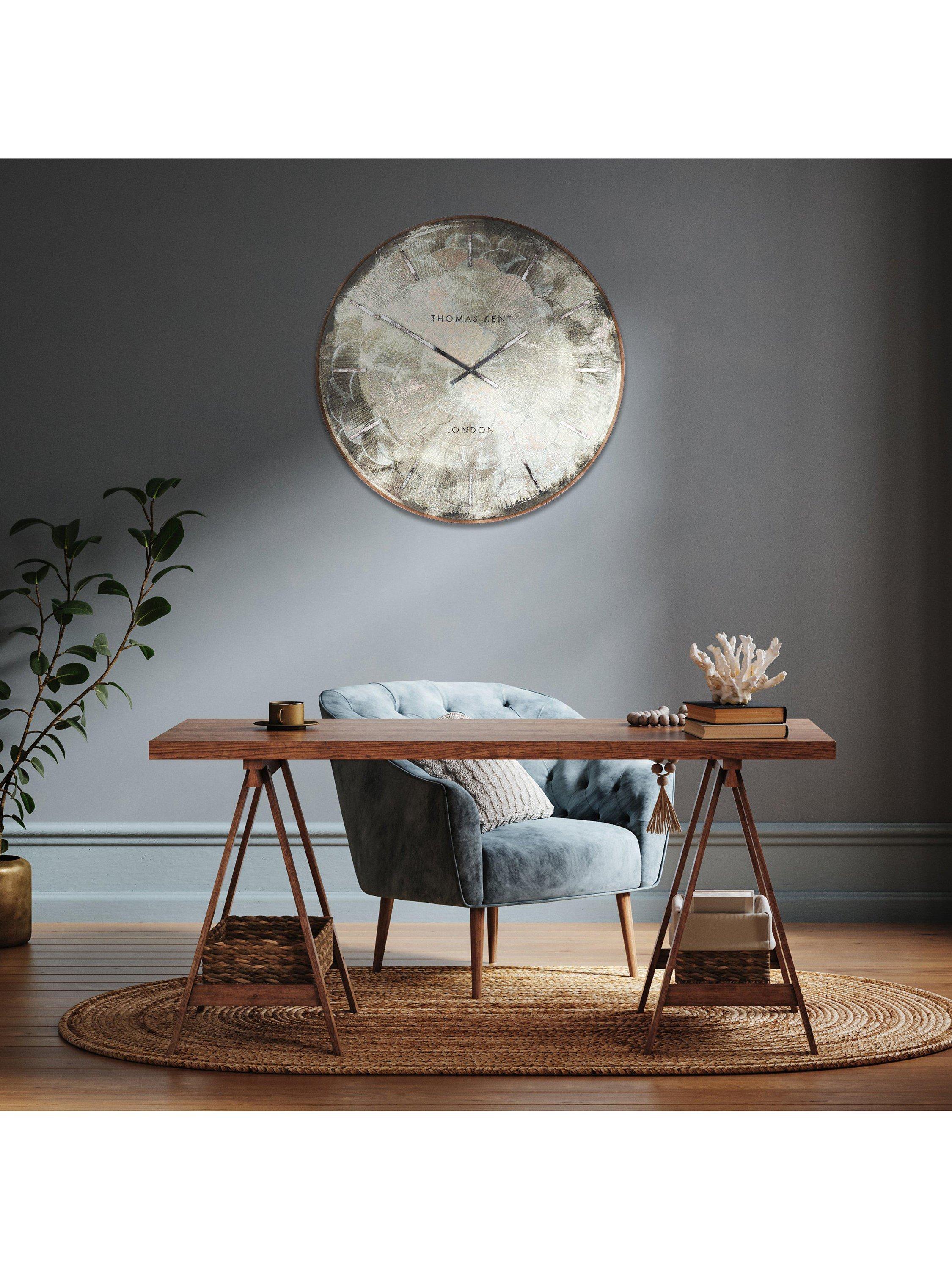Taking its influence from the 1920s, the Charleston Grand Clock from Thomas Kent takes that era's popular scallop motif as its cue. The oversized design creates a modern statement piece for your wall. Designed with distressed mirrored hour markers and clock hands, it's completed with a silver-foiled rim.