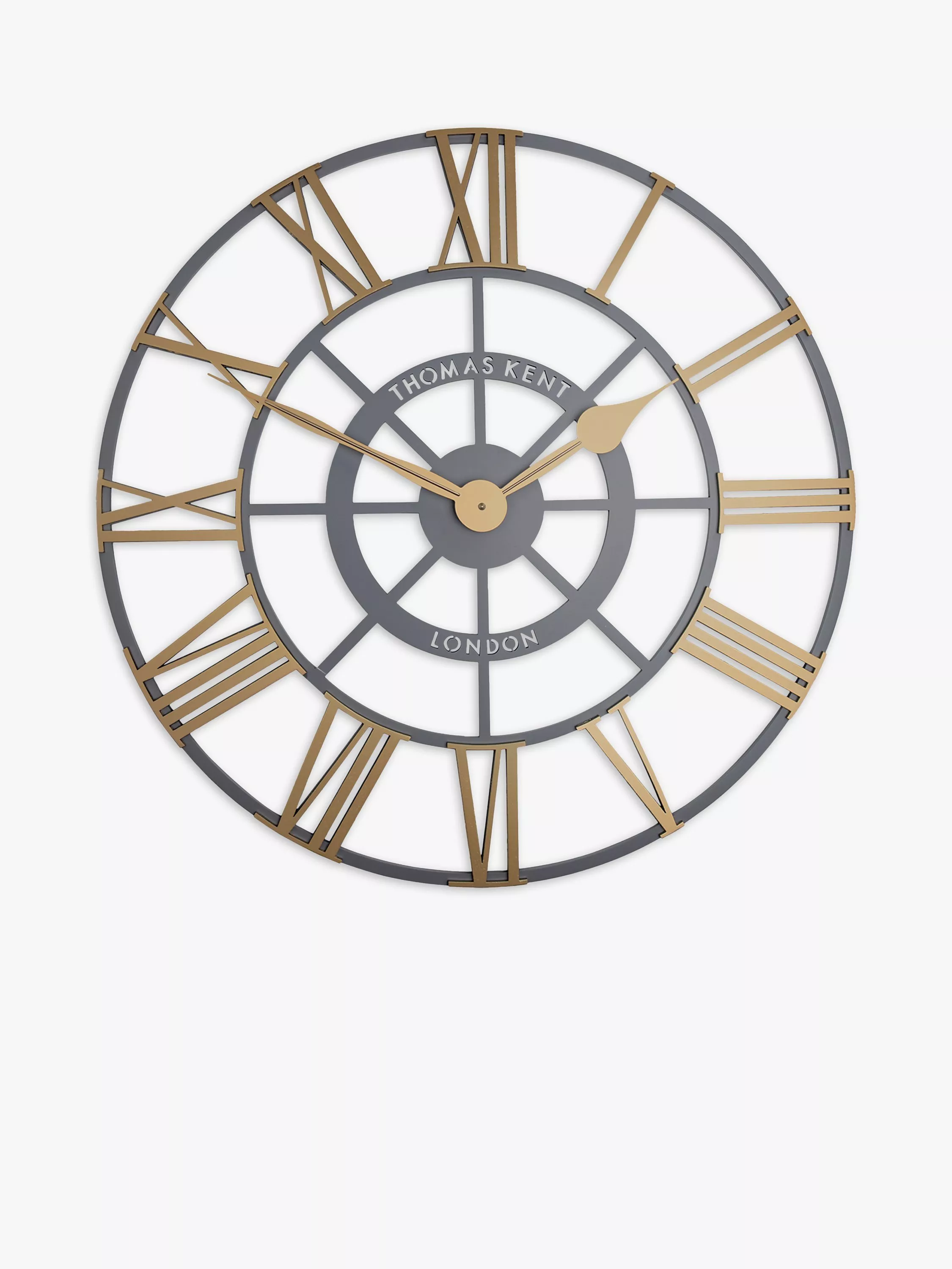 Inspired by early industrial design, Thomas Kent's Evening Star skeleton wall clock has traditional Roman numerals on glass panels, allowing your wall decor to show through. It's finished with contrasting clock hands.