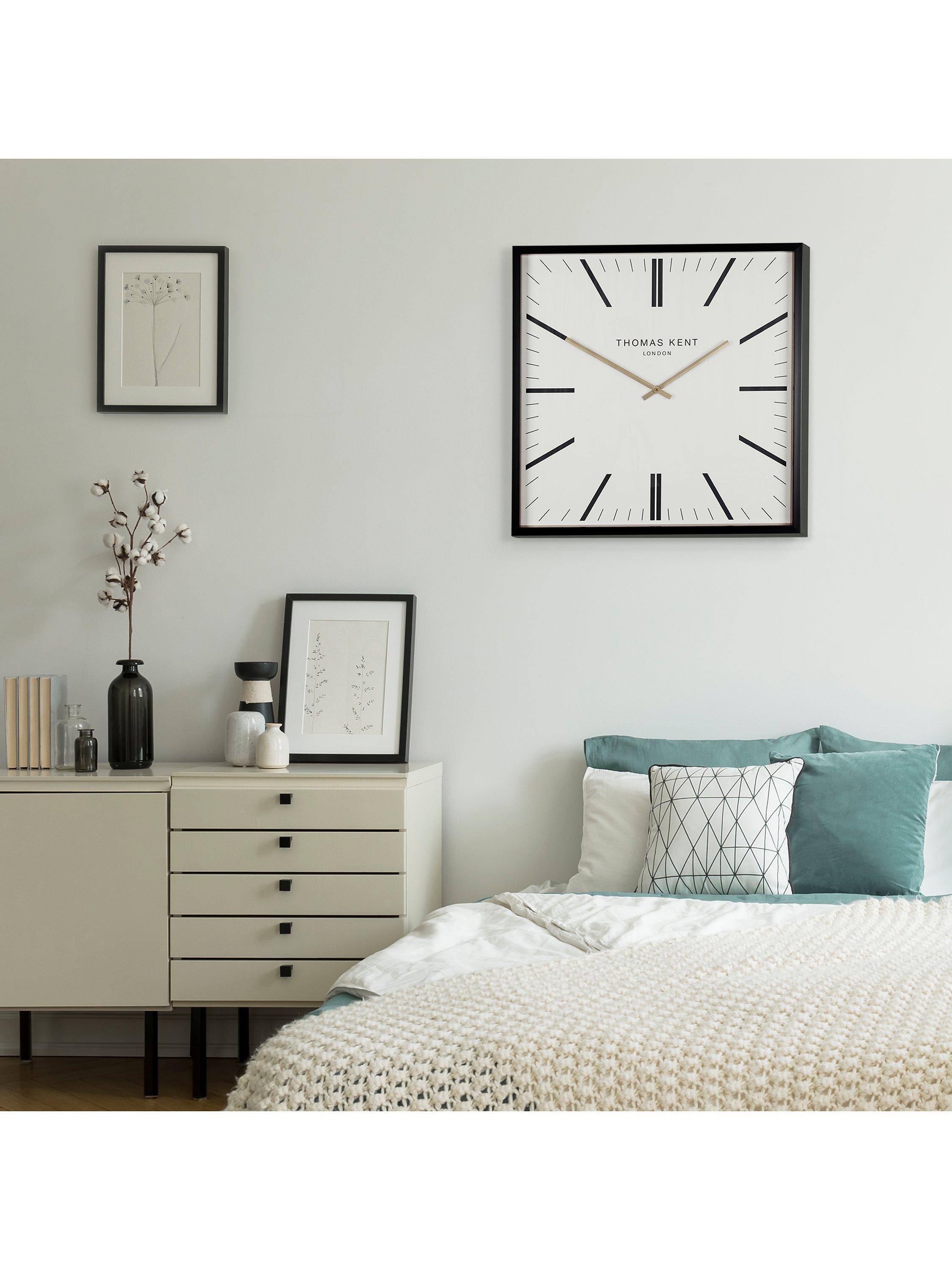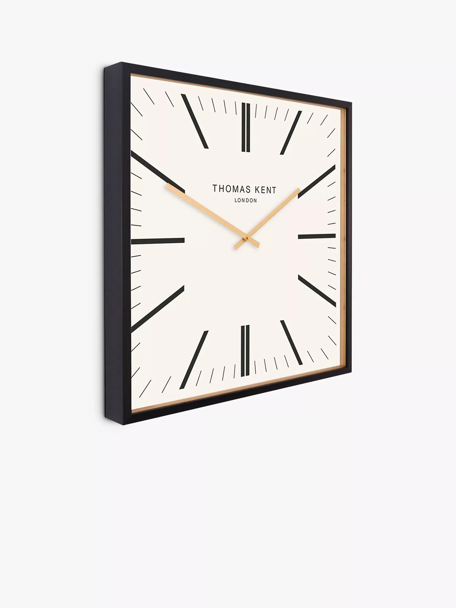 A contemporary square-shaped Garrick wall clock from Thomas Kent with a metallic casing in a matt finish and a contrasting bezel, hour markers and clock hands.