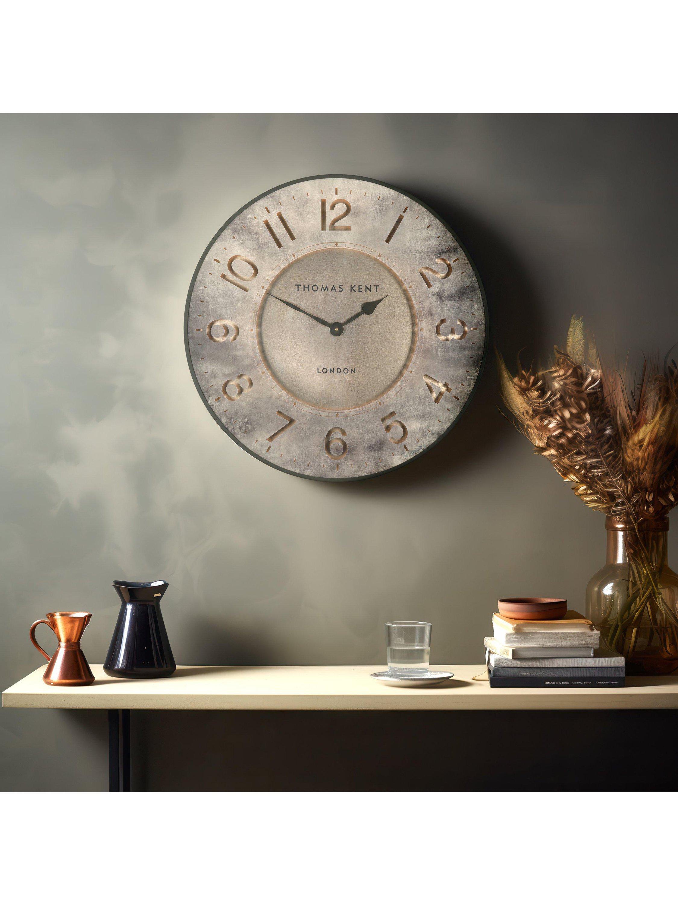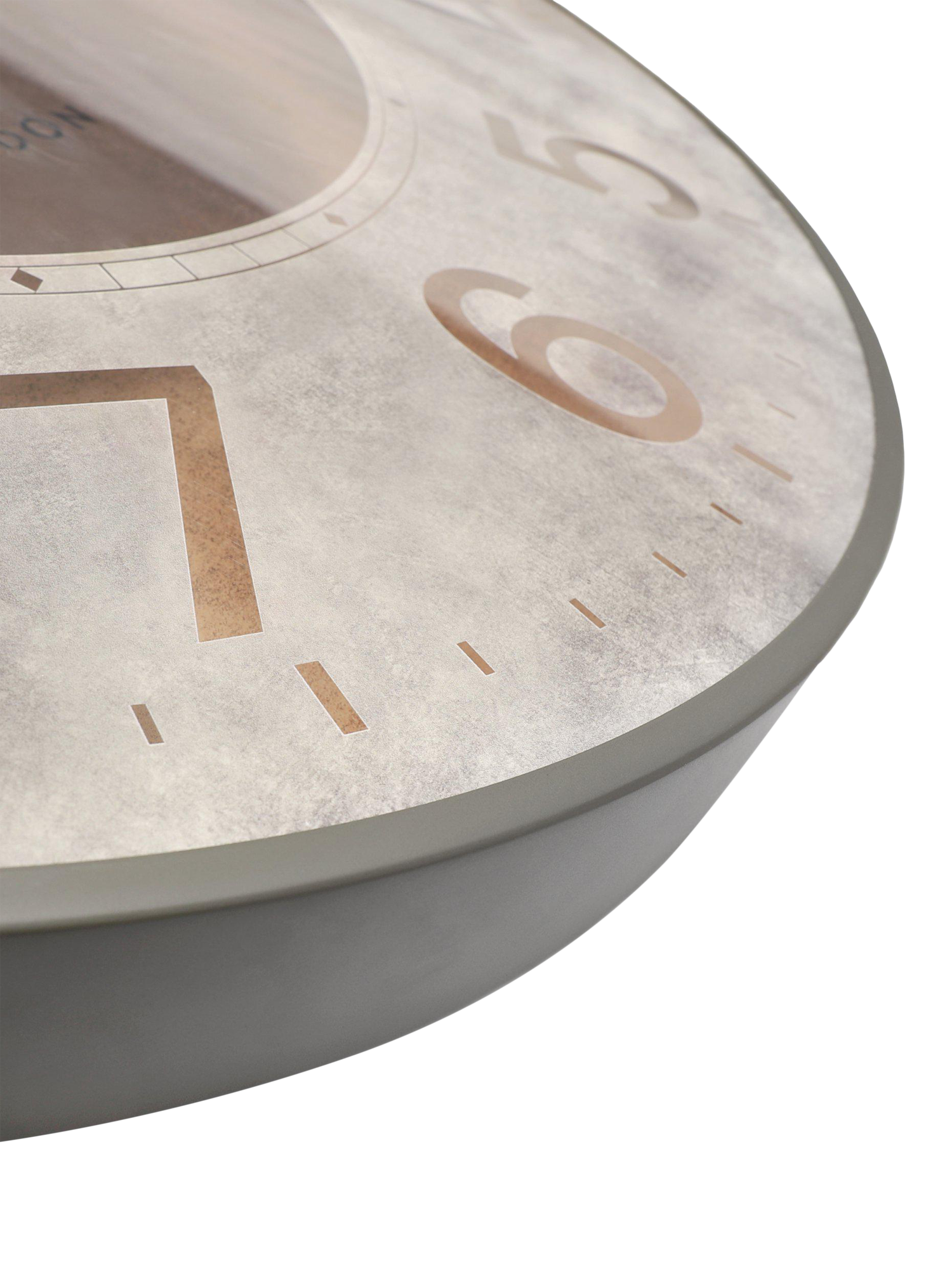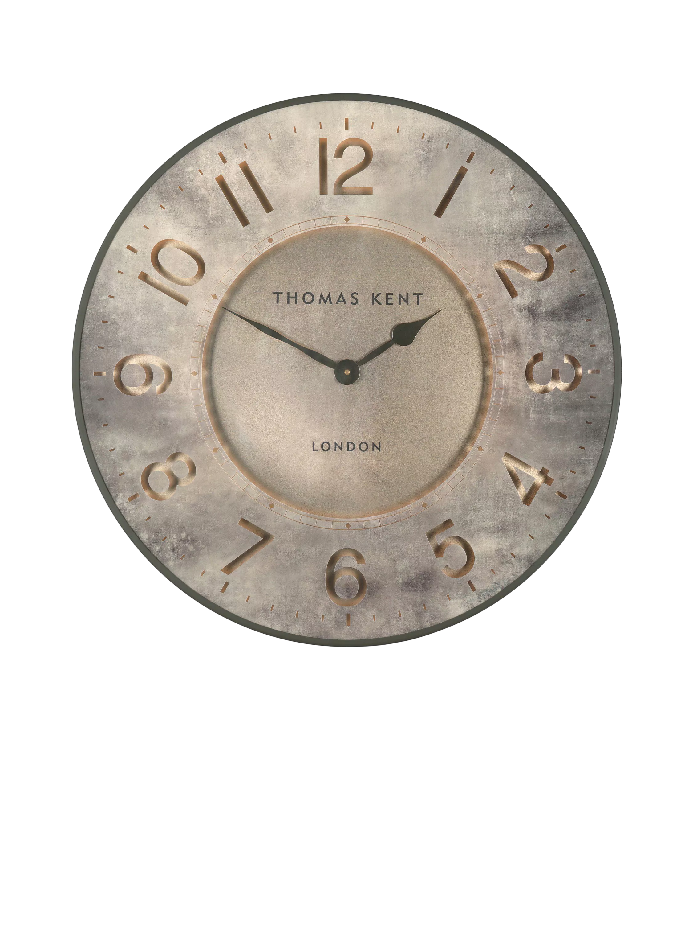 This contemporary wall clock, with a traditional twist, has a warm metallic palette and subtle stone-effect revealed on a glass dial. This unique touch elevates the etching of the modern numerals marking the hours.