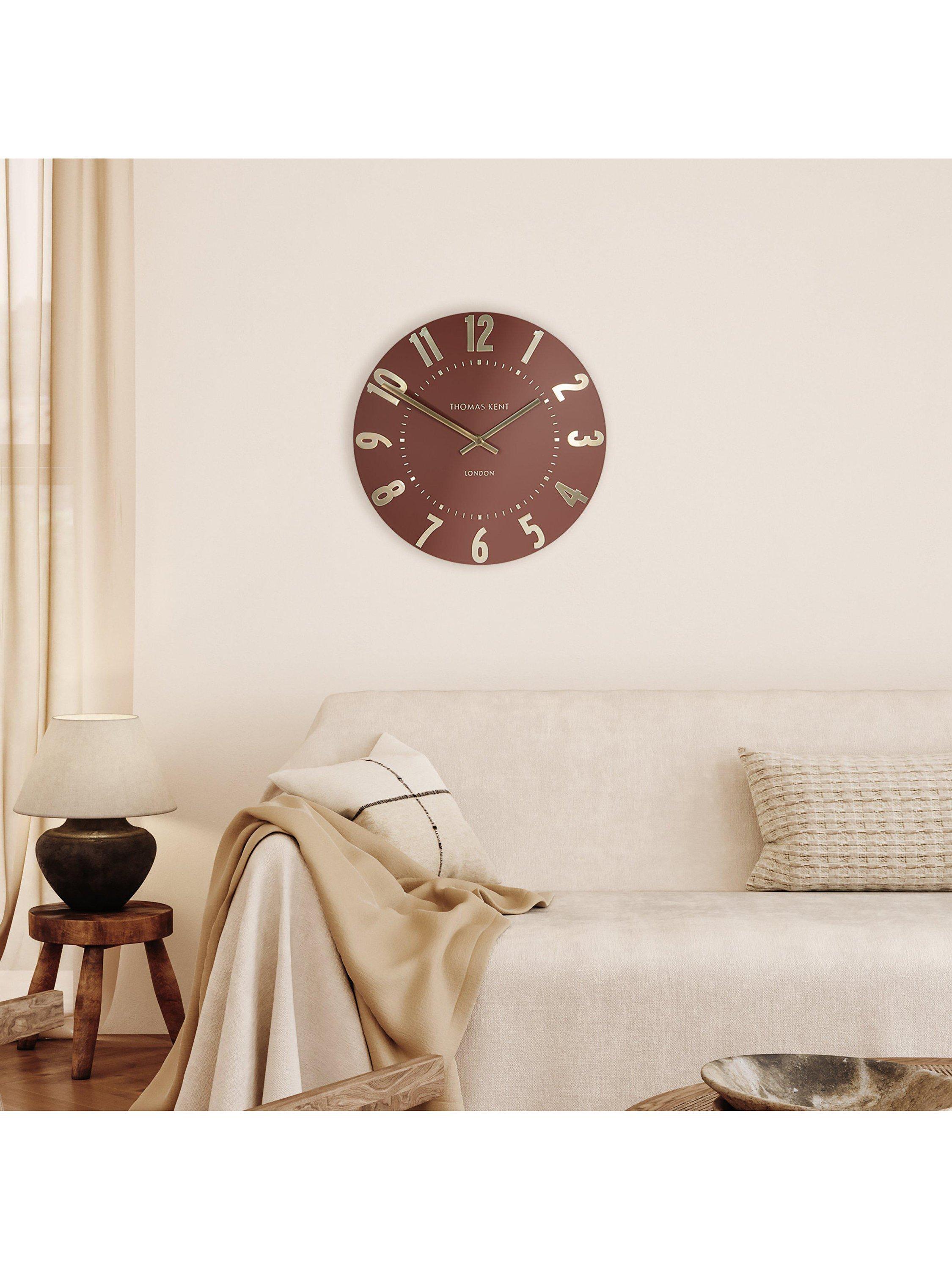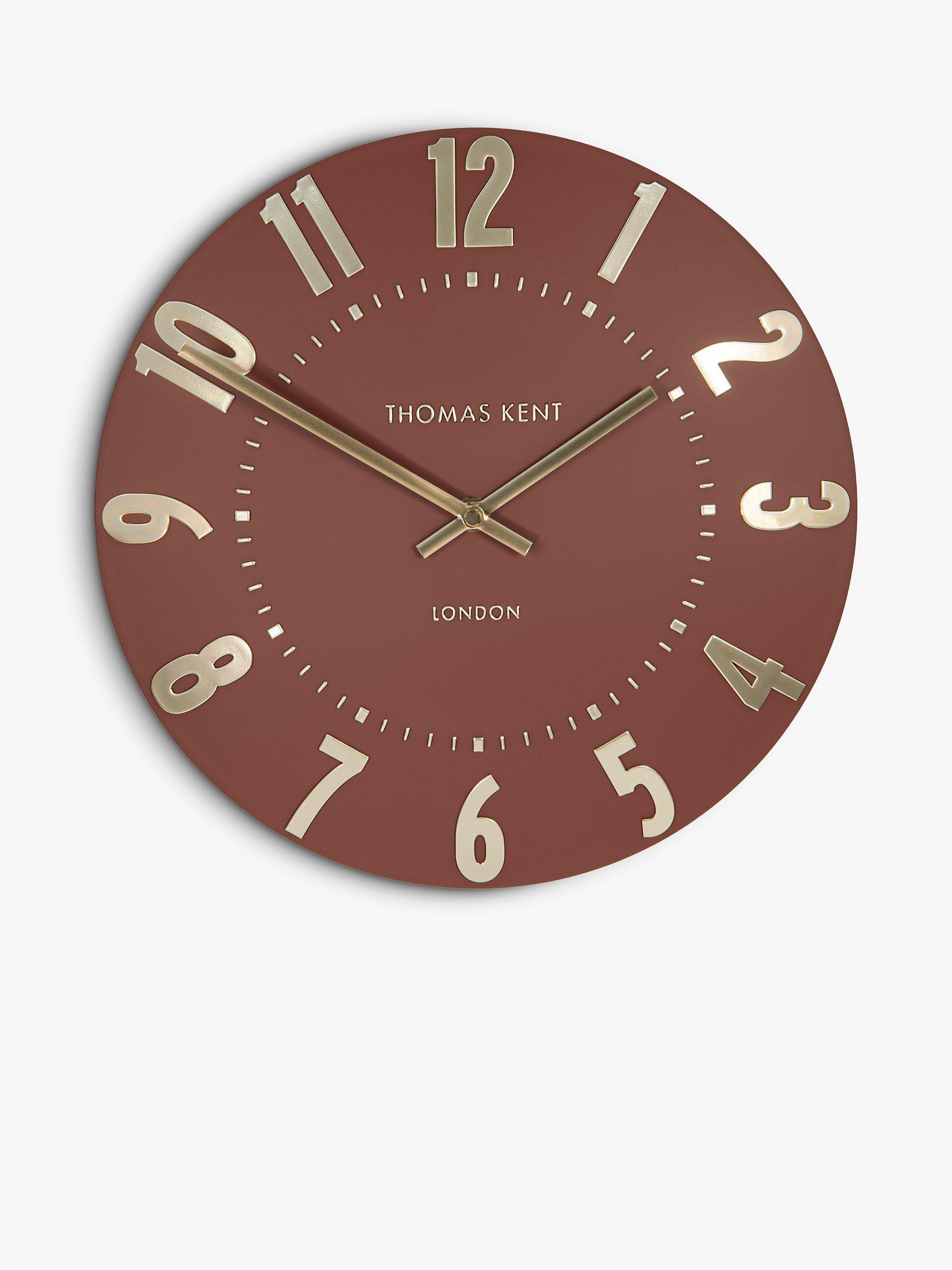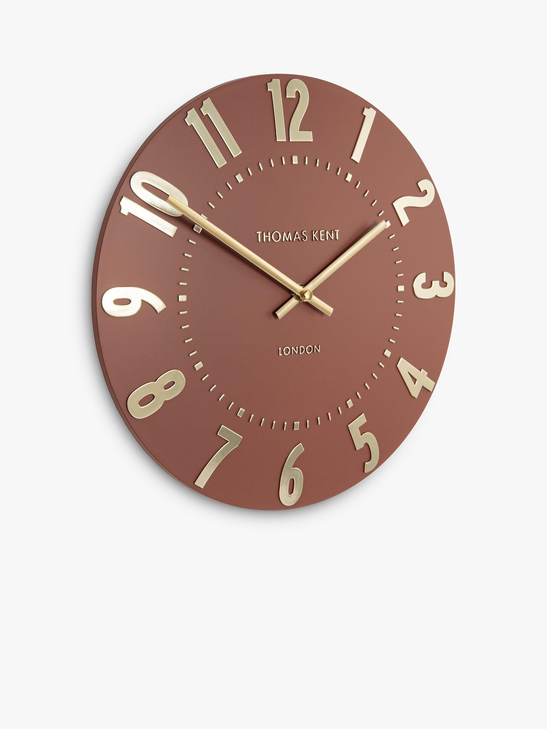 Thomas Kent's Mulberry wall clock is a contemporary elegant design with easily readable Arabic numerals in shimmering foil that contrast the understated matt finish of the clock face.